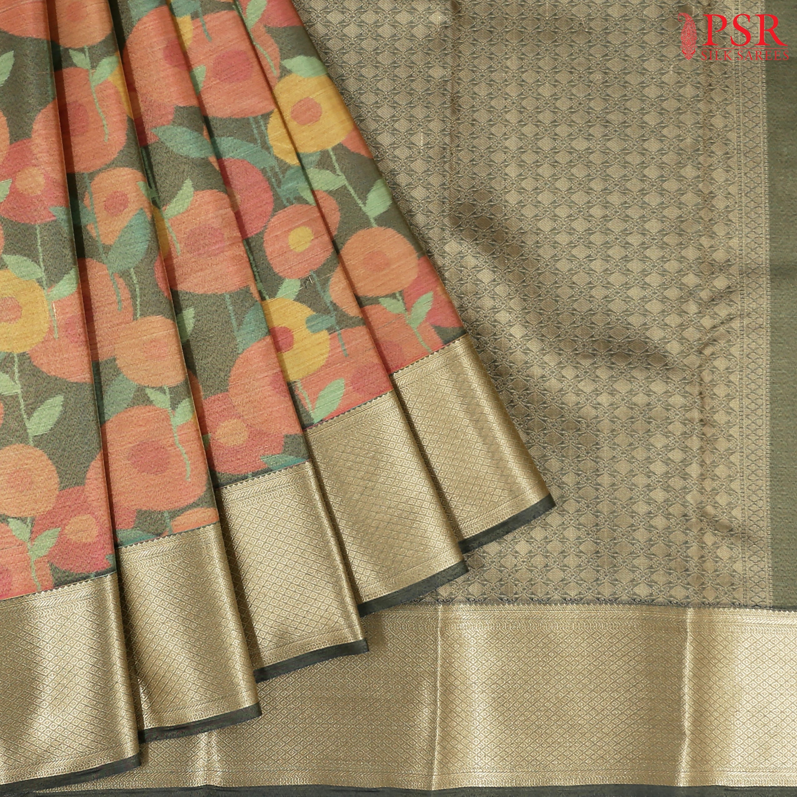 PSR Silk Sarees presents a Dark Olive colored Tissue Art Silk saree.