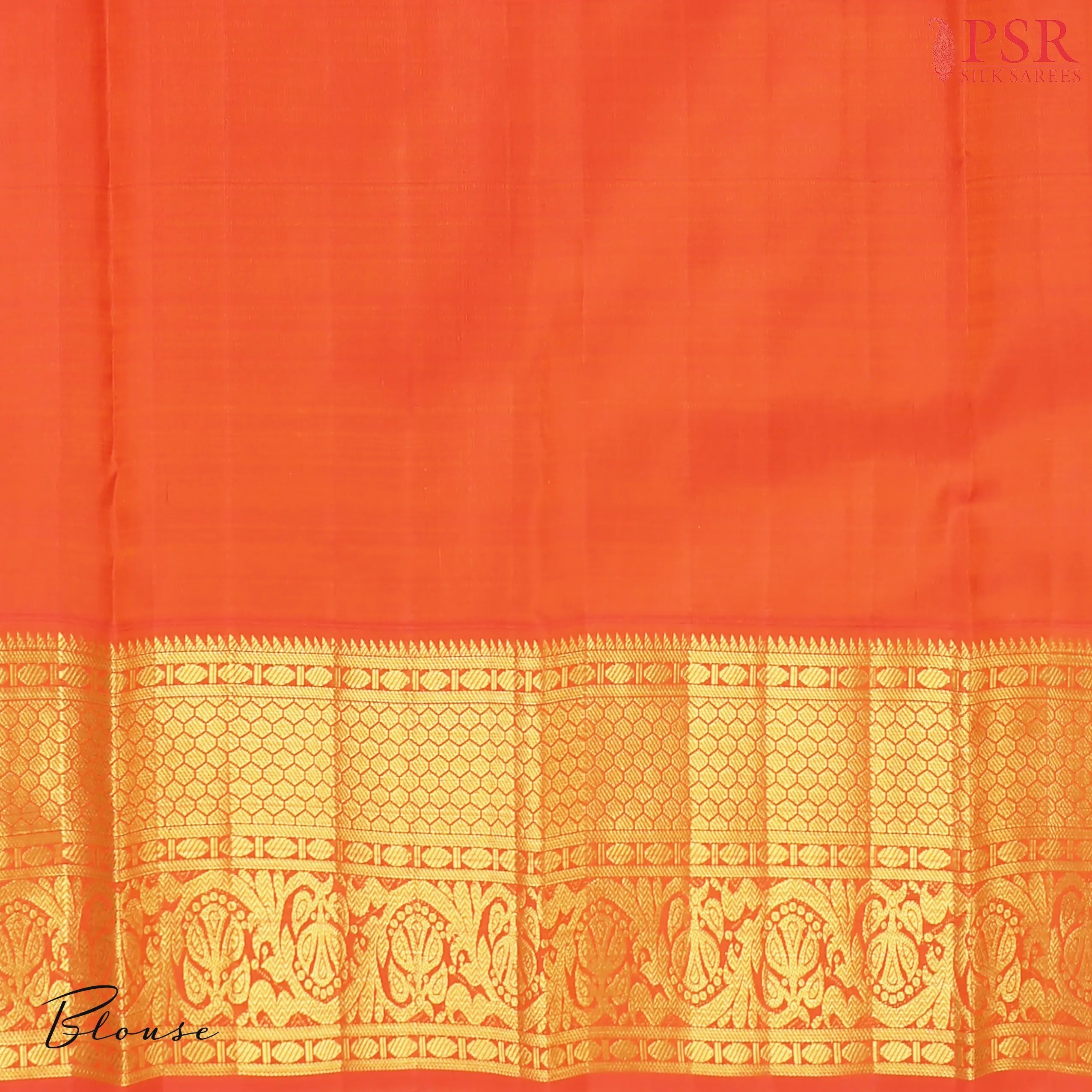 It is beautifully contrasted with a Saffron Orange pallu, highlighted by traditional zari craftsmanship, and finished with an elegant korvai border. The saree is paired with a plain Saffron Orange blouse, completing a look that exudes bridal grandeur and cultural richness.