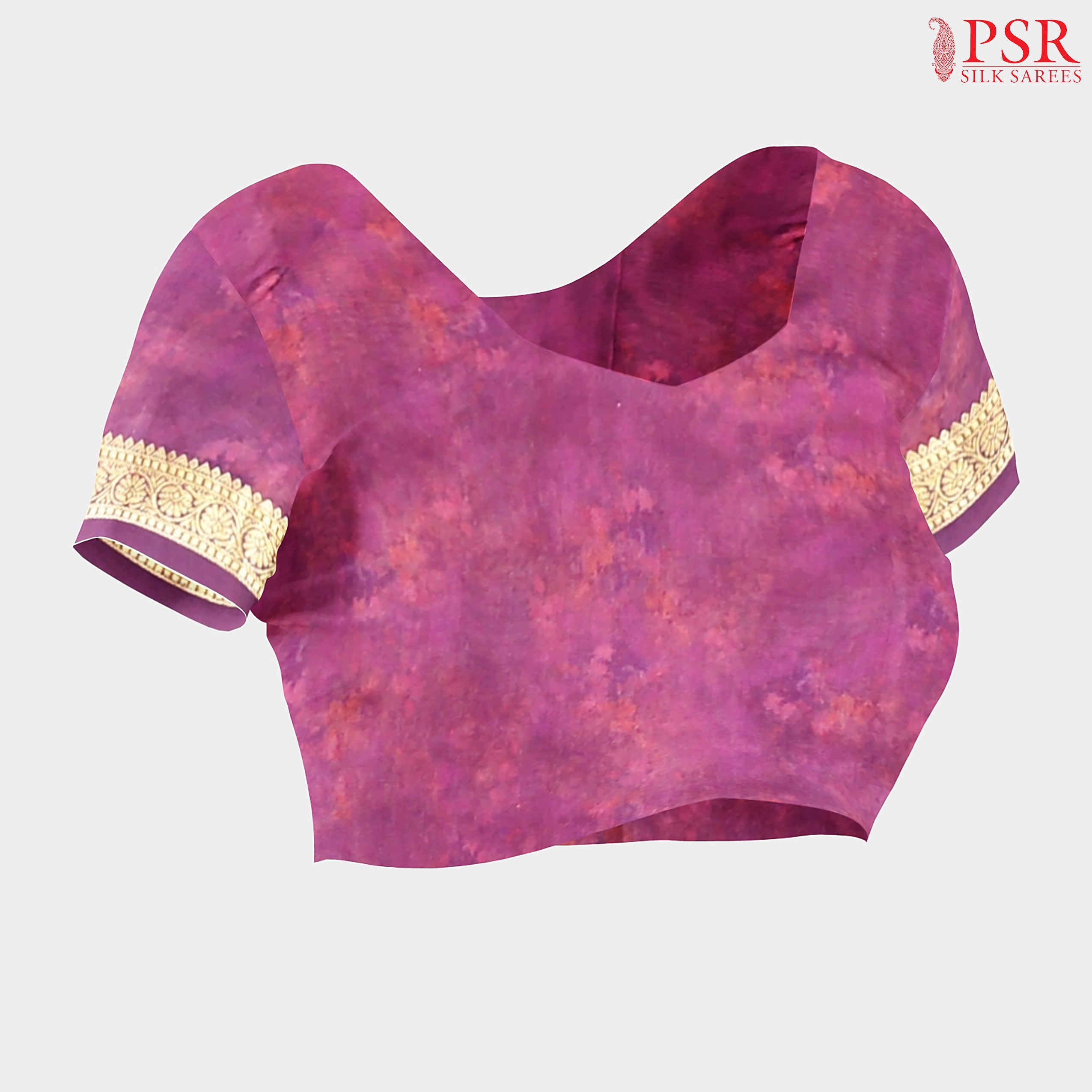The saree is adorned with an Amethyst Purple pallu and border, highlighted with intricate zari work, adding a touch of opulence to the ensemble. Complete the look with the abstract printed Amethyst Lavender blouse, harmonizing effortlessly with the rich colors and patterns of the saree.
