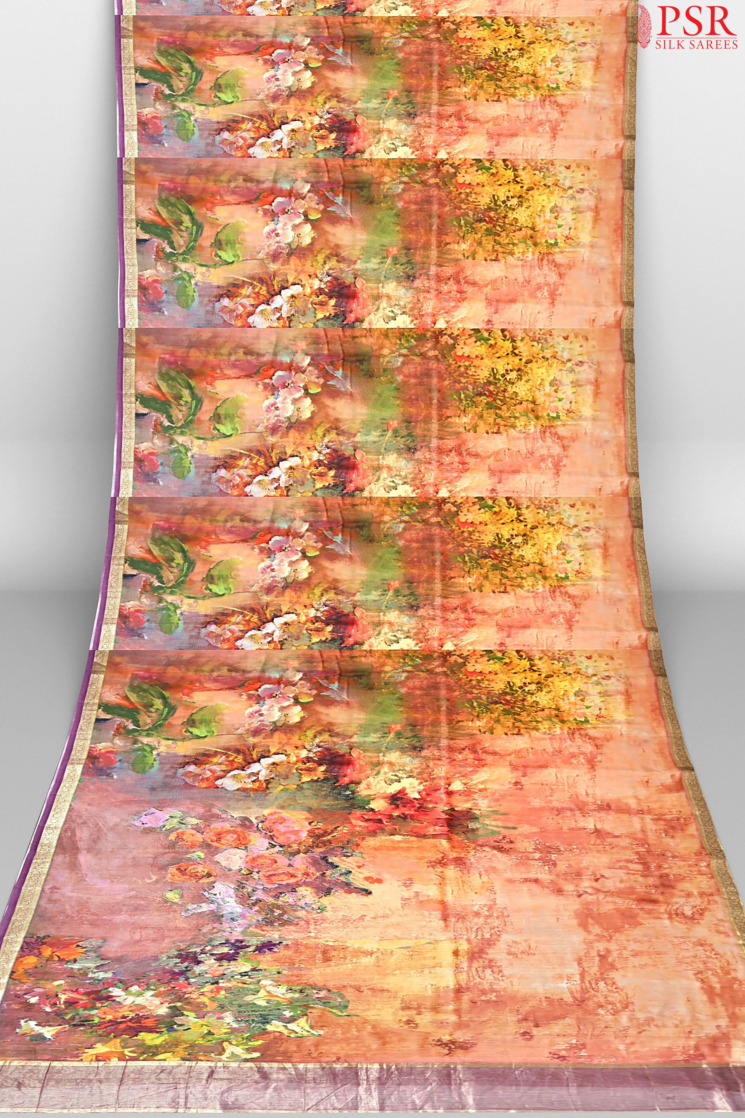 Embark on a journey of grace and sophistication with PSR Silks' Floral Orange and Amethyst Lavender Chiniya Silk saree. This exquisite saree features stunning artistic floral prints, creating a visual masterpiece that reflects both tradition and contemporary elegance.