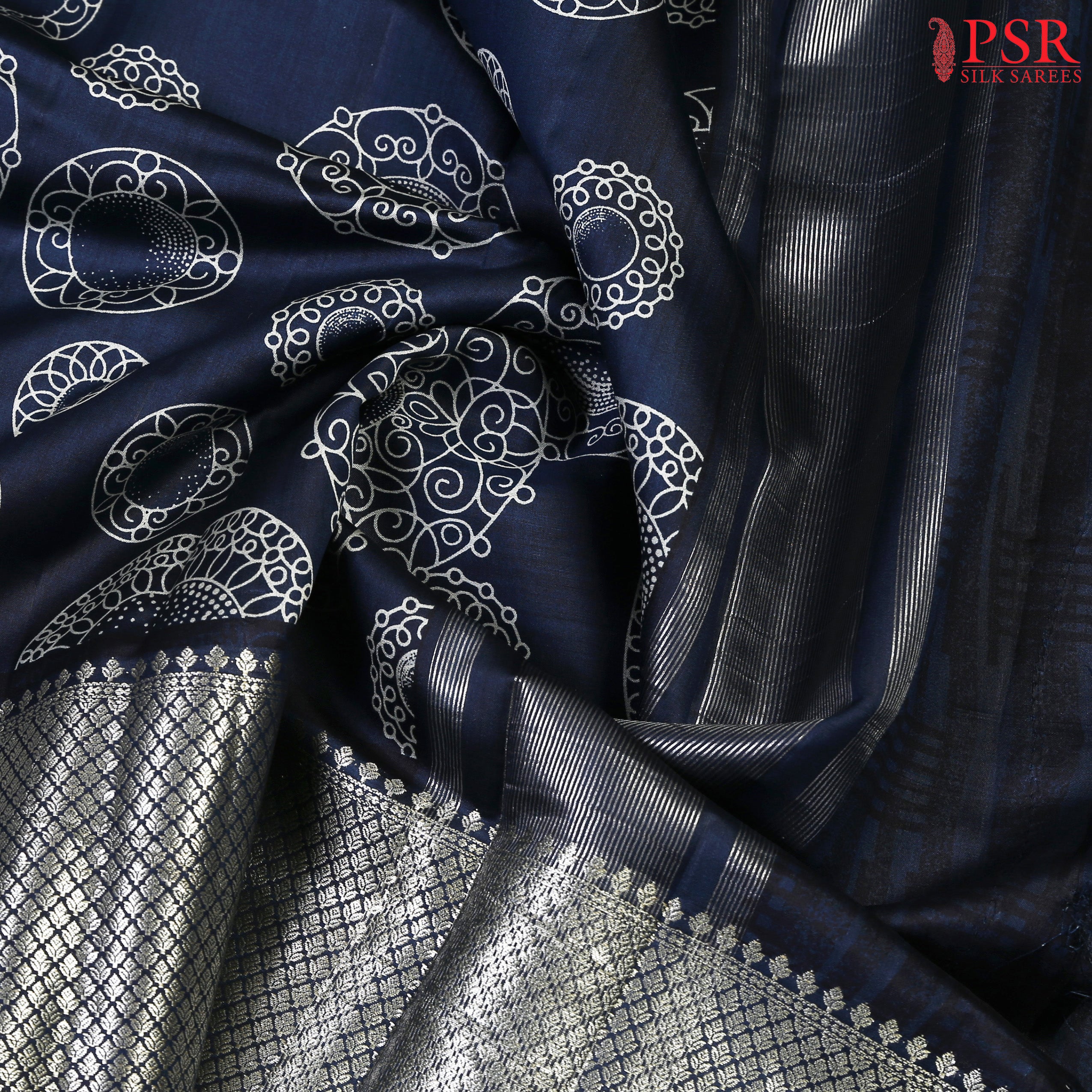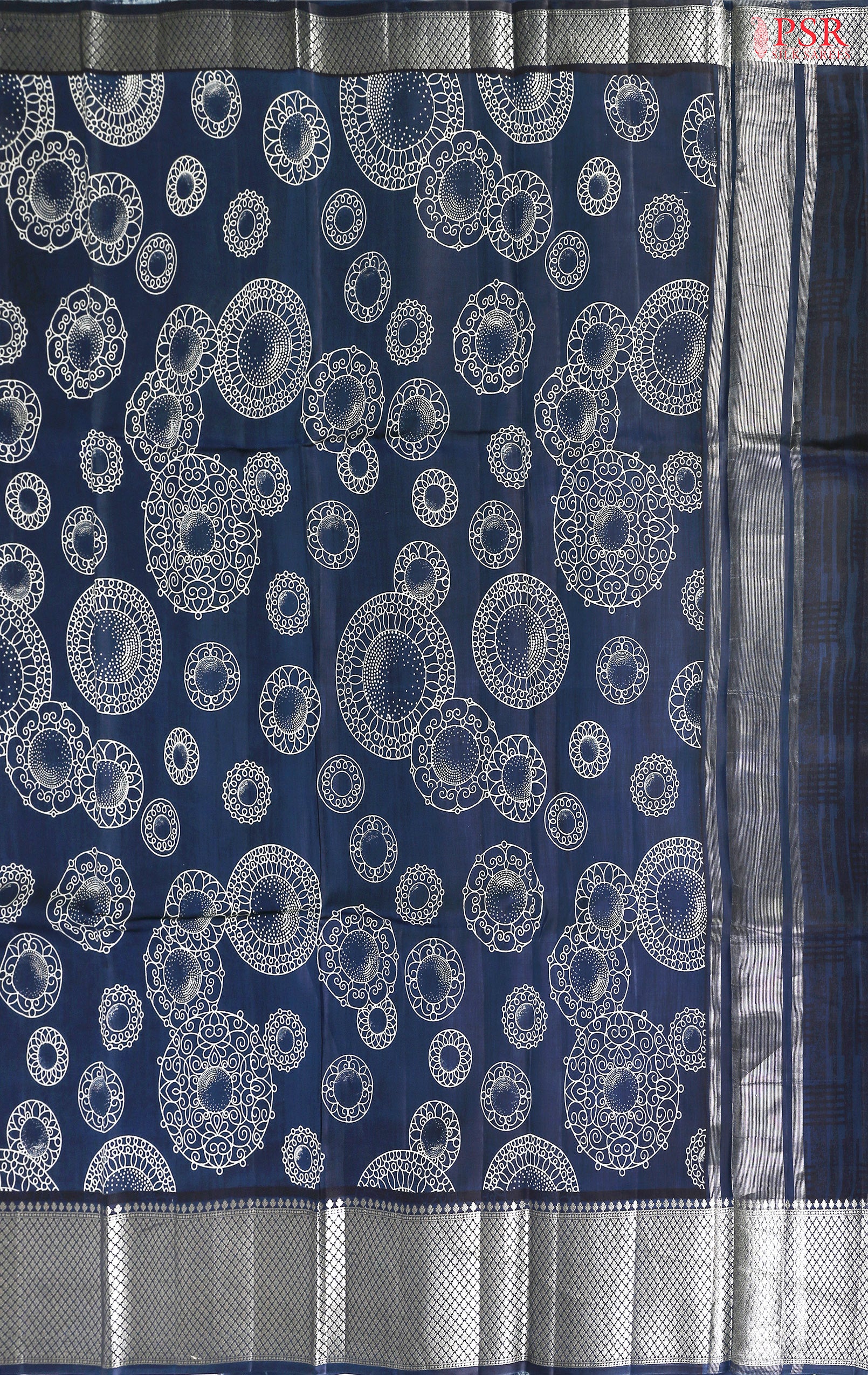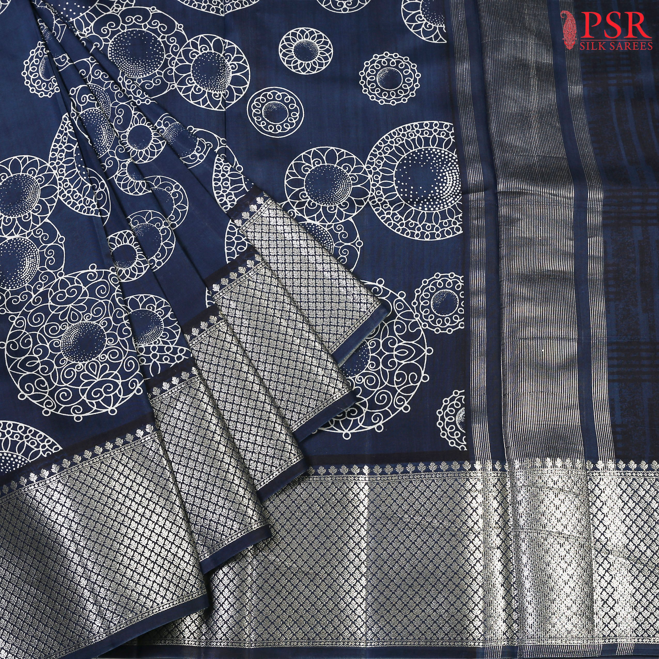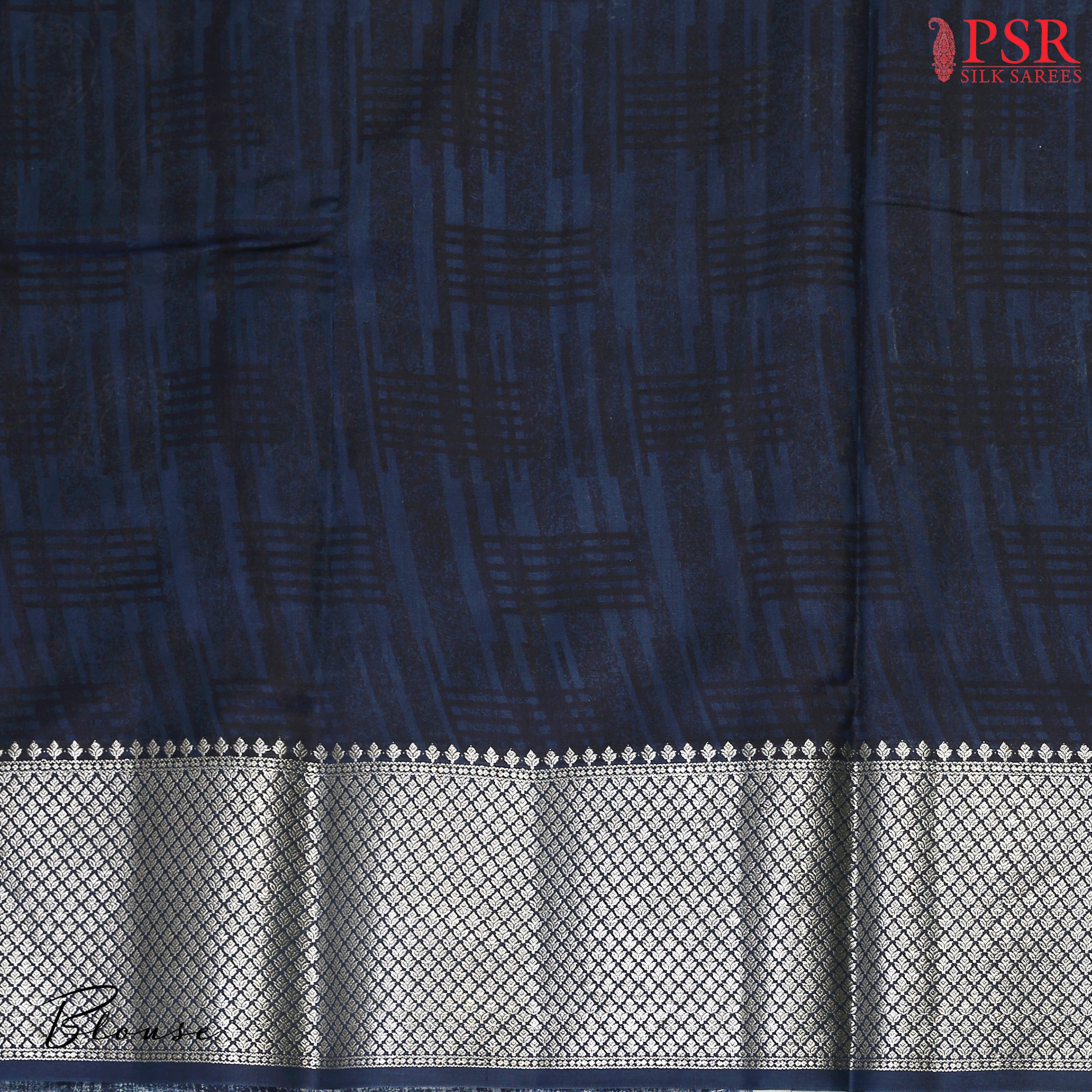 PSR Silks presents an alluring Navy Blue Chiniya Silk saree, exuding sophistication and grace. This timeless piece features an elegantly designed white rangoli pattern, adding a touch of tradition and charm to its allure.