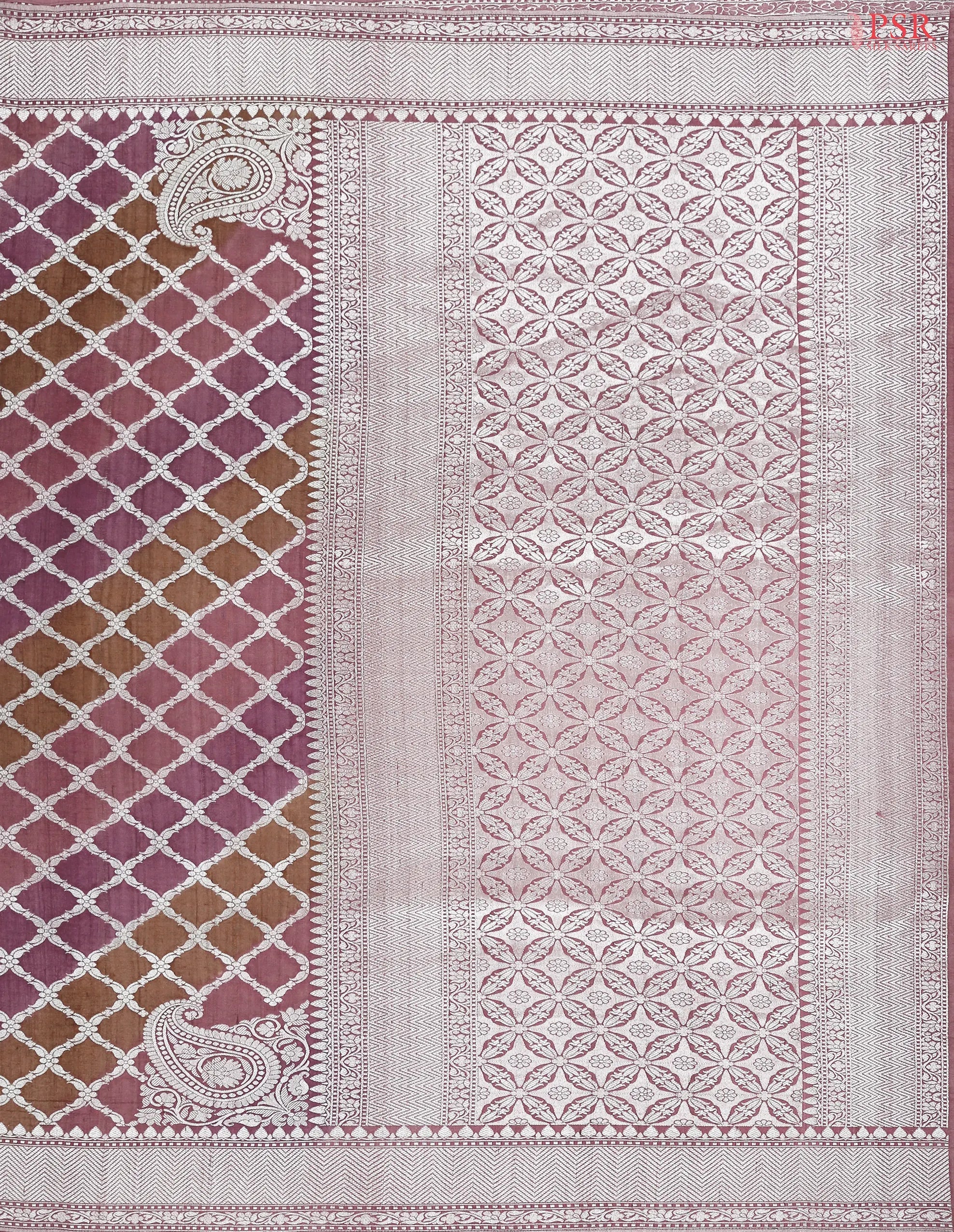 The saree features tricolor diagonal stripes enriched with a delicate silver zari lattice pattern, adding a subtle yet striking elegance. A rich and traditional zari work pallu with matching border enhances its regal appeal, while a plain Dusty Rose blouse completes the ensemble with understated sophistication.