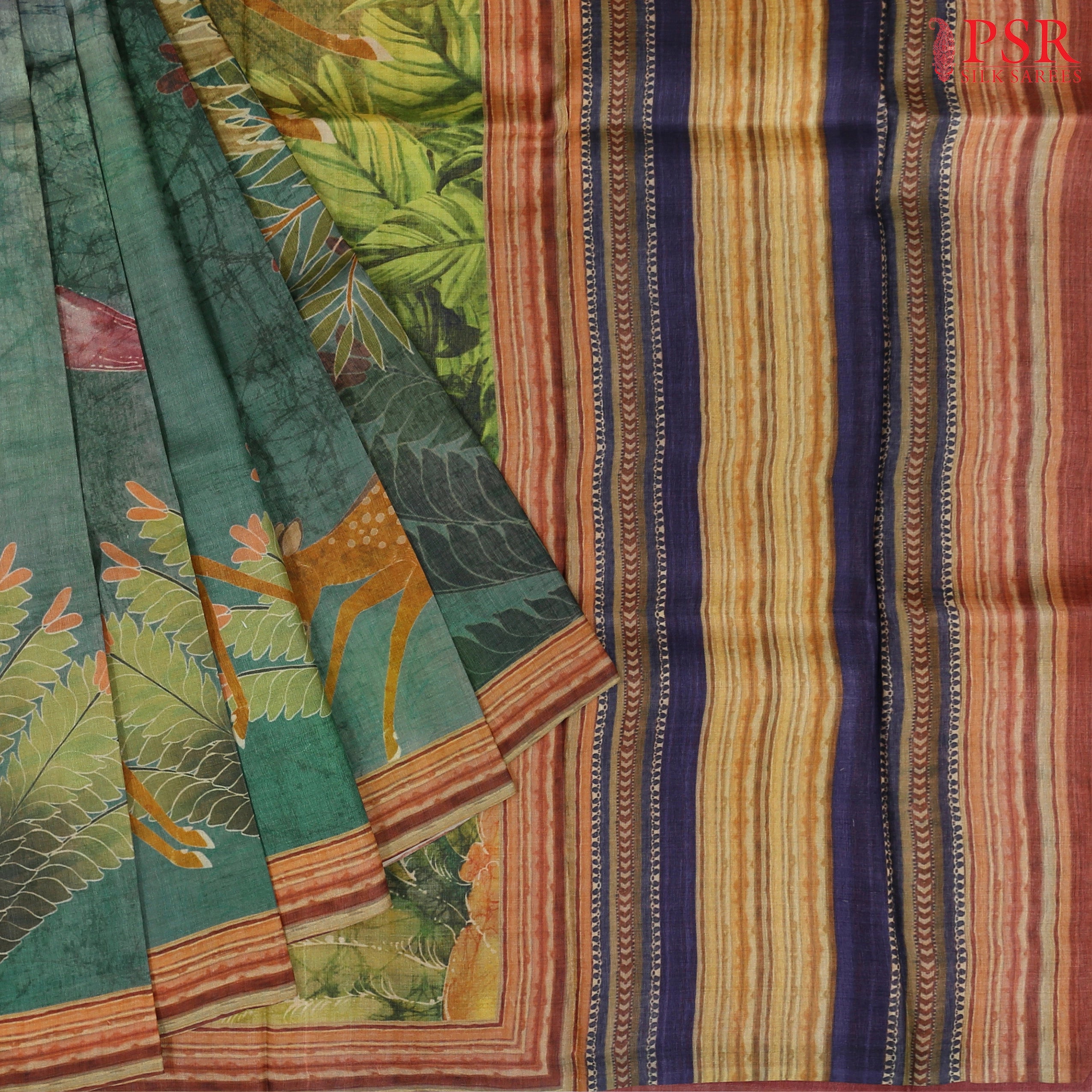 Jungle Green & Olive Kadhi Tussar Silk Saree with Vintage Prints – PSR Silk Sarees