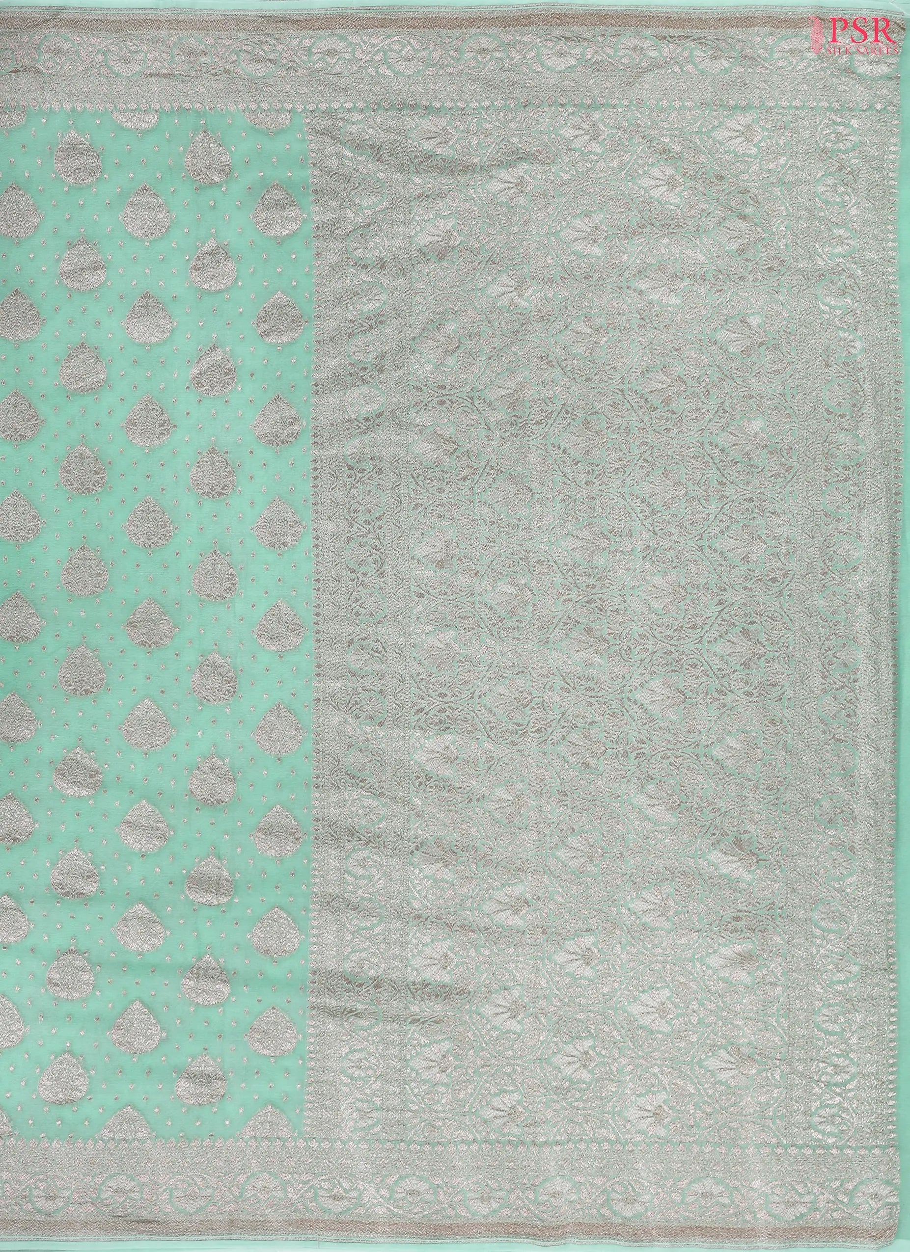 A Light Mint Green Georgette Silk Saree that perfectly blends delicate beauty with traditional elegance.