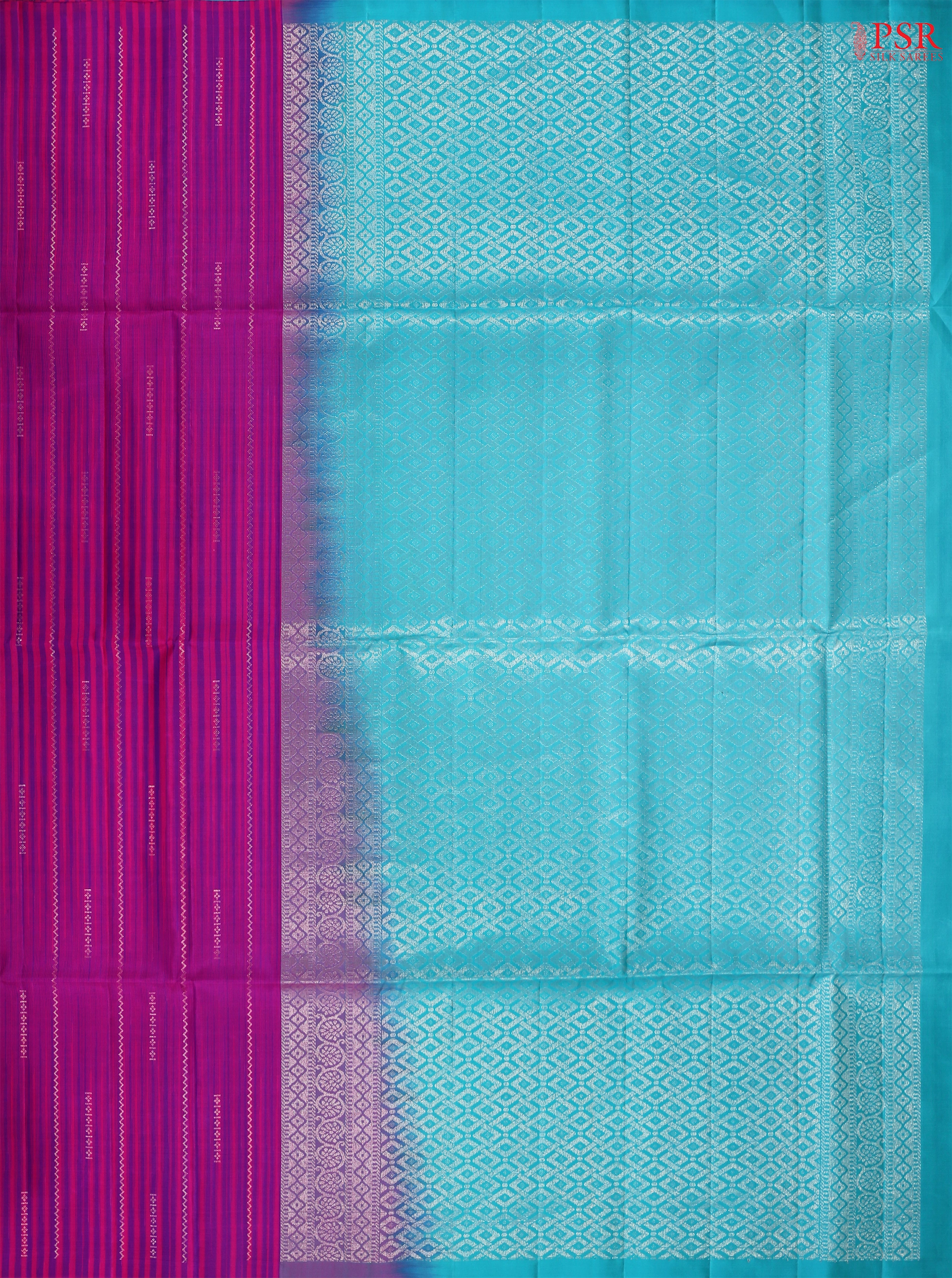 PSR Silk Sarees presents a vibrant Magenta Pink & Purple Soft Silk Saree, gracefully paired with a striking Turquoise Blue contrast. This stylish borderless drape features an elegant double-colored stripes pattern enriched with delicate zari weaves, creating a perfect blend of modern style and traditional artistry. A contrasting Turquoise Blue pallu with rich traditional zari work adds grandeur, while the plain Turquoise Blue blouse completes the ensemble with simplicity and charm. Ideal for festive occasions, weddings, and cultural celebrations, this saree reflects elegance in every fold.