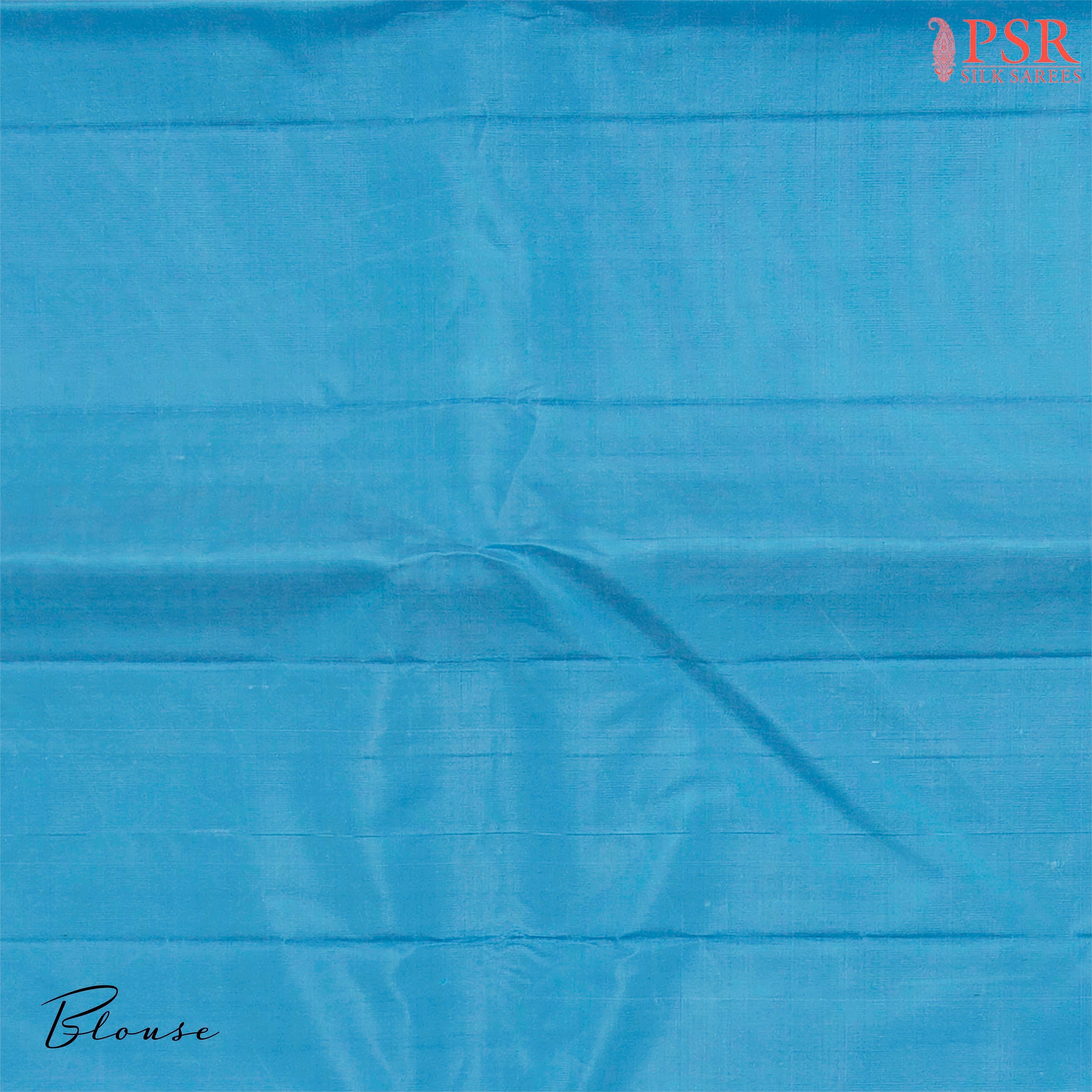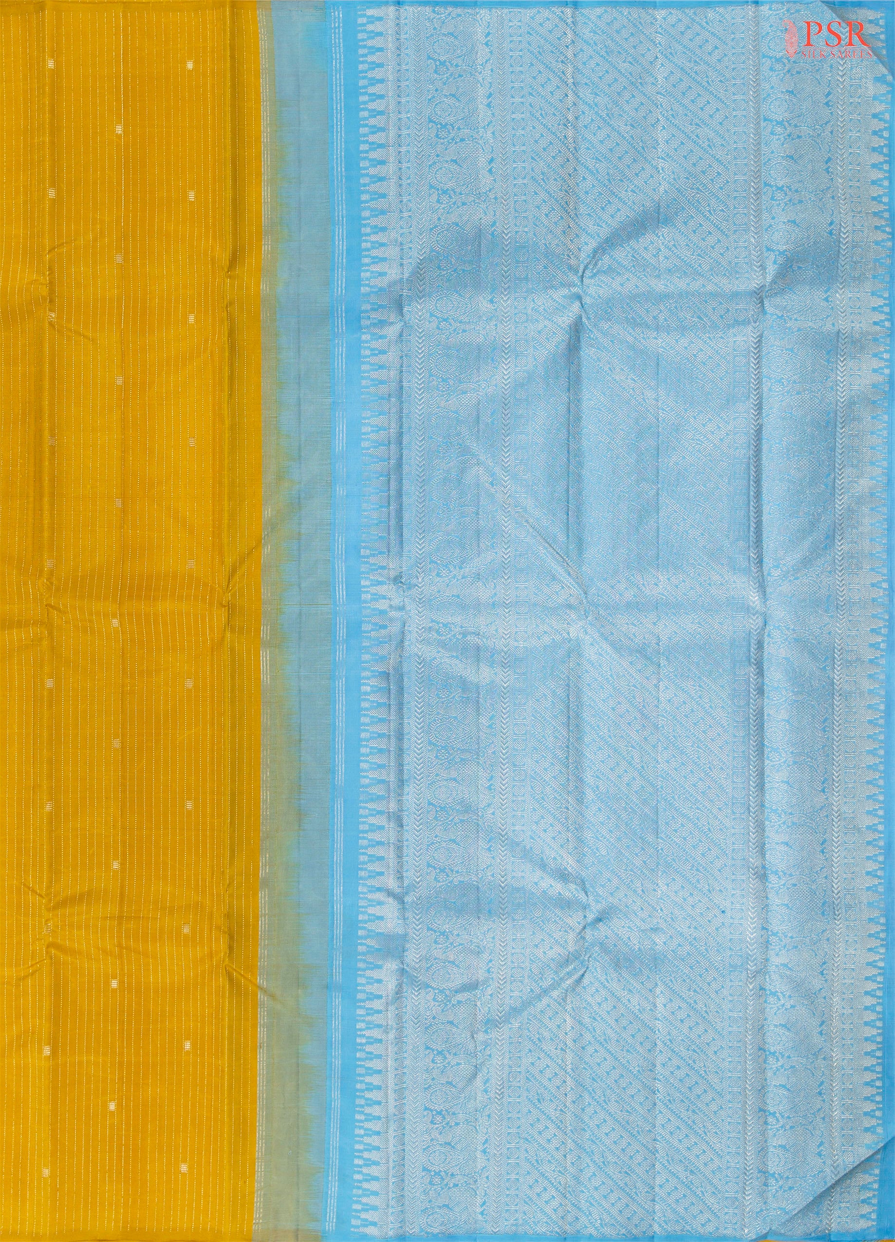 PSR Silk Sarees introduces a stunning Mustard Yellow Kanchipuram Silk Saree, paired with a contrasting Sky Blue hue from the elegant "Smartika Kanjivaram" collection. This graceful borderless saree showcases delicate zari stripes adorned with small zari motifs, adding a subtle shimmer. It is perfectly complemented by a Sky Blue traditional zari work pallu and a plain Sky Blue blouse, creating a refined and sophisticated ensemble.
