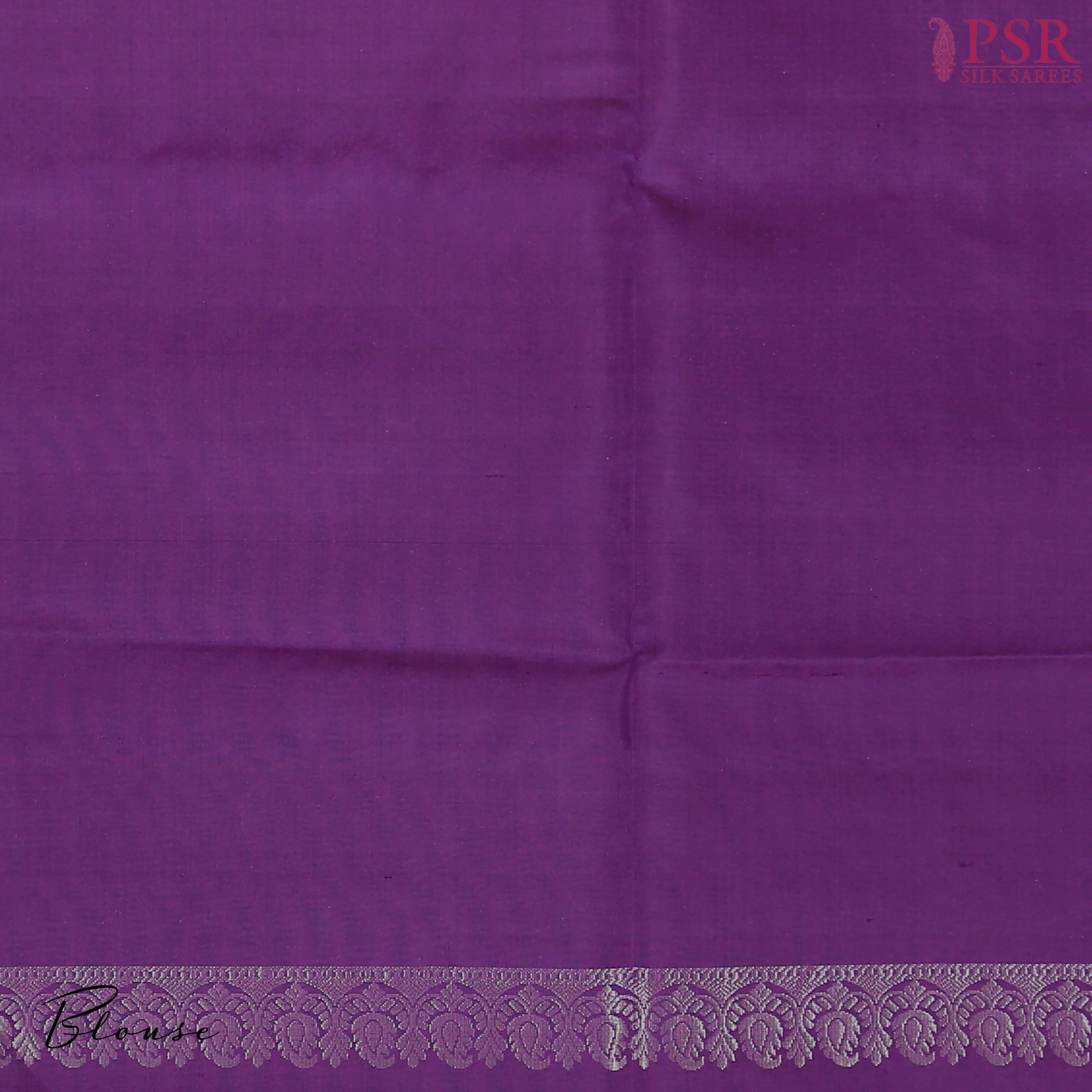 Make a striking statement with this luxurious Parakeet Green Soft Silk Saree from PSR Silks, beautifully paired with a vibrant Dark Magenta Purple pallu. This elegant plain border saree features an intricate silver zari quatrefoil jacquard pattern, offering a contemporary twist to traditional design. The contrasting pallu, adorned with rich silver zari work, adds an extra layer of sophistication. Complete the look with the sleek plain Dark Magenta Purple blouse, perfect for special occasions and festivities.
