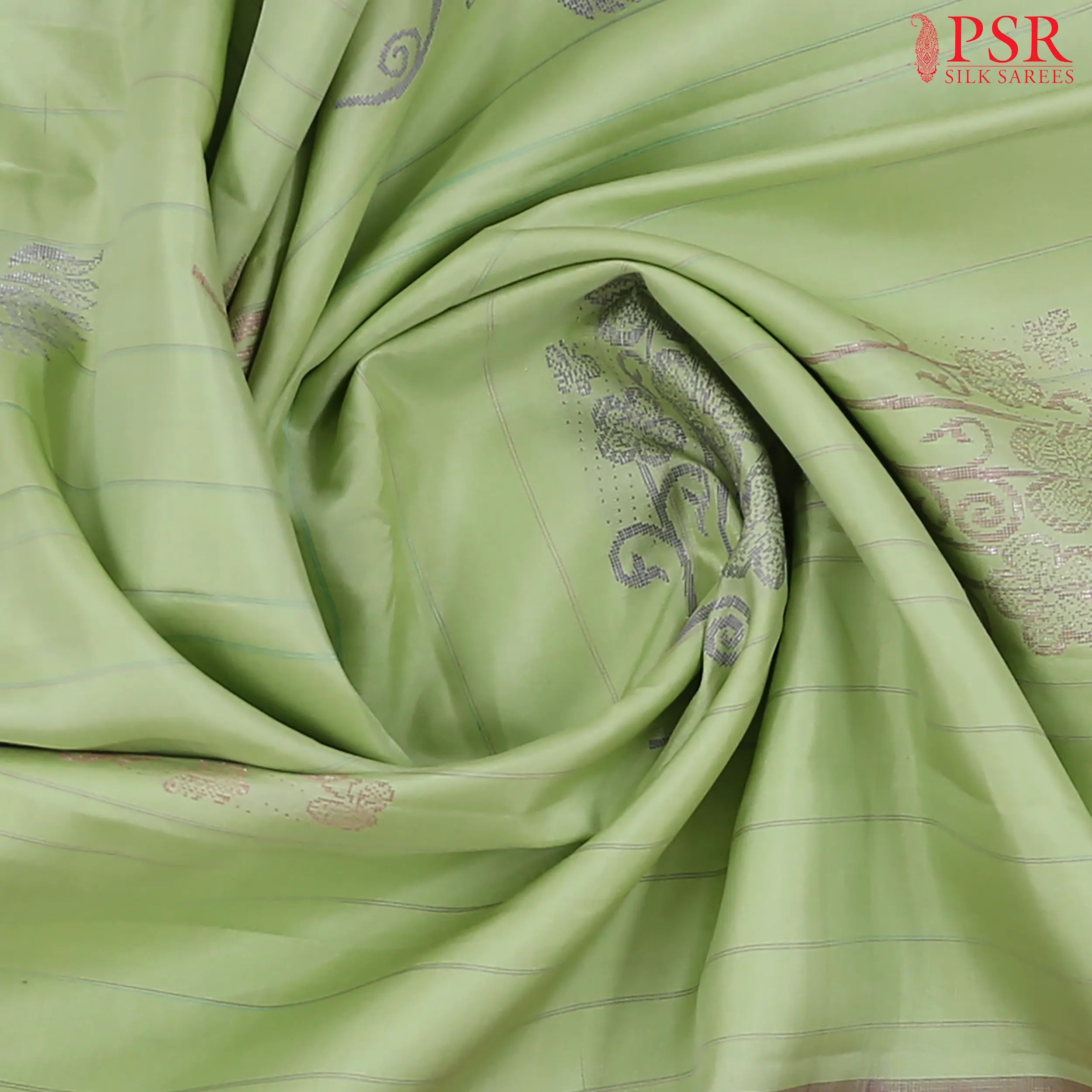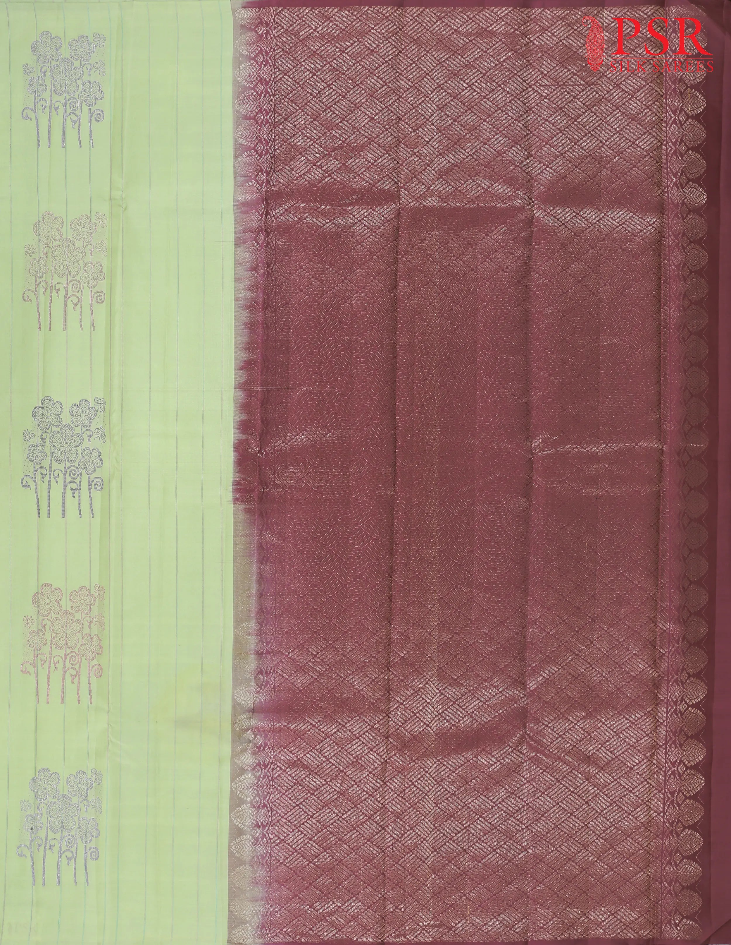 PSR Silk Sarees presents a Pastel Pistachio  Kanchipuram Silk saree paired with a rich Rosewood combination, offering a perfect blend of tradition and artistic elegance.
