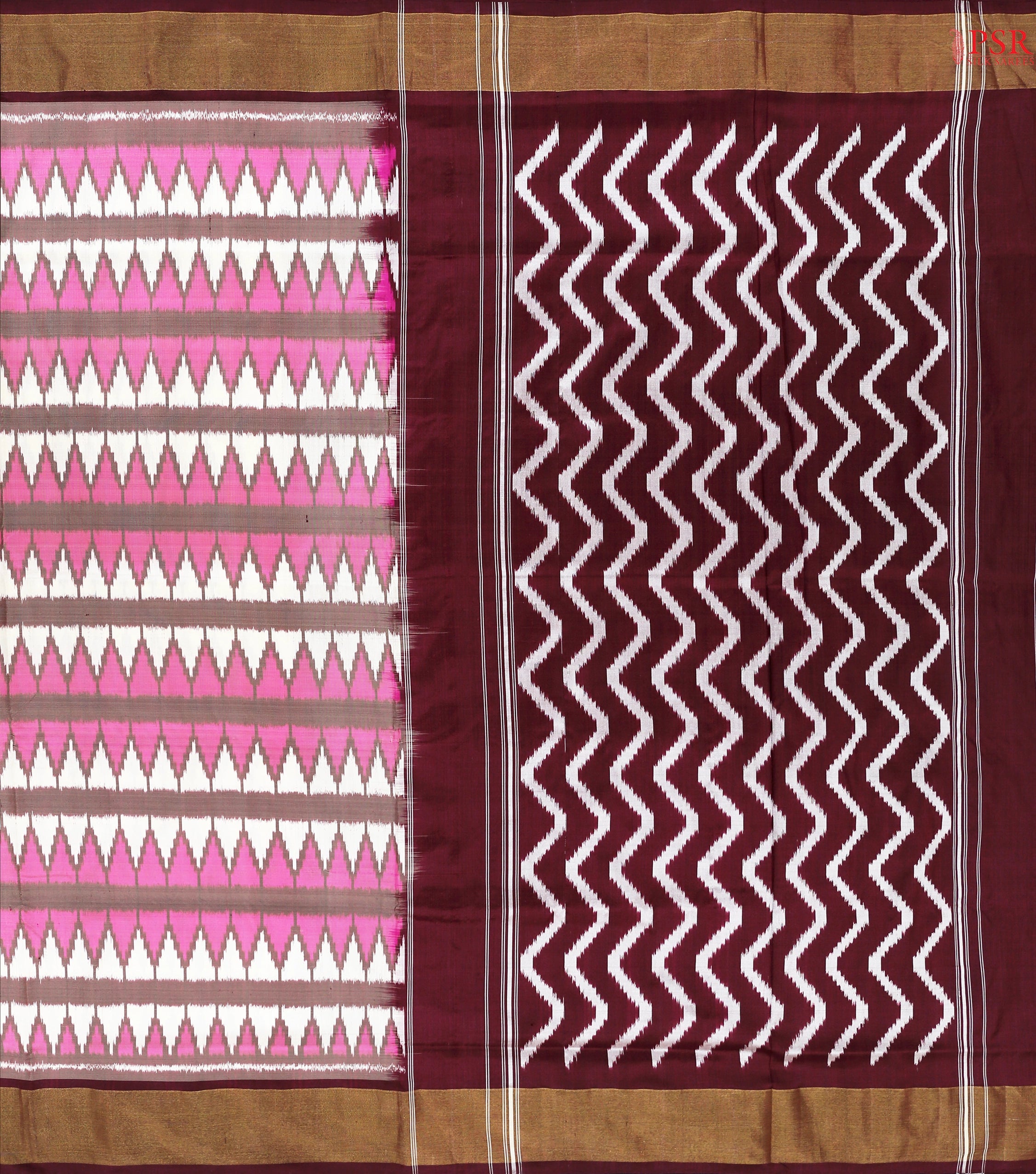 PSR Silk Sarees presents an exquisite Pink & Beige Pochampally Silk Saree with a rich Rosewood Brown combination, radiating timeless grace and ethnic allure.