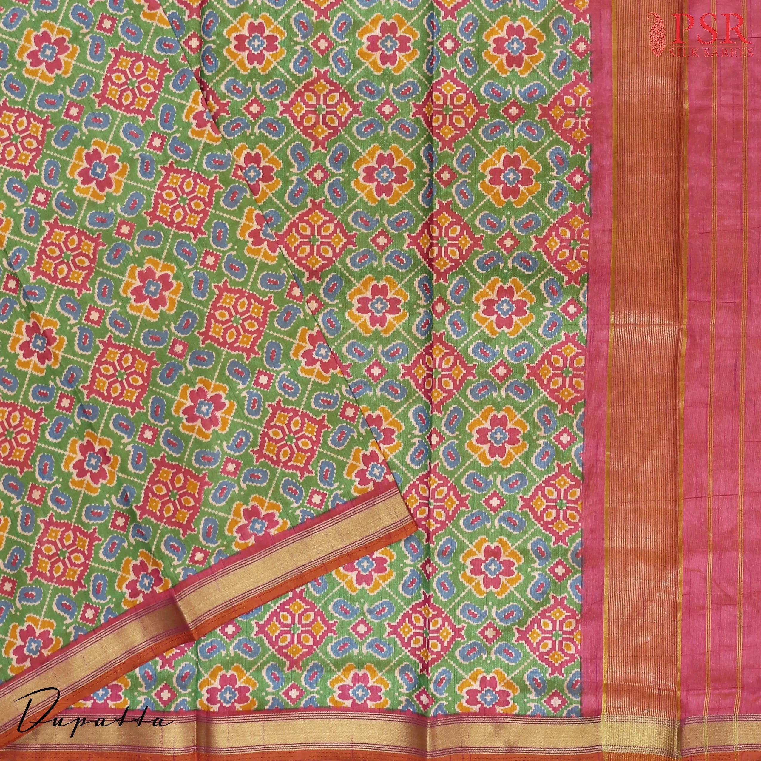 PSR Silks presents Pink Soft Patola Semi Silk Dress Material with combination of Green color.