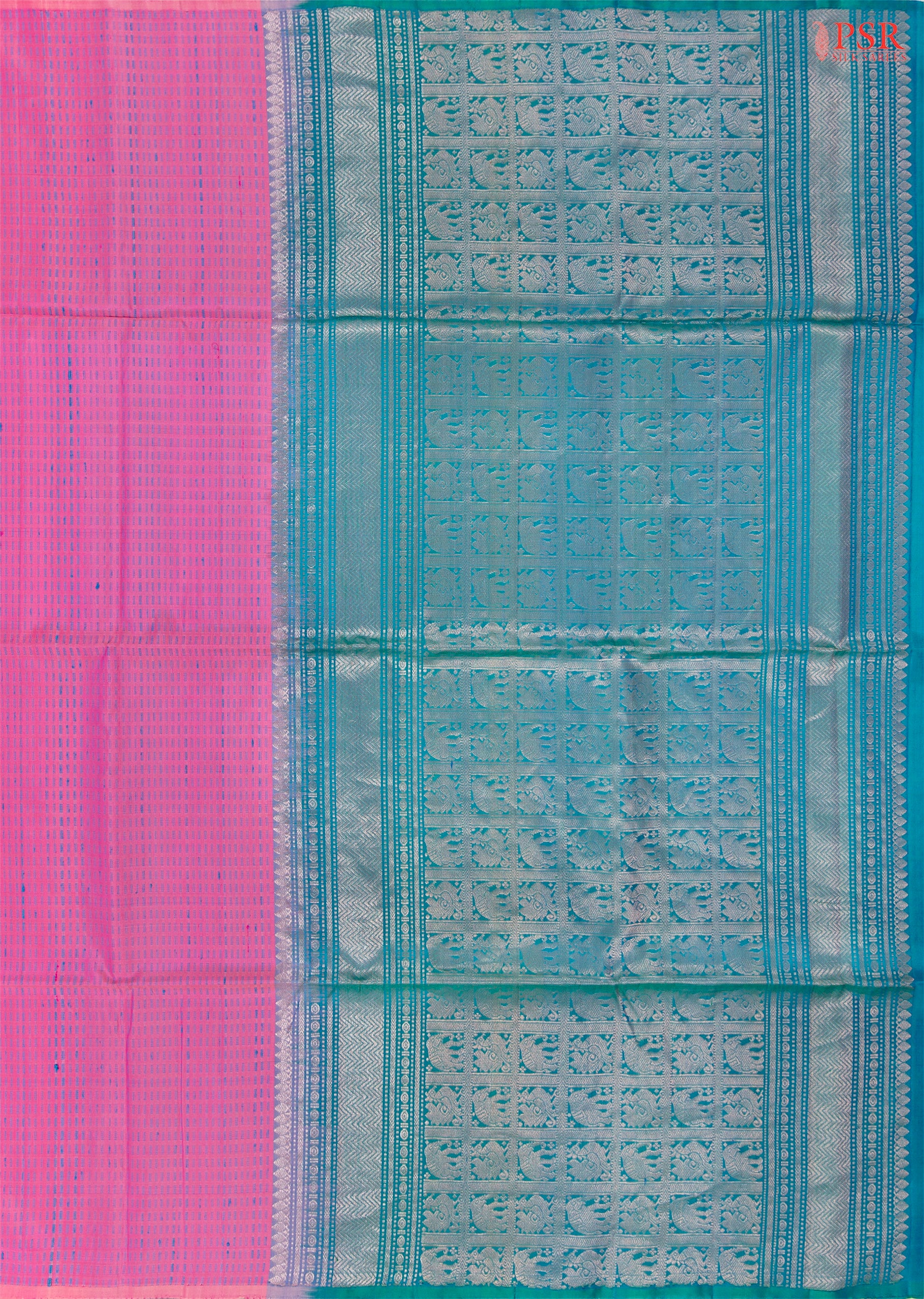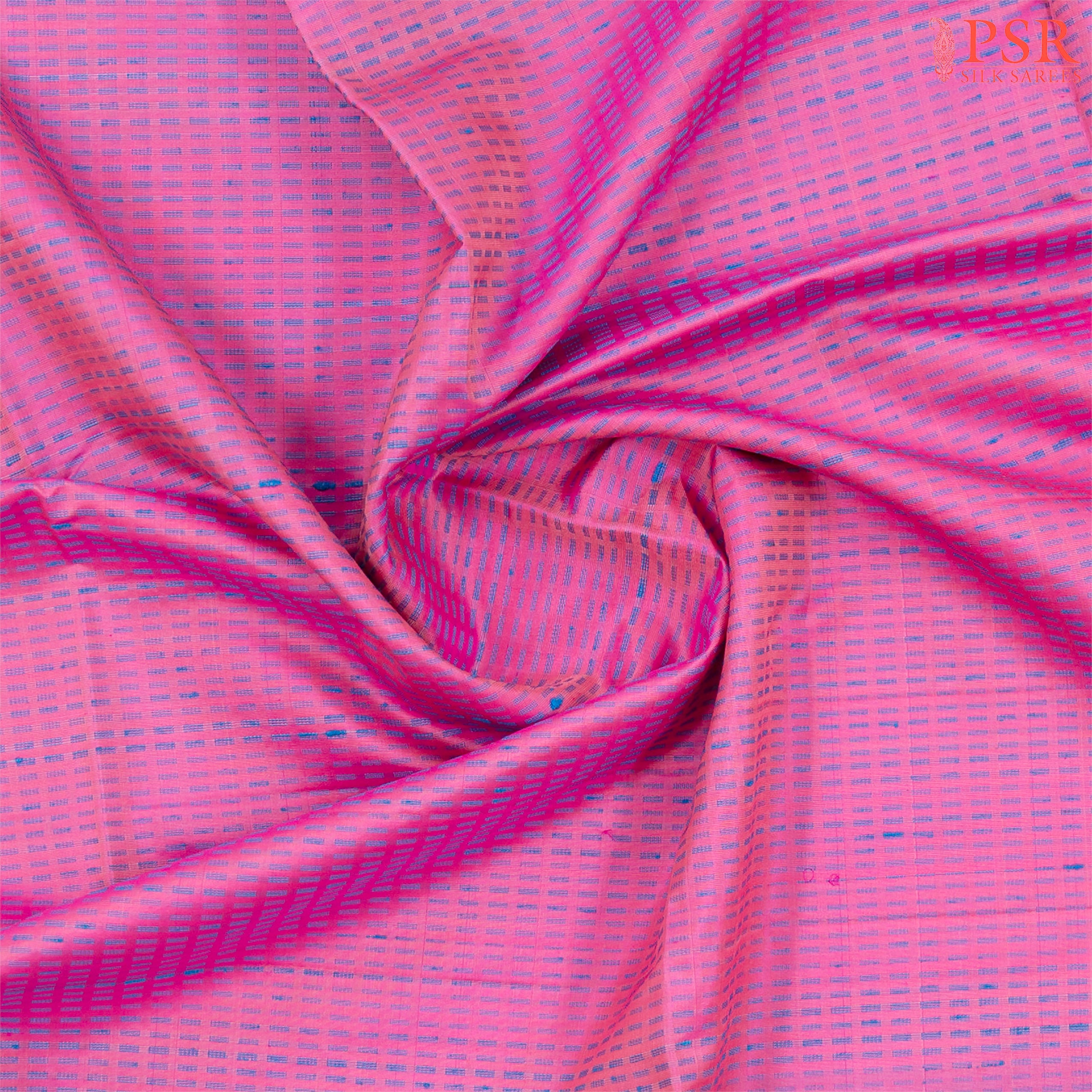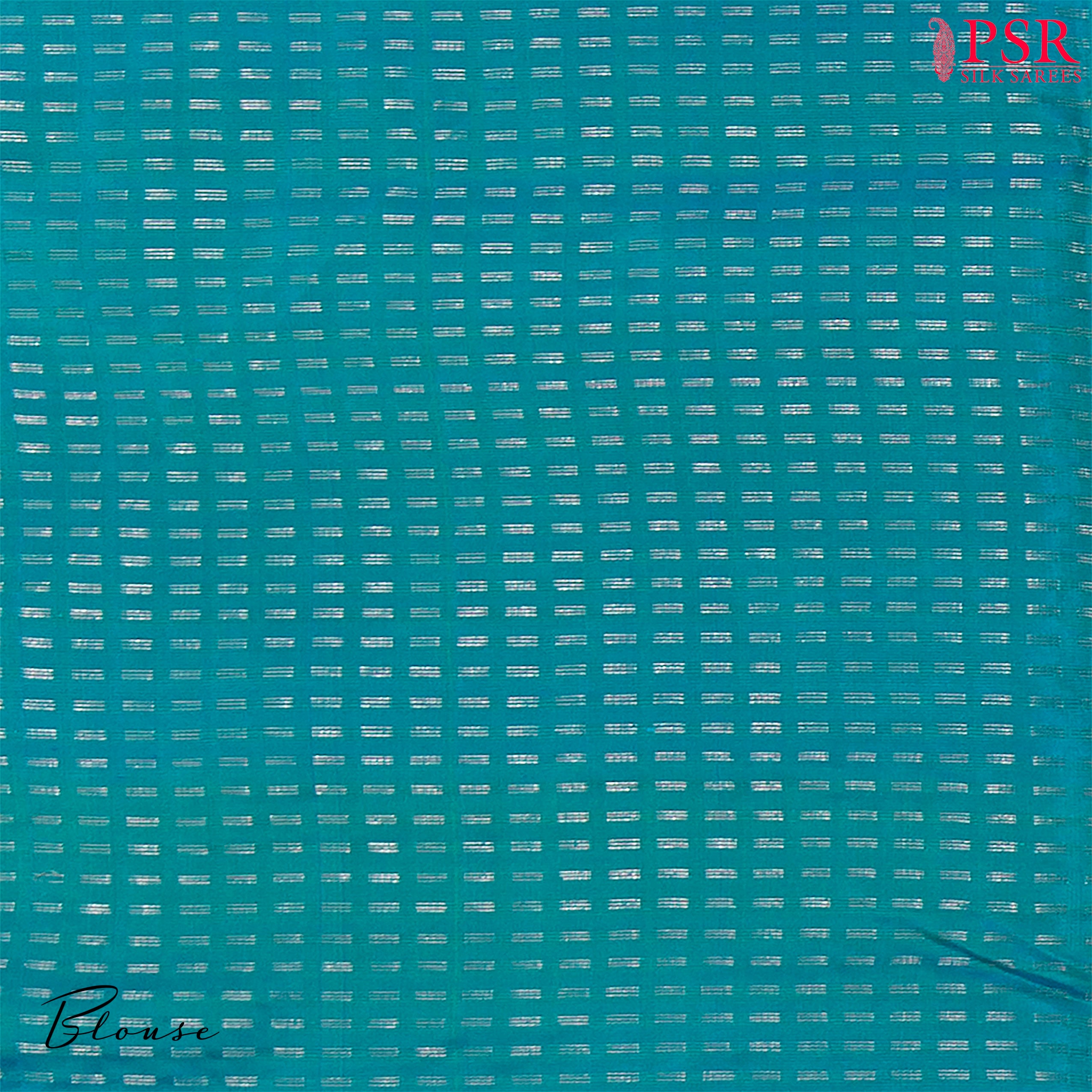 PSR Silk Sarees presents a stylish Pink Soft Silk Saree paired with a striking Aqua Lake contrast. This elegant borderless saree features fine thread jacquard striped patterns, giving it a contemporary yet traditional look. The saree is complemented by a rich Aqua Lake pallu adorned with traditional copper zari work. It is attached with an Aqua Lake blouse featuring copper zari stripes, completing this sophisticated ensemble.