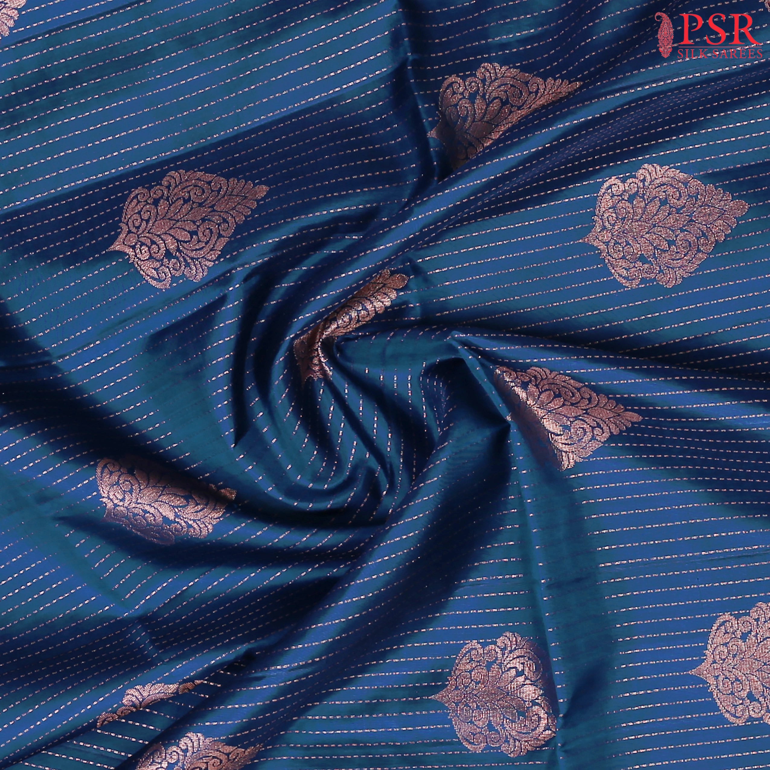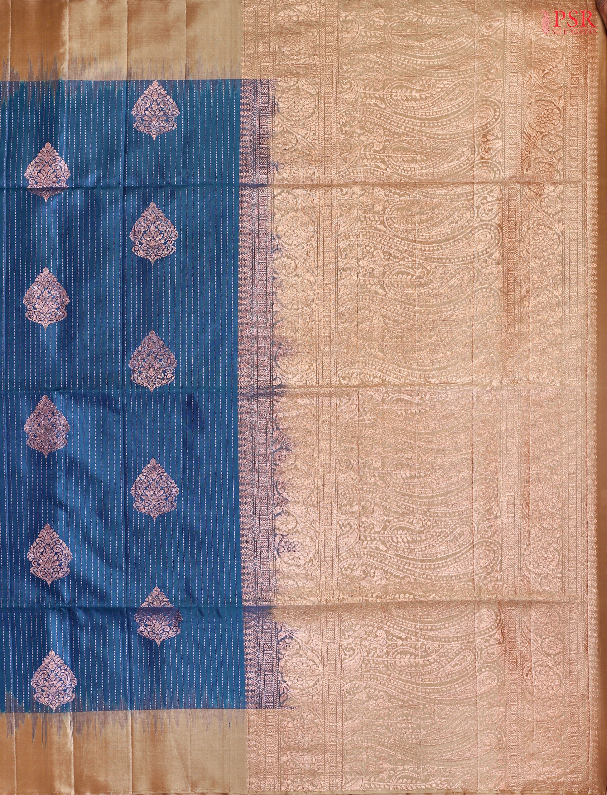 Step into subtle sophistication with PSR Silk Sarees’ Prussian Blue Soft Silk Saree, gracefully paired with a warm and elegant Chikoo contrast. This stunning drape features sleek stripe patterns enhanced with copper zari floral motifs, blending modern aesthetics with traditional craftsmanship.
