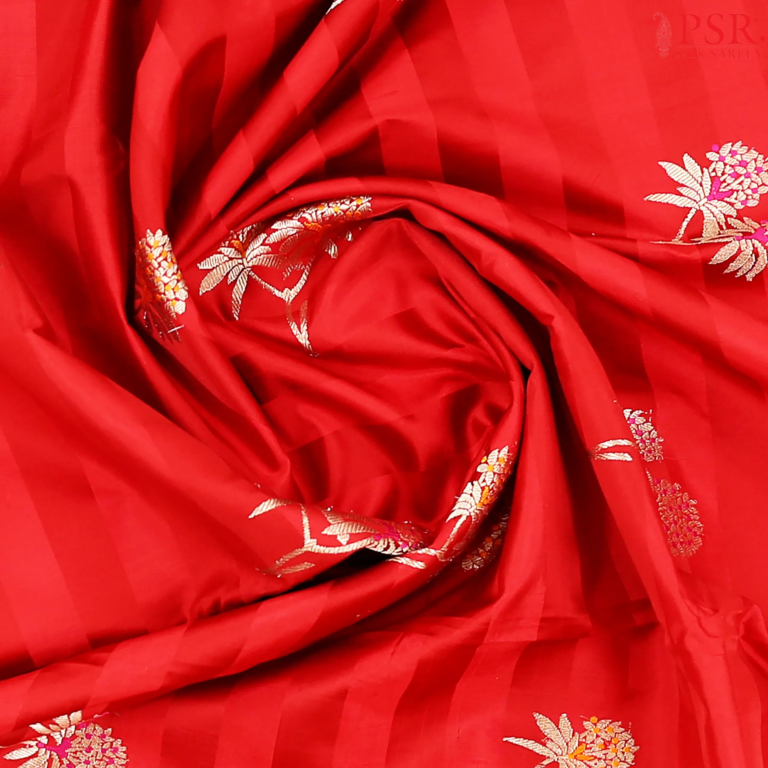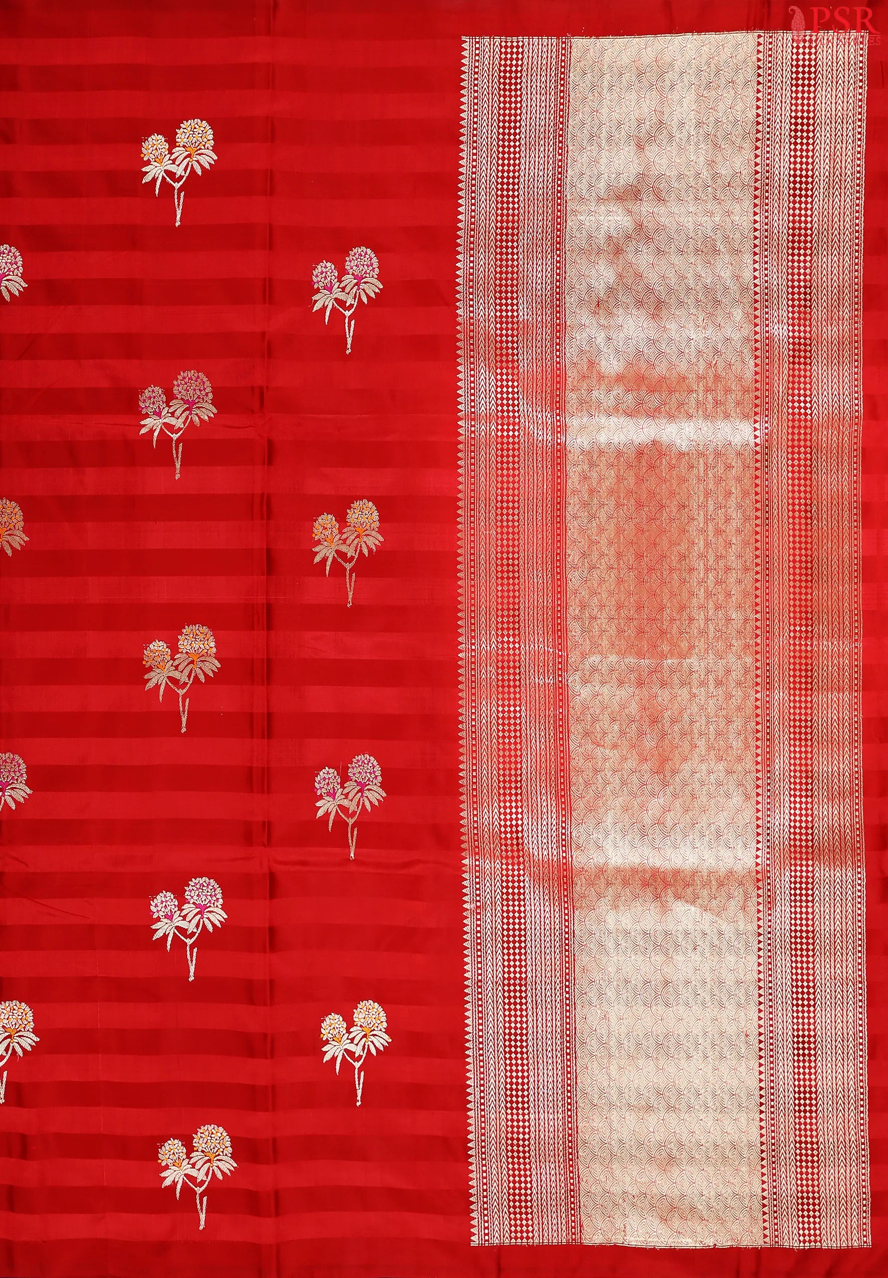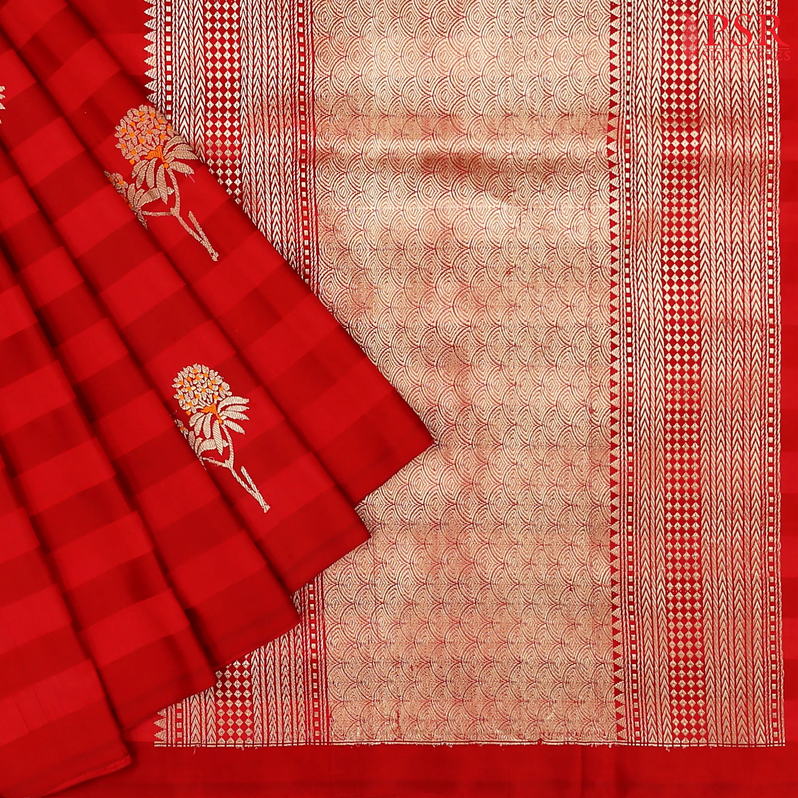 PSR Silk Sarees presents a classic Red Banaras Katan Silk Saree, crafted to embody timeless elegance and regal tradition.