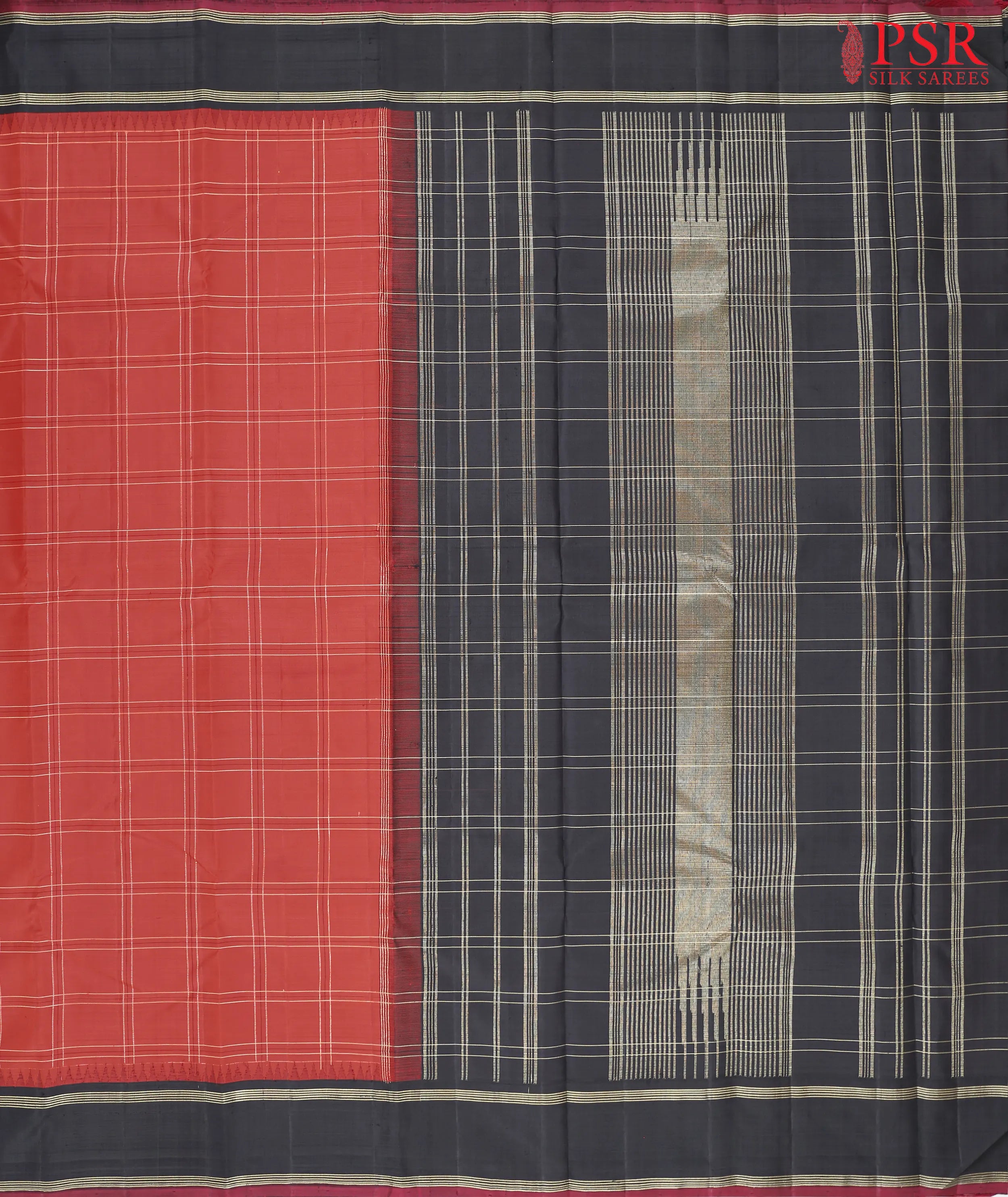 PSR Silk Sarees presents a striking Red Kanchipuram Silk Saree, enhanced with a bold Black contrast.