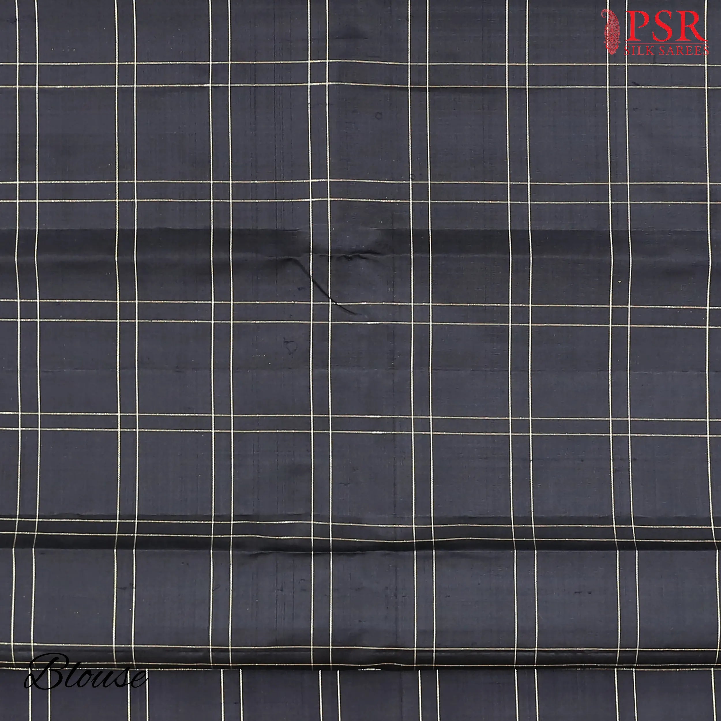 The saree features a beautiful zari & black checkered pattern, exuding a perfect blend of vibrance and sophistication. It is gracefully complemented by a rich Black traditional zari pallu with temple border, showcasing timeless weaving artistry. Completing the ensemble is a Black blouse with zari checks, adding balance and elegance to the drape.