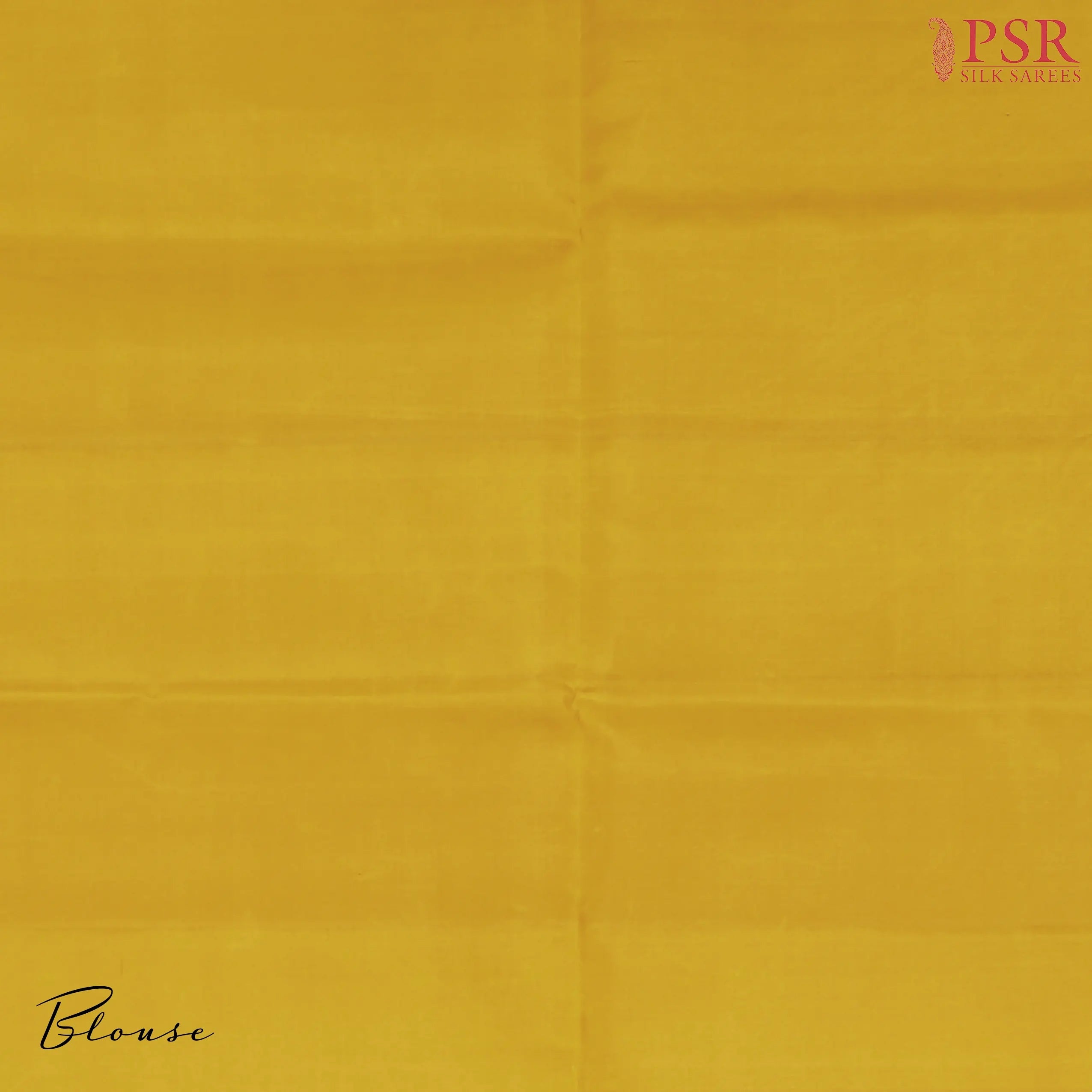 The saree features exquisite silver zari jacquard stripe weaves, adding a subtle shimmer to its rich texture. It is beautifully complemented by a contrasting Mustard Yellow pallu adorned with traditional zari work. The saree also carries a matching Red border embellished with elegant floral zari motifs, enhancing its refined appeal. Completing the ensemble is a plain Mustard Yellow blouse, perfectly balancing the grandeur of the drape.