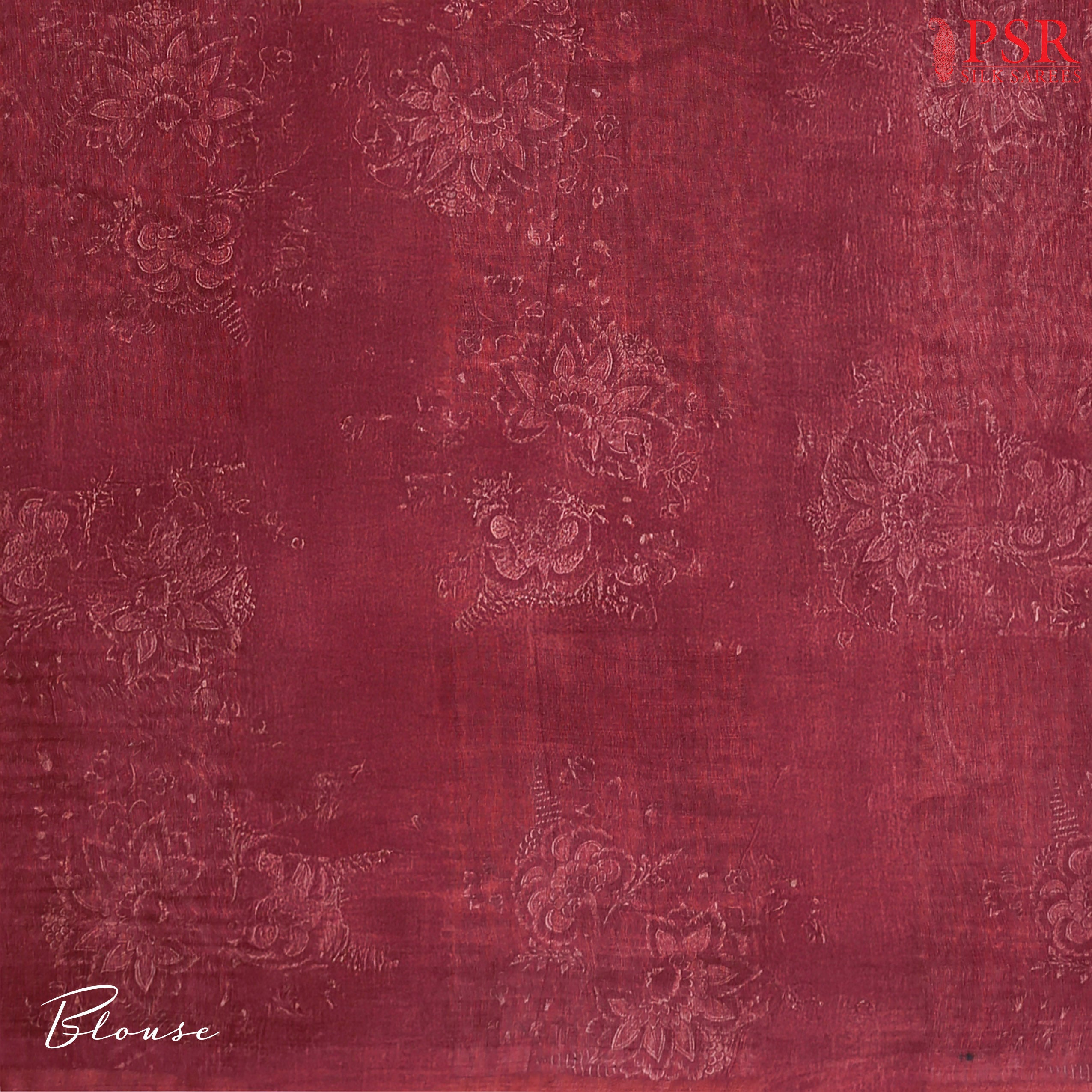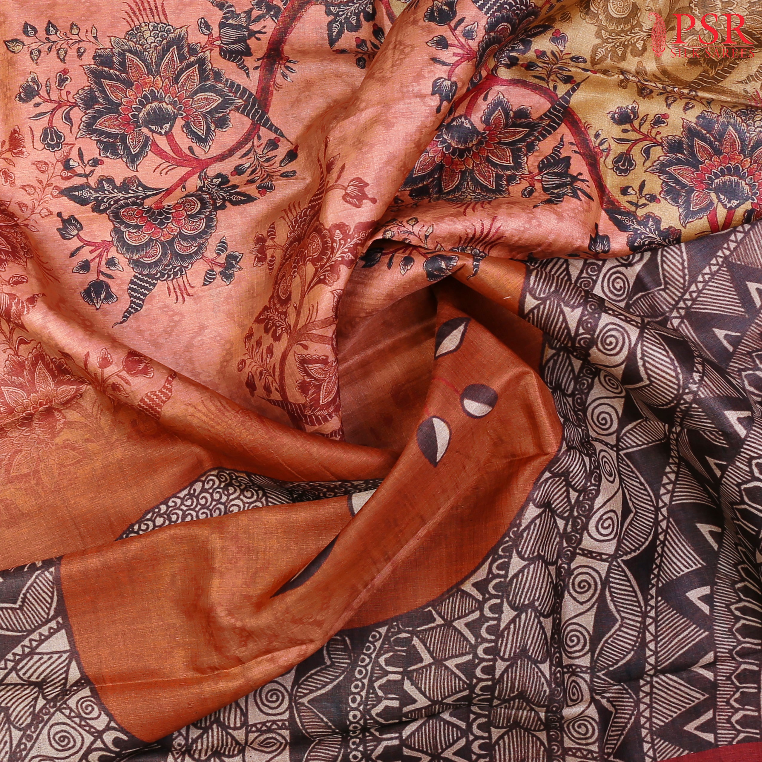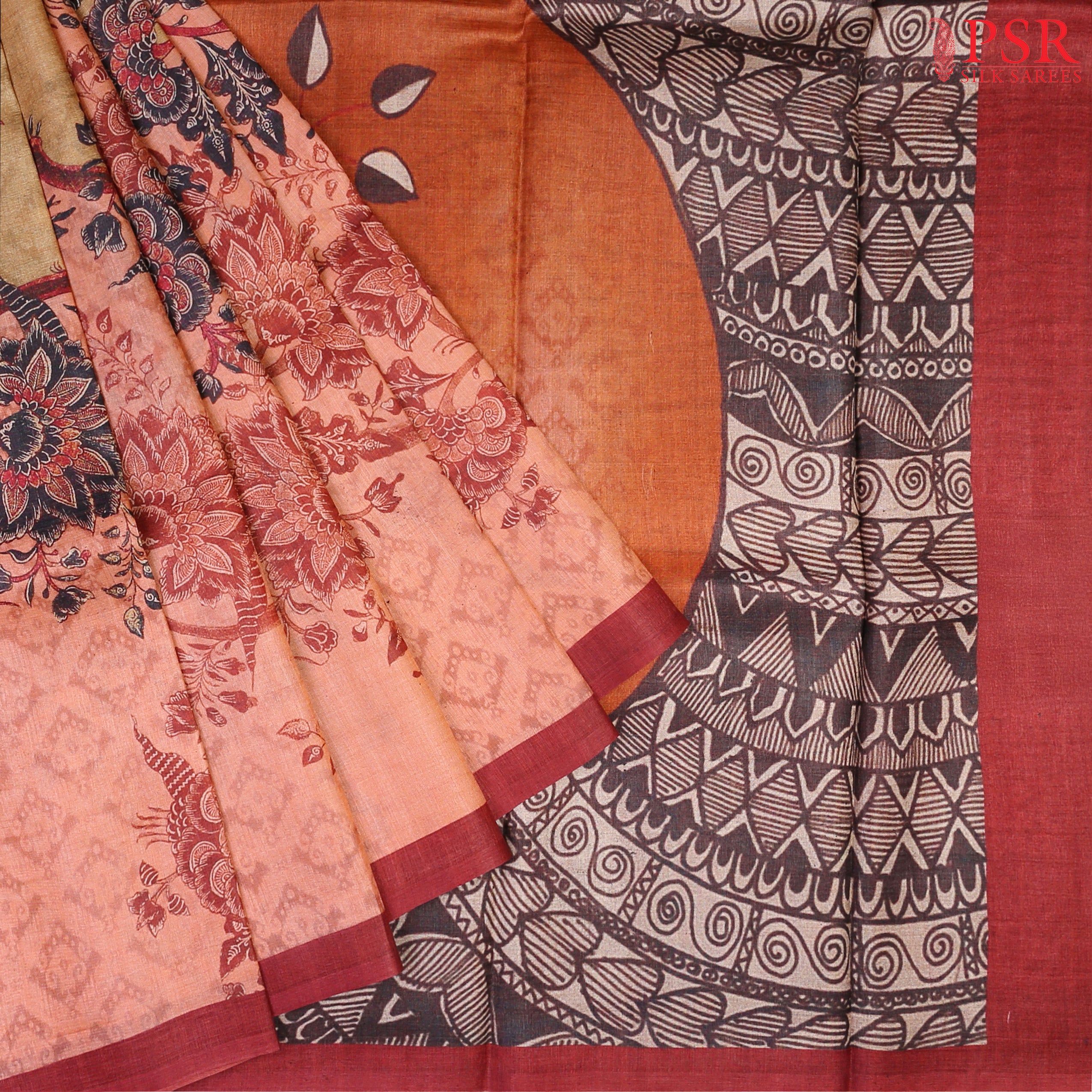 Adorn yourself with the enchanting beauty of our Salmon Peach and Mustard Brown Kadhi Tussar Silk Saree, elegantly paired with Maroon accents. This exquisite saree features captivating scroll floral prints, exuding timeless charm. The highlight is its matching pallu adorned with bold mayura (peacock) prints, adding a regal touch. Paired with a maroon floral-printed blouse and a small plain maroon border, this saree is the perfect blend of tradition and modern artistry.