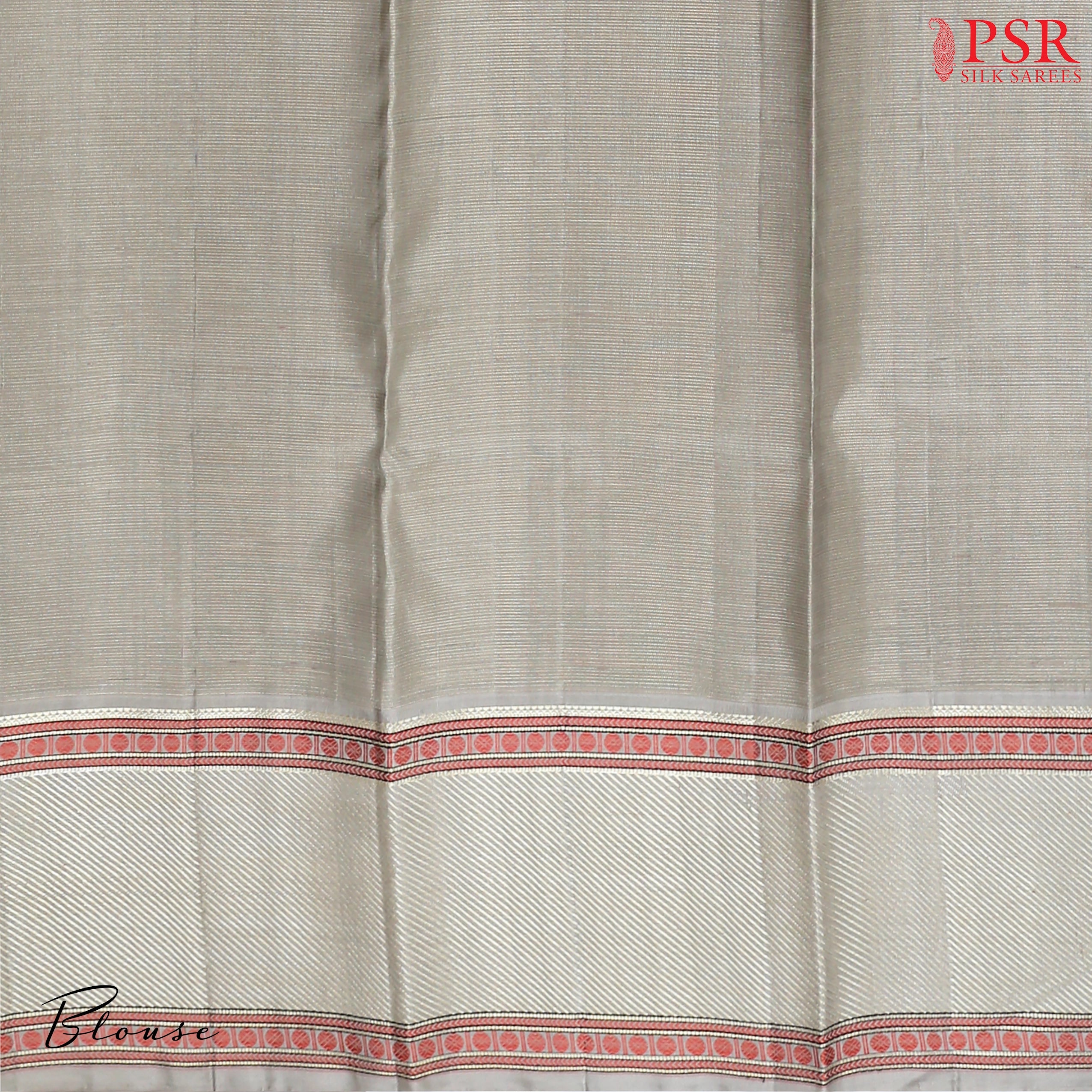 It is beautifully paired with a contrasting Tan-colored pallu and border, enriched with traditional zari craftsmanship. The look is completed with a Tan-colored blouse featuring matching Vaira-Oosi stripes, making it a perfect choice for weddings, festivities, and grand occasions.