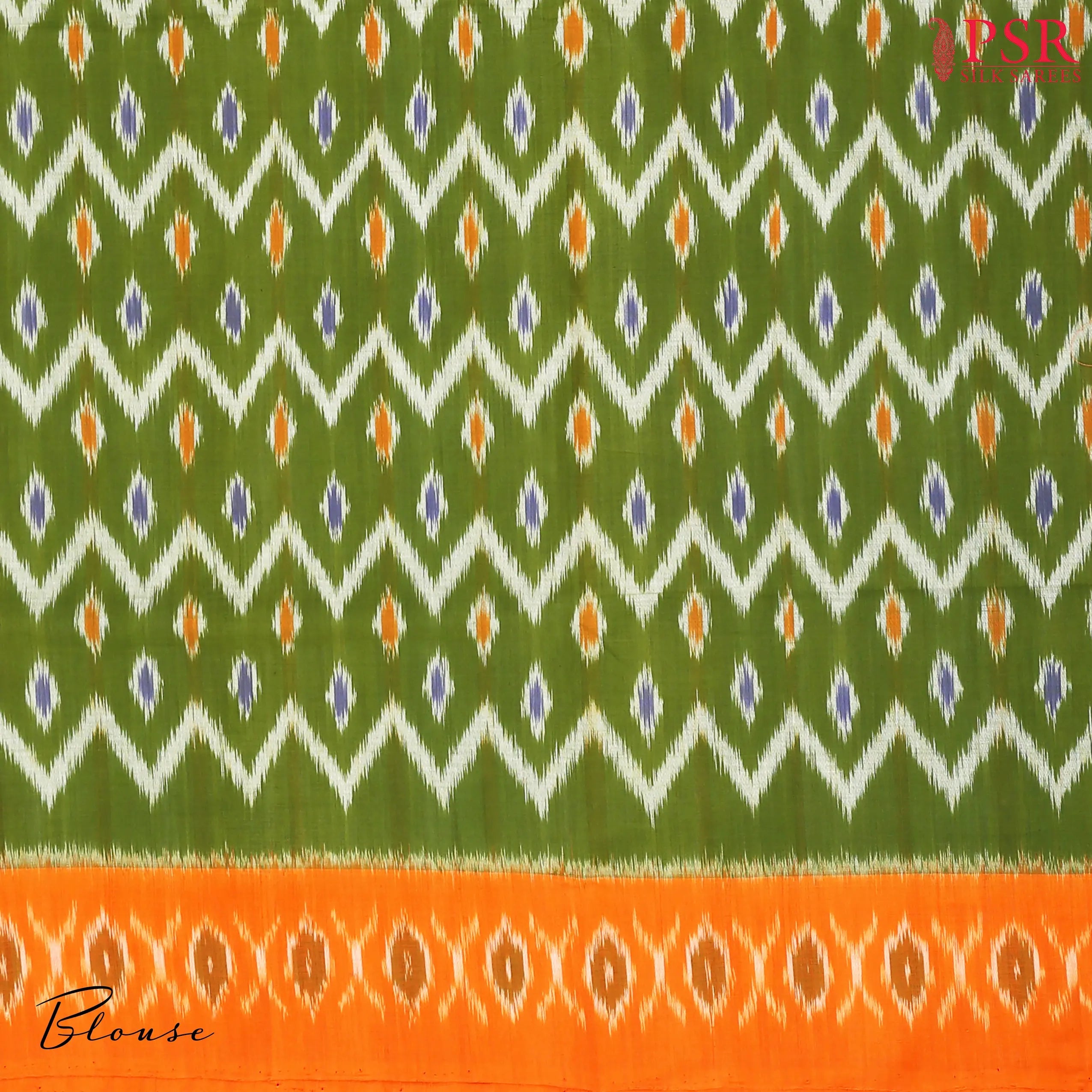 PSR Silk Sarees presents a Sap Green colored Ikkat cotton saree with combination of Orange color.