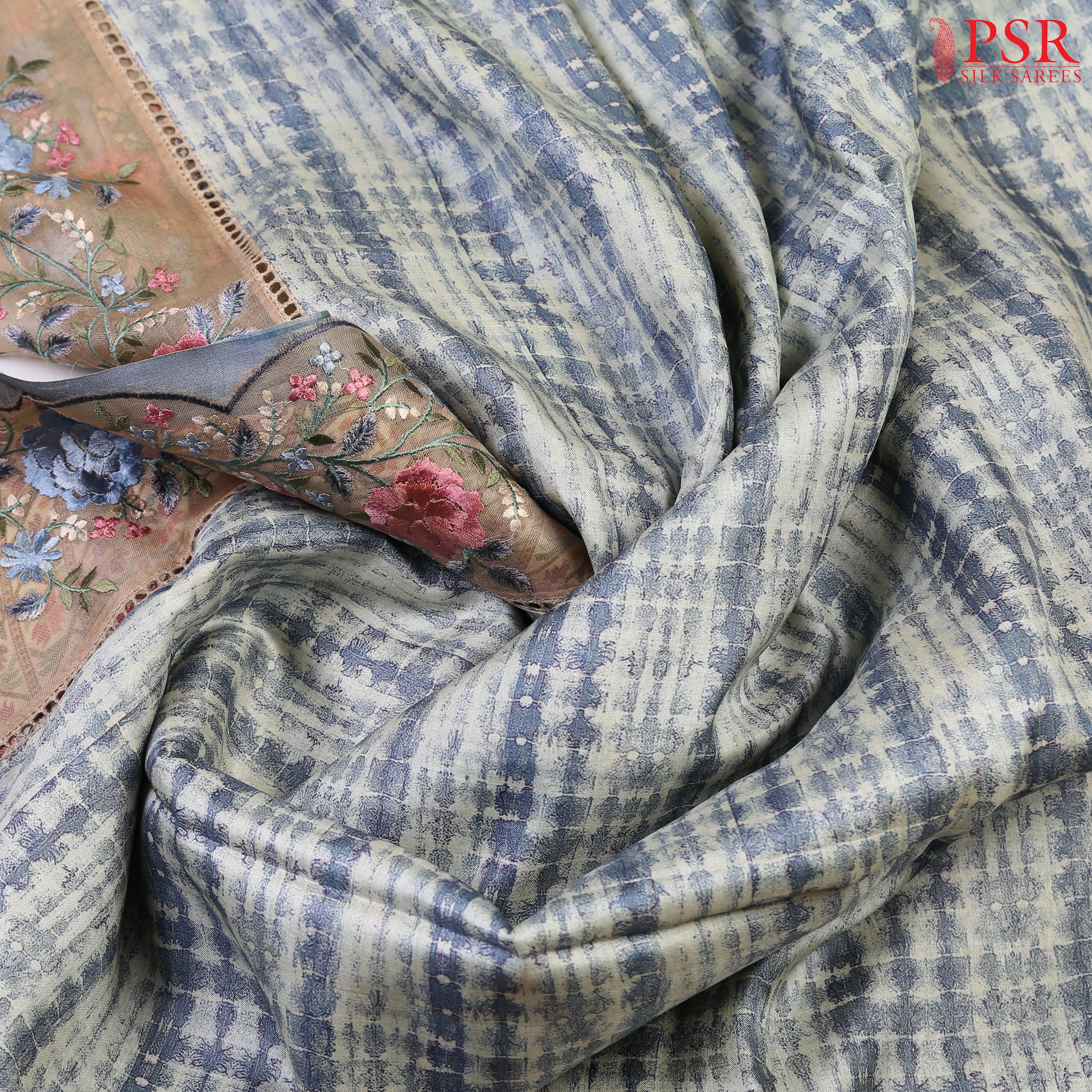 PSR Silks introduces a stunning Steel Blue & Beige Kadhi Tussar Silk saree adorned with captivating abstract prints. The standout feature of this saree is its exquisite Scallop floral embroidery border crafted from a delicate, translucent material. Complete with a complementary printed blouse, this ensemble exudes elegance and sophistication.
