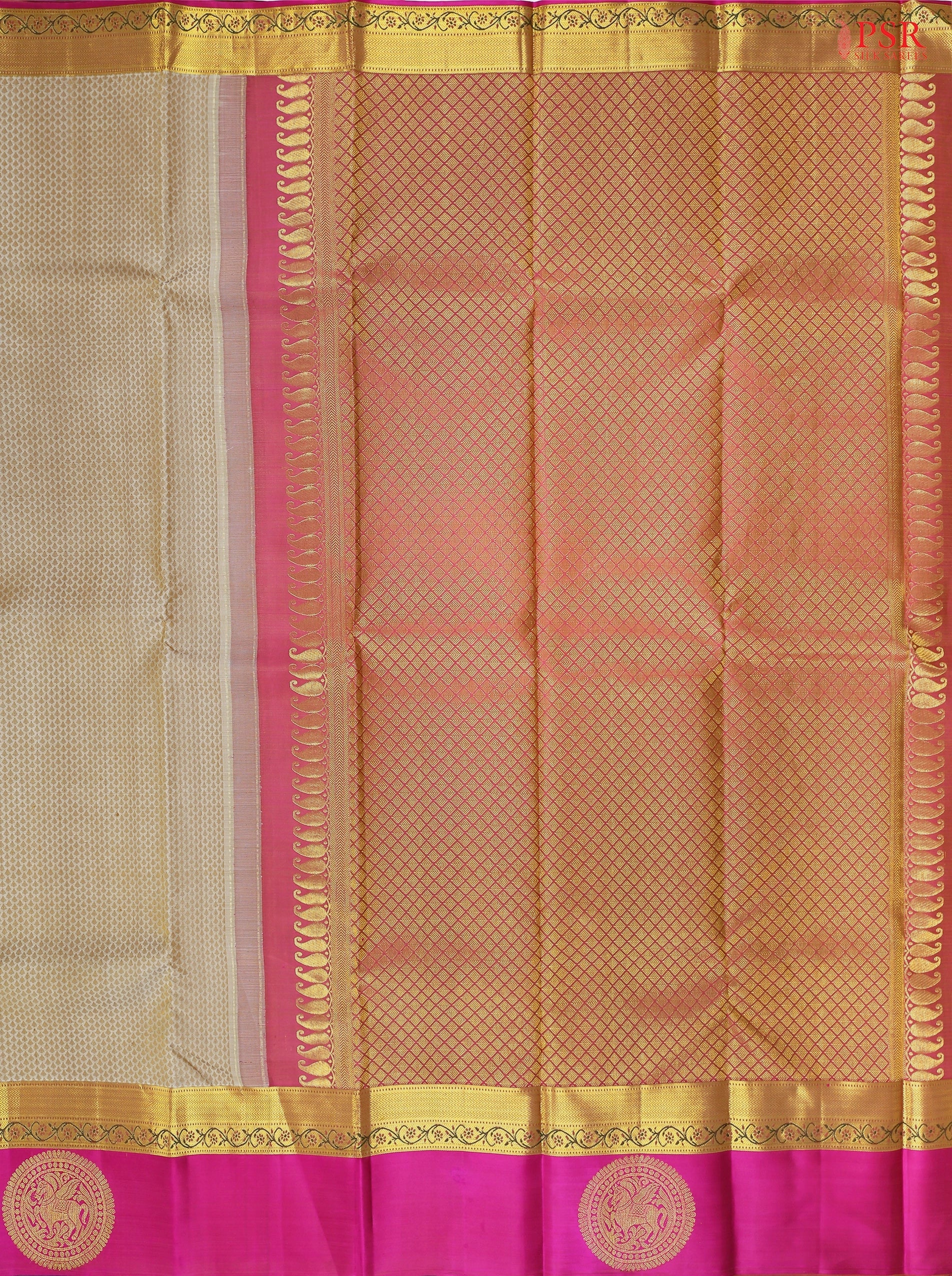 It is gracefully paired with a Flamingo Pink traditional zari pallu and magneta pink border, embellished with beautiful zari motifs that enhance its regal appeal. The saree is completed with a plain Flamingo Pink blouse, adding a touch of contrast and sophistication.
