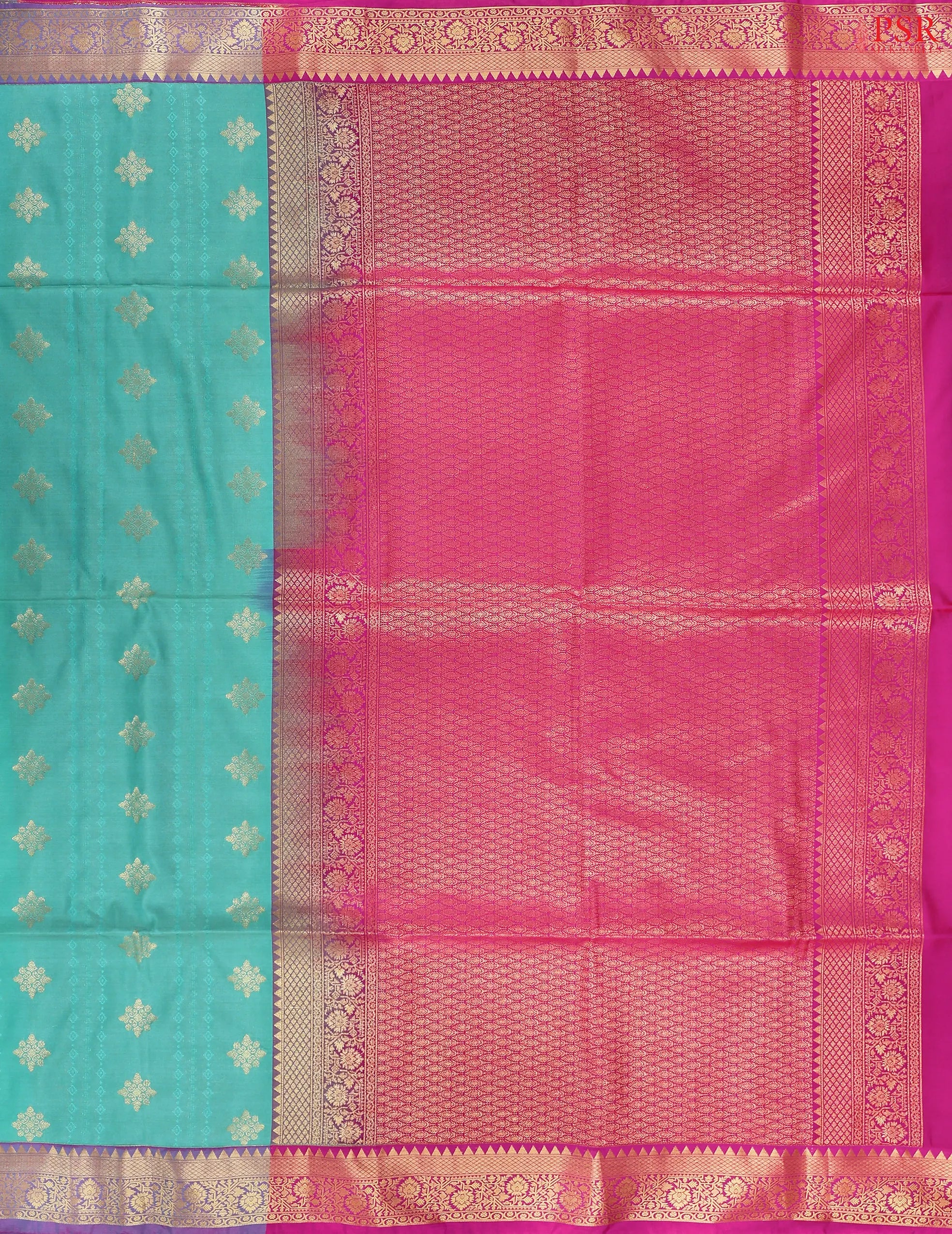 PSR Silk Sarees presents a Turquoise Green Soft Art Silk Saree with combination of Pink color.