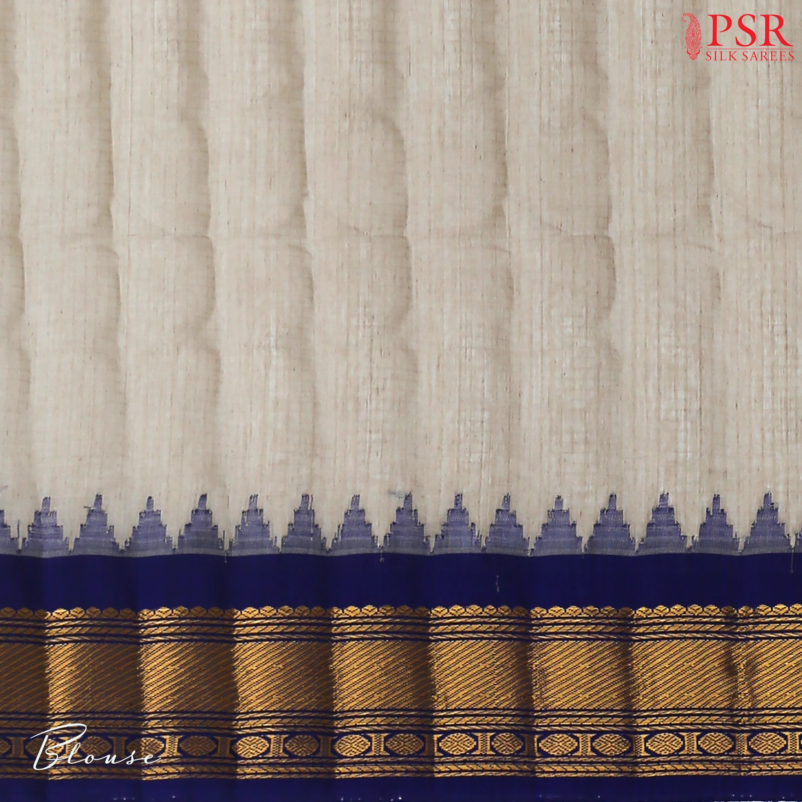 Discover subtle luxury with PSR Silk Sarees’ Tussar Beige Gadwal Silk Cotton Saree, gracefully paired with a serene Dark Blue contrast. This elegant small zari motifs saree is elevated with a Dark Blue - colored pallu and border adorned with fine zari work, offering a minimalistic yet timeless look.