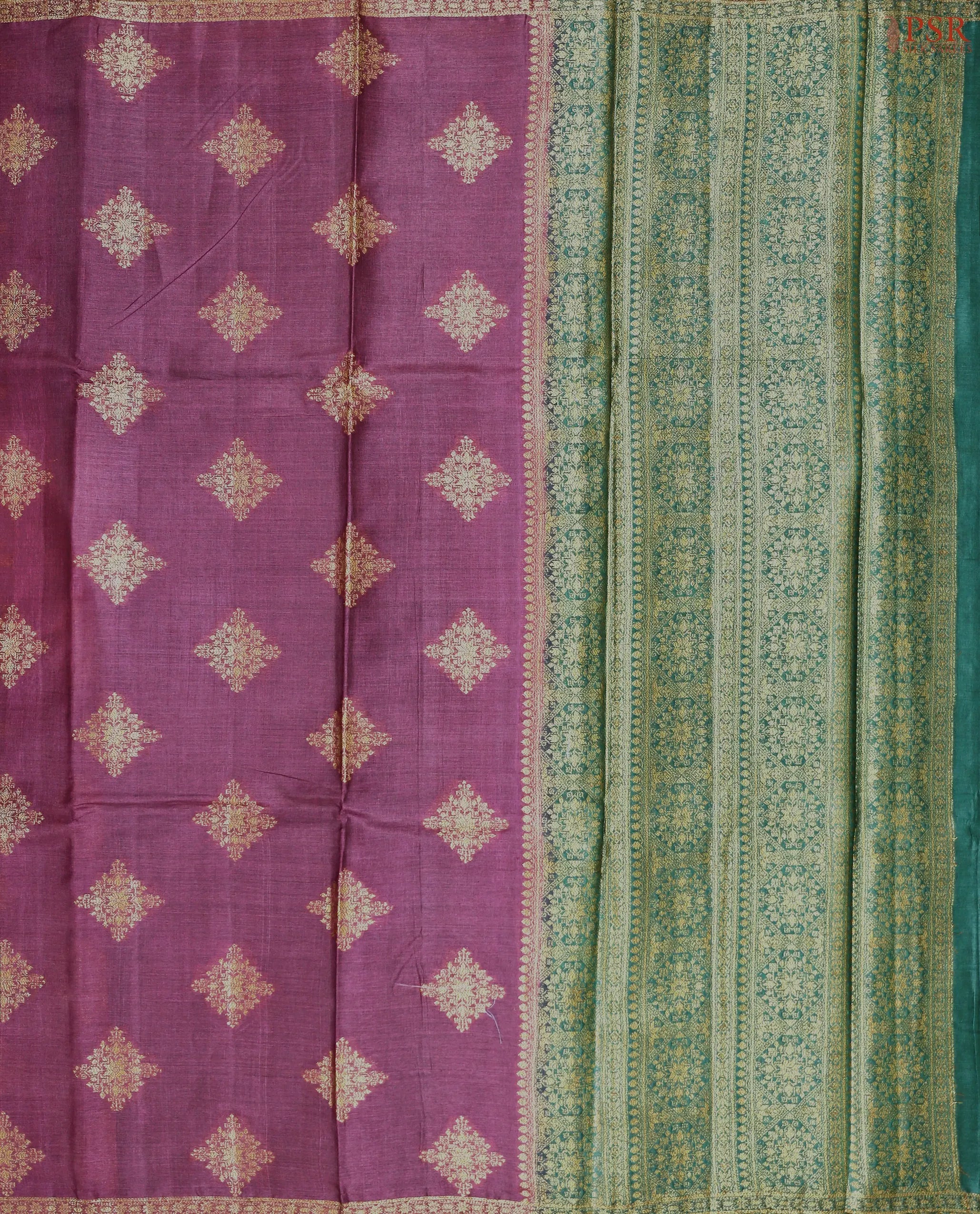 PSR Silk Sarees presents a Tyrian Purple delicate Banaras Tussar Silk saree, beautifully paired with an elegant Dark Green combination.