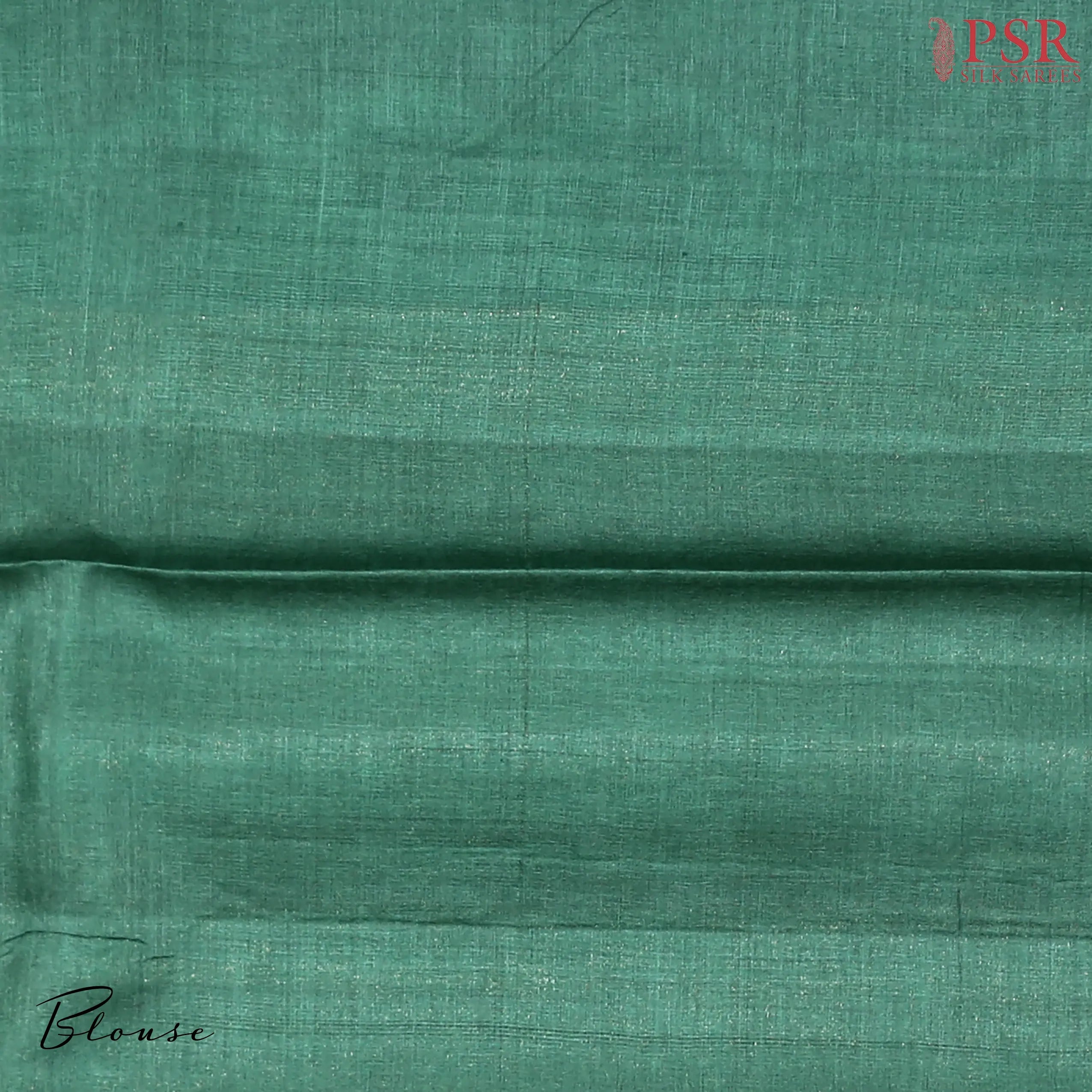 This refined saree features antique-style zari floral geometrical motifs, adding a subtle yet rich shimmer to its soft Tussar texture. The contrasting Dark Green pallu is adorned with traditional zari work, enhancing its classic charm. Completing the ensemble is a plain Dark Green blouse, perfectly complementing the saree’s graceful aesthetic.