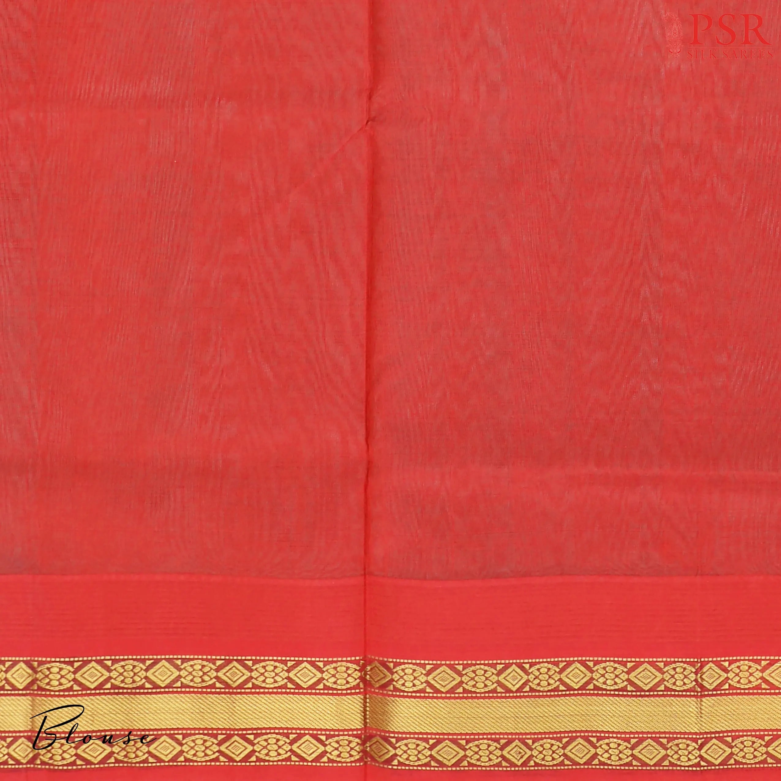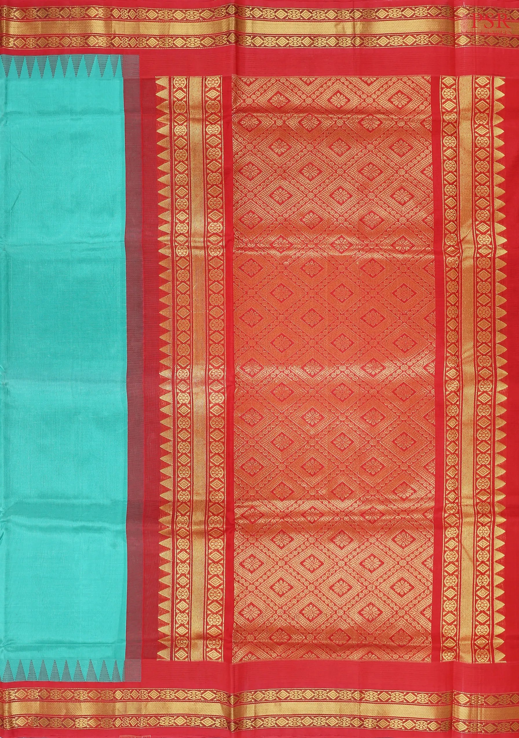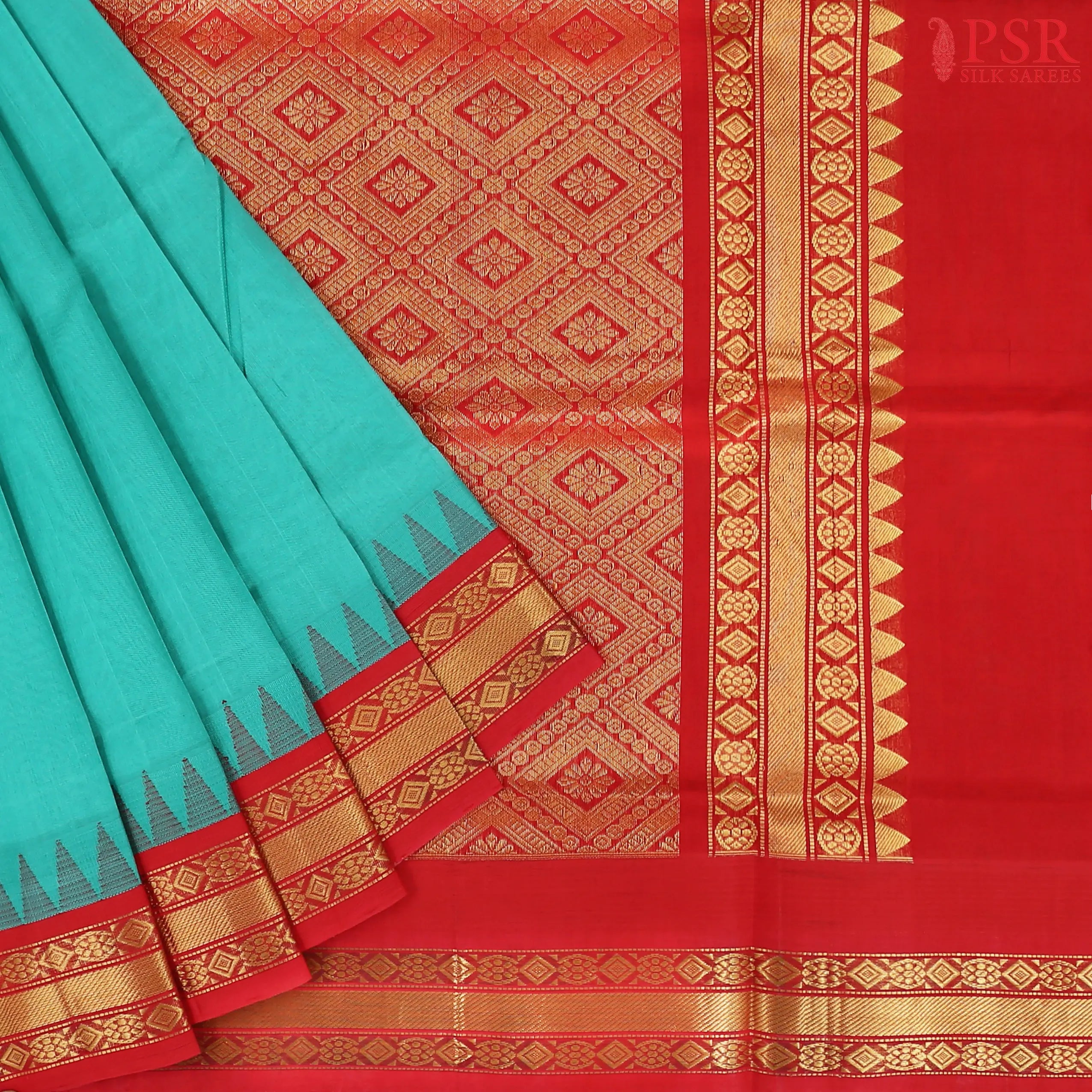 PSR Silk Sarees presents a Verdigris colored Cotton Silk saree with combination of Red color.