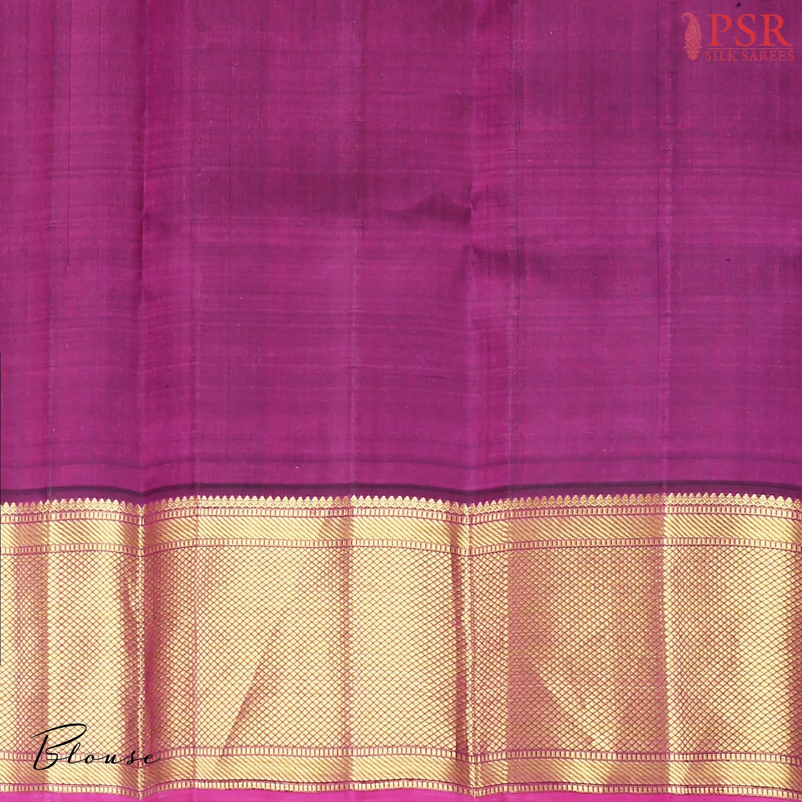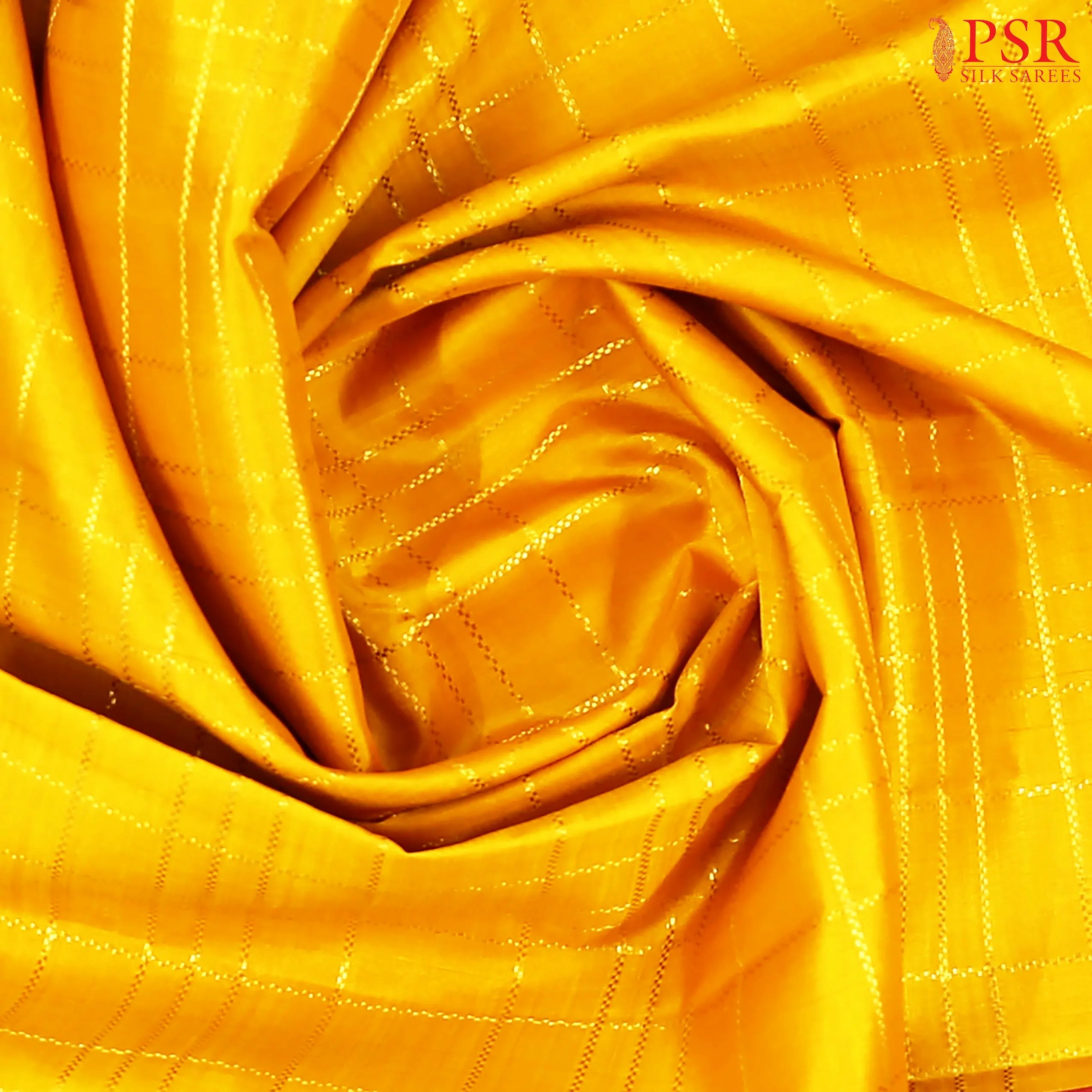 PSR Silk Sarees unveils a vibrant Amber YellowĀ Kanchipuram Silk Saree from its prestigious Shrestha Kanjivaram collection, paired elegantly with Dark Purple accents. This exquisite saree features delicate zari plaids pattern beautifully enhanced by golden zari weaves, creating a graceful interplay of textures. The look is completed with a Dark Purple-colored rich & traditional zari work pallu and border, adding subtle sophistication. A a plain Dark Purple blouse adds balance and elegance to this timeless ensemble.