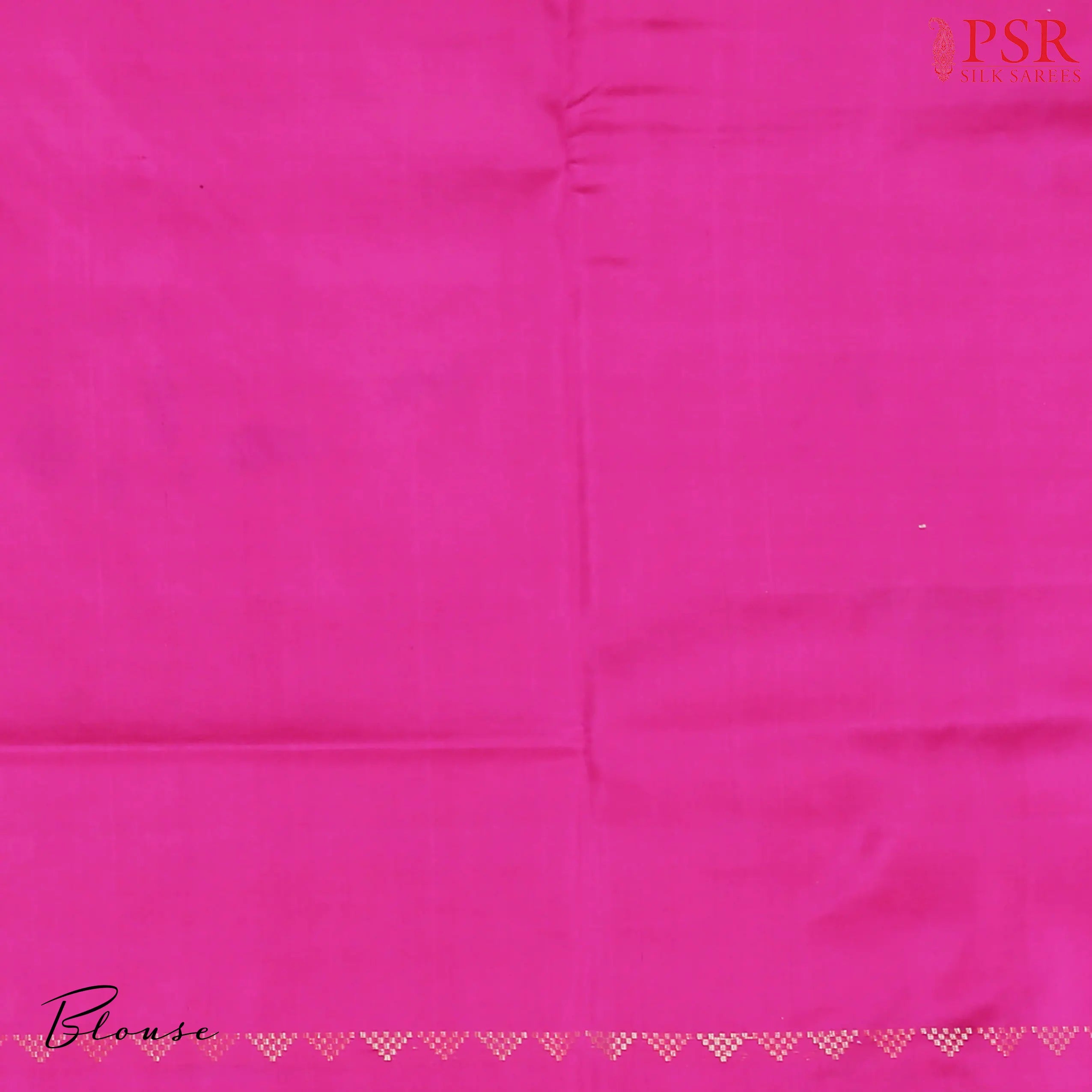 It is complemented by a Magenta Pink traditional zari work pallu and a plain Magenta Pink border, keeping the look classic yet graceful. The saree is attached with a plain Magenta Pink blouse, allowing for a perfectly coordinated ensemble.