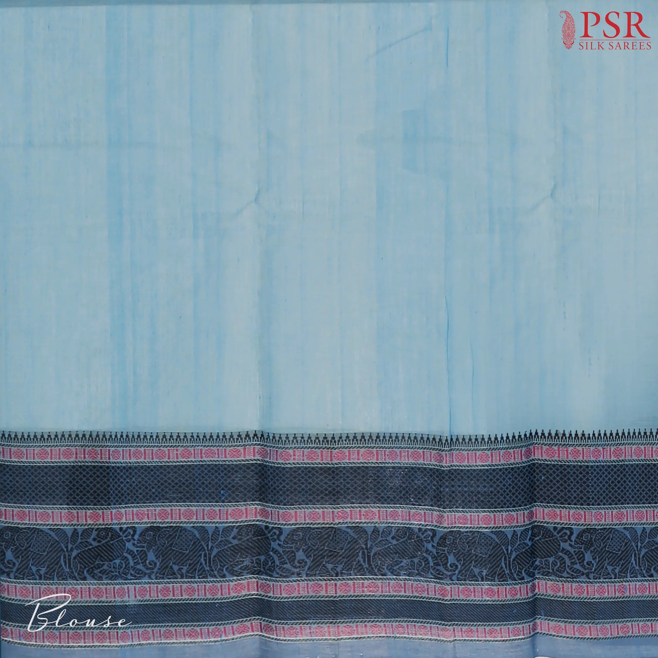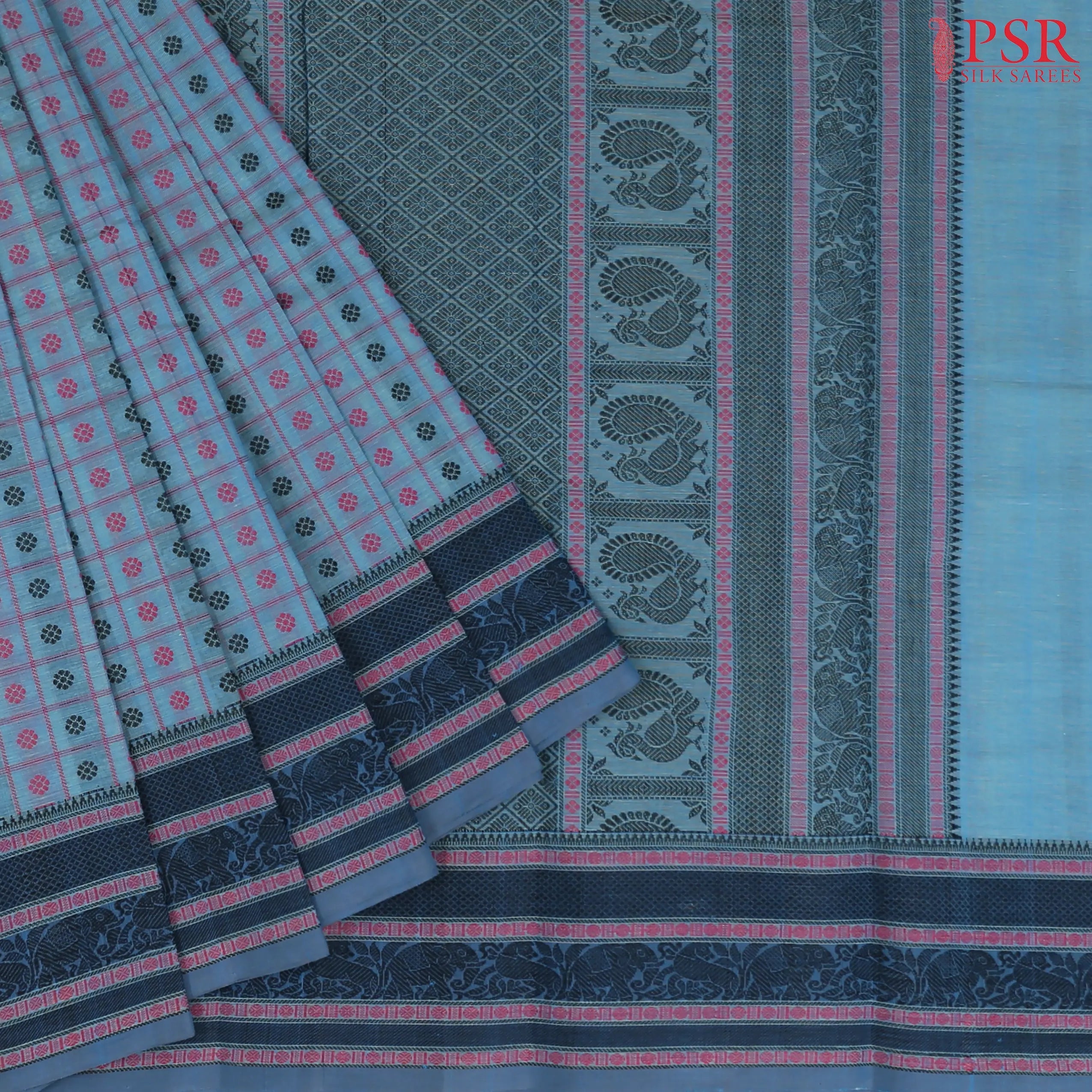 PSR Silks presents a traditional handloom Kalakshetra Kovai Cotton saree in a captivating Cerulean Blue, beautifully weaved Black & Pink thread work.
