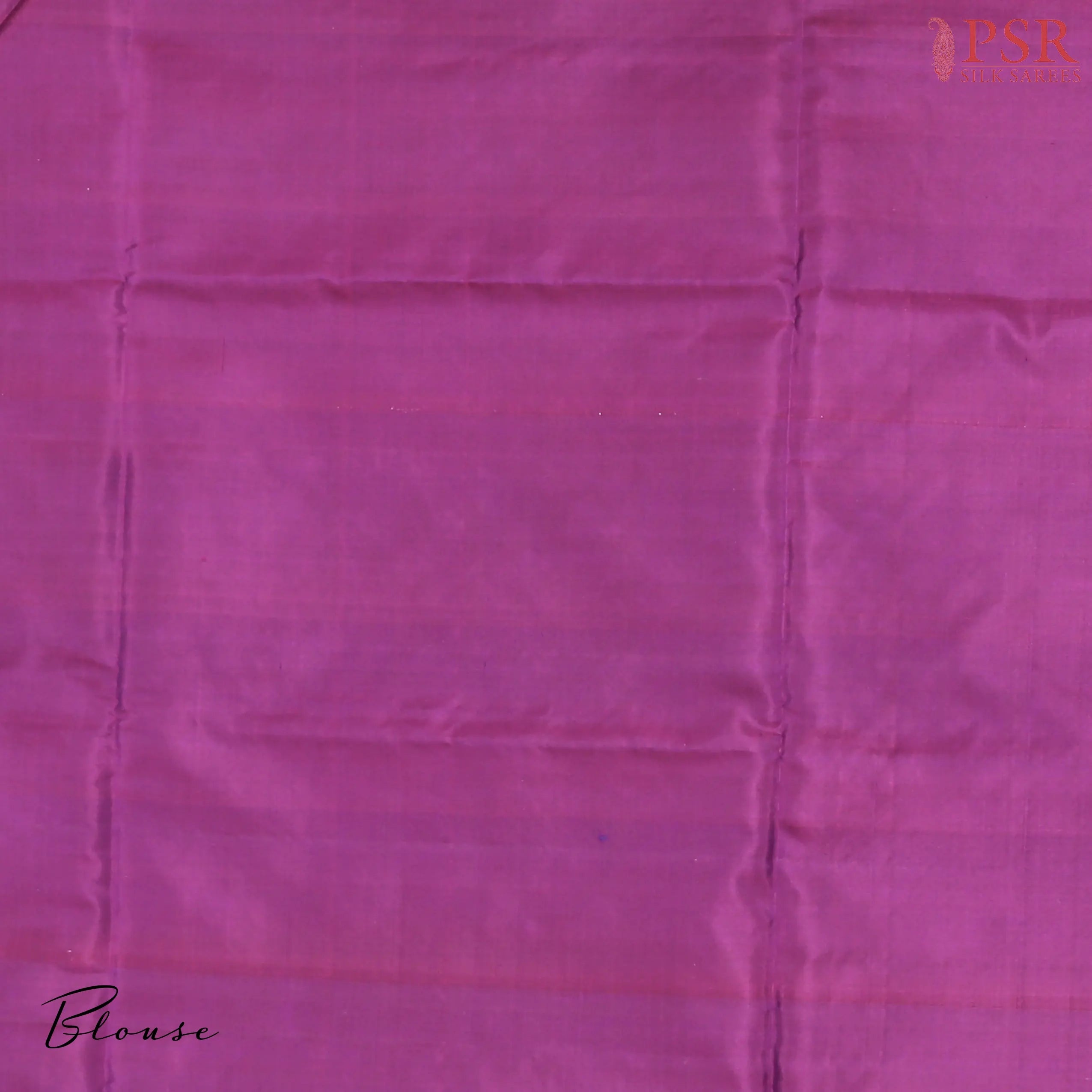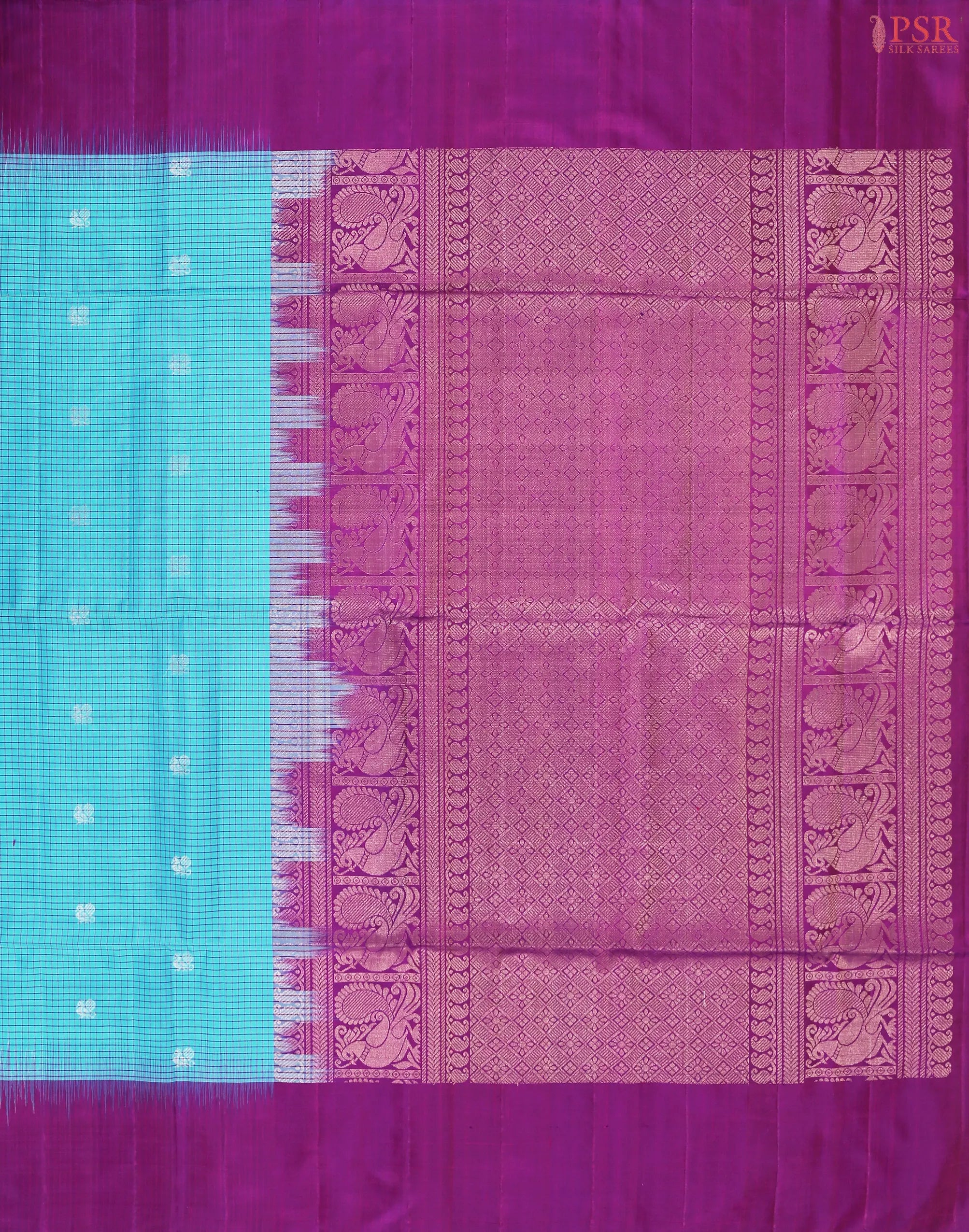 PSR Silk Sarees presents a stunning Cerulean Blue Soft Silk Saree, beautifully paired with a bold Boysenberry Purple contrast. The saree features an elegant purple checks pattern with small mayura zari motifs, reflecting the perfect blend of tradition and sophistication. Its Boysenberry Purple pallu is adorned with rich traditional zari work, while the classic Boysenberry Purple plain border adds grandeur to the drape. Completing the ensemble is a matching Boysenberry Purple blouse with zari stripes, making it an ideal choice for festive occasions, weddings, and cultural gatherings.