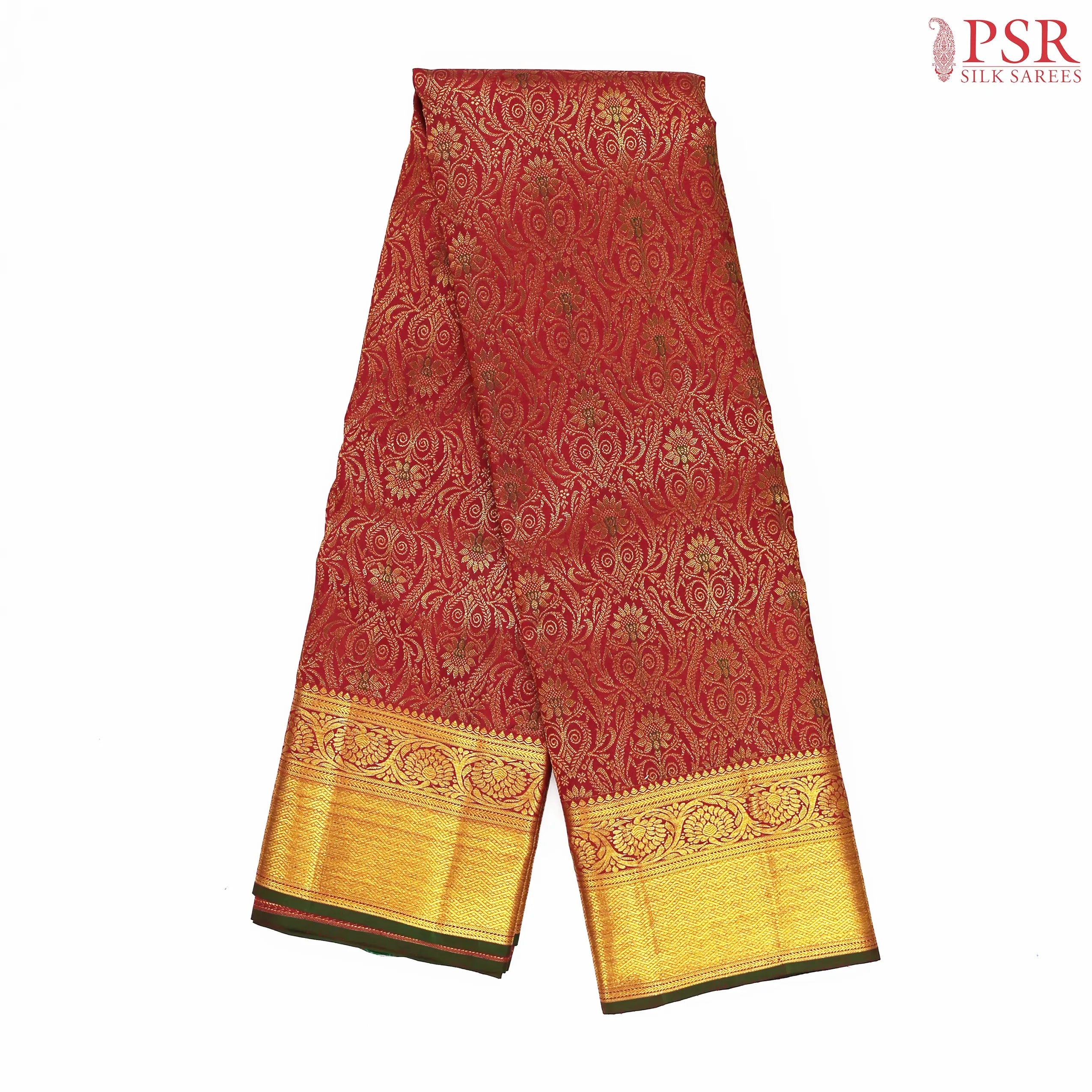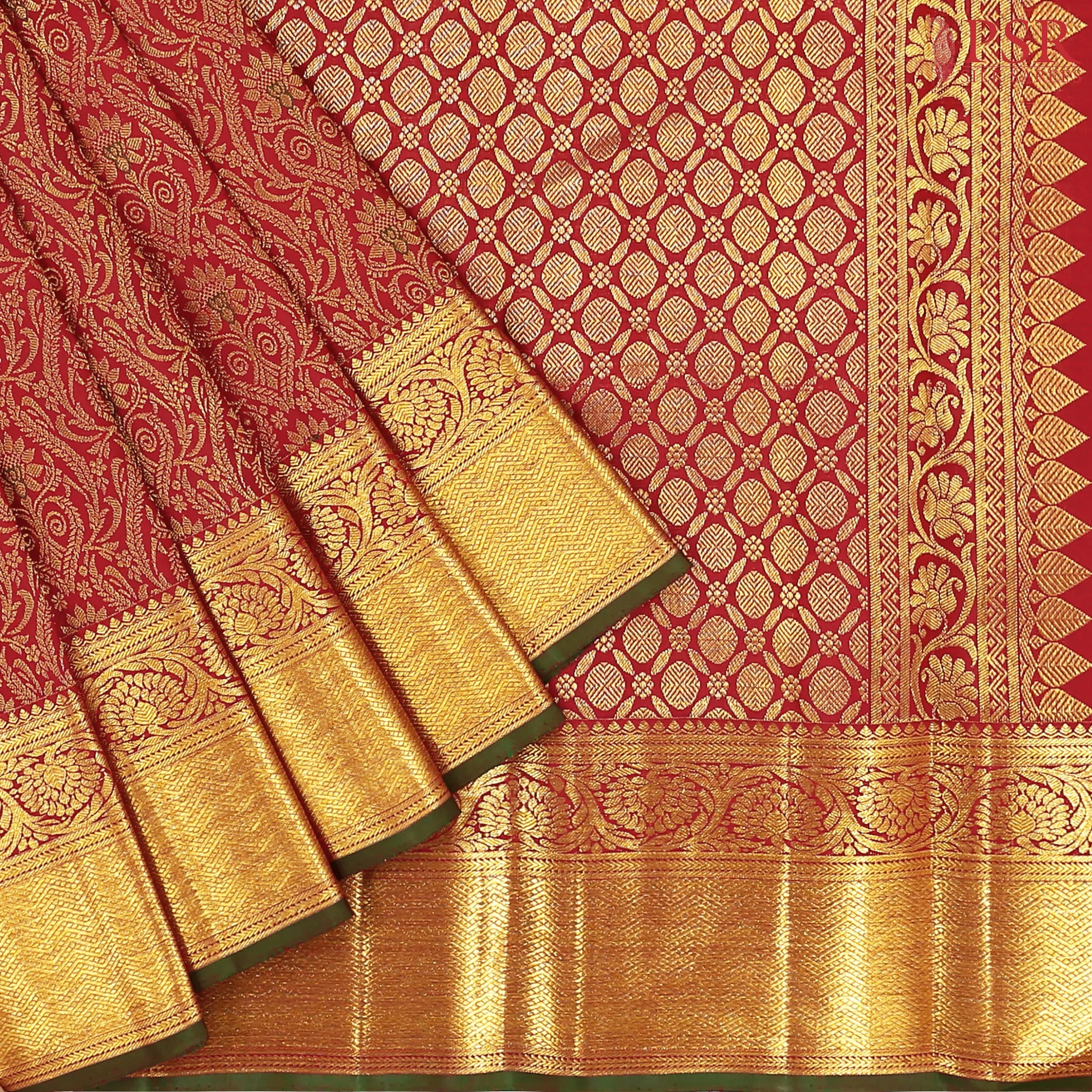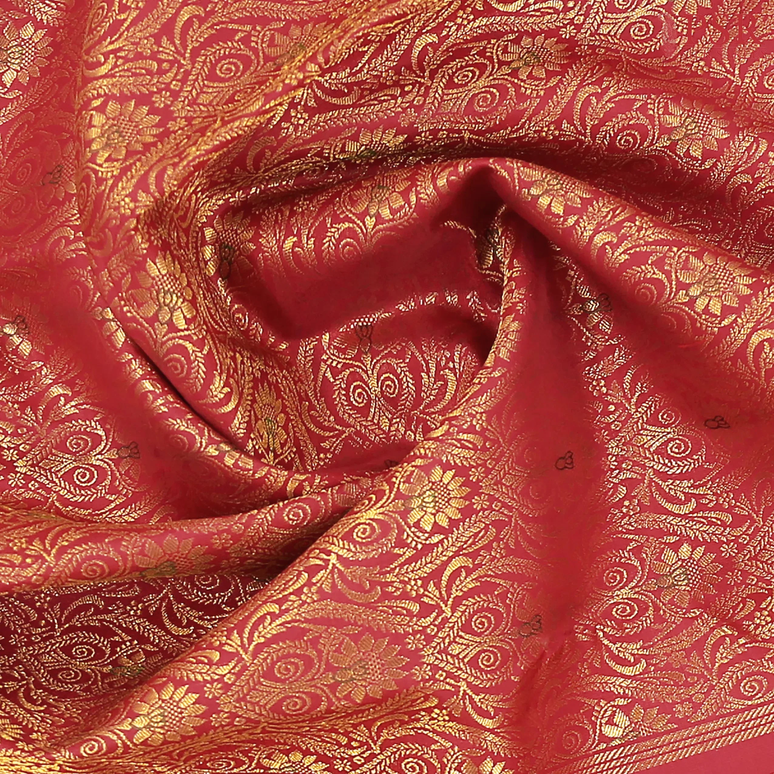 PSR Silk Sarees presents an exquisite Cherry Red Kanchipuram Jacquard Silk Saree, radiating timeless grace and traditional splendor.