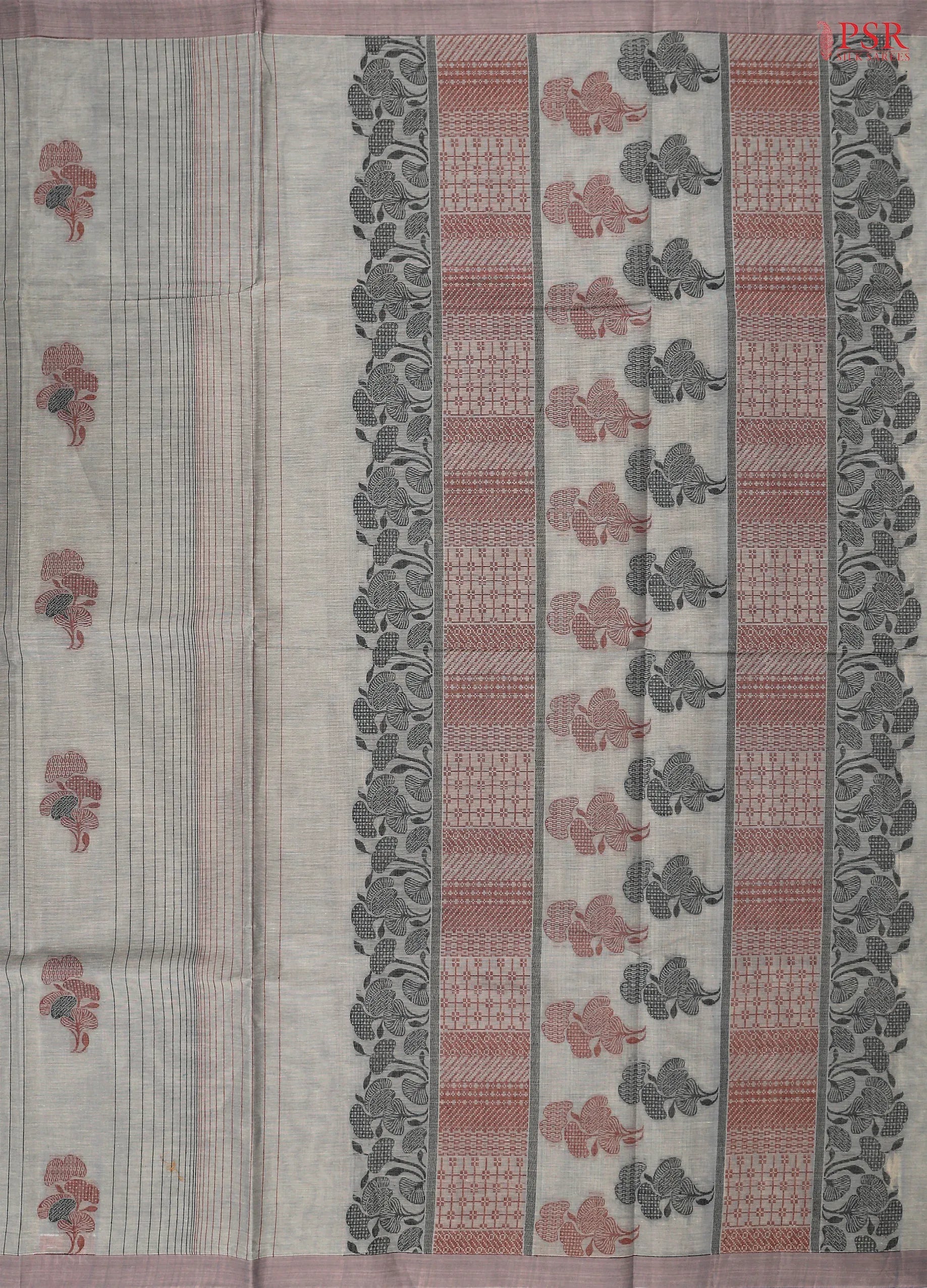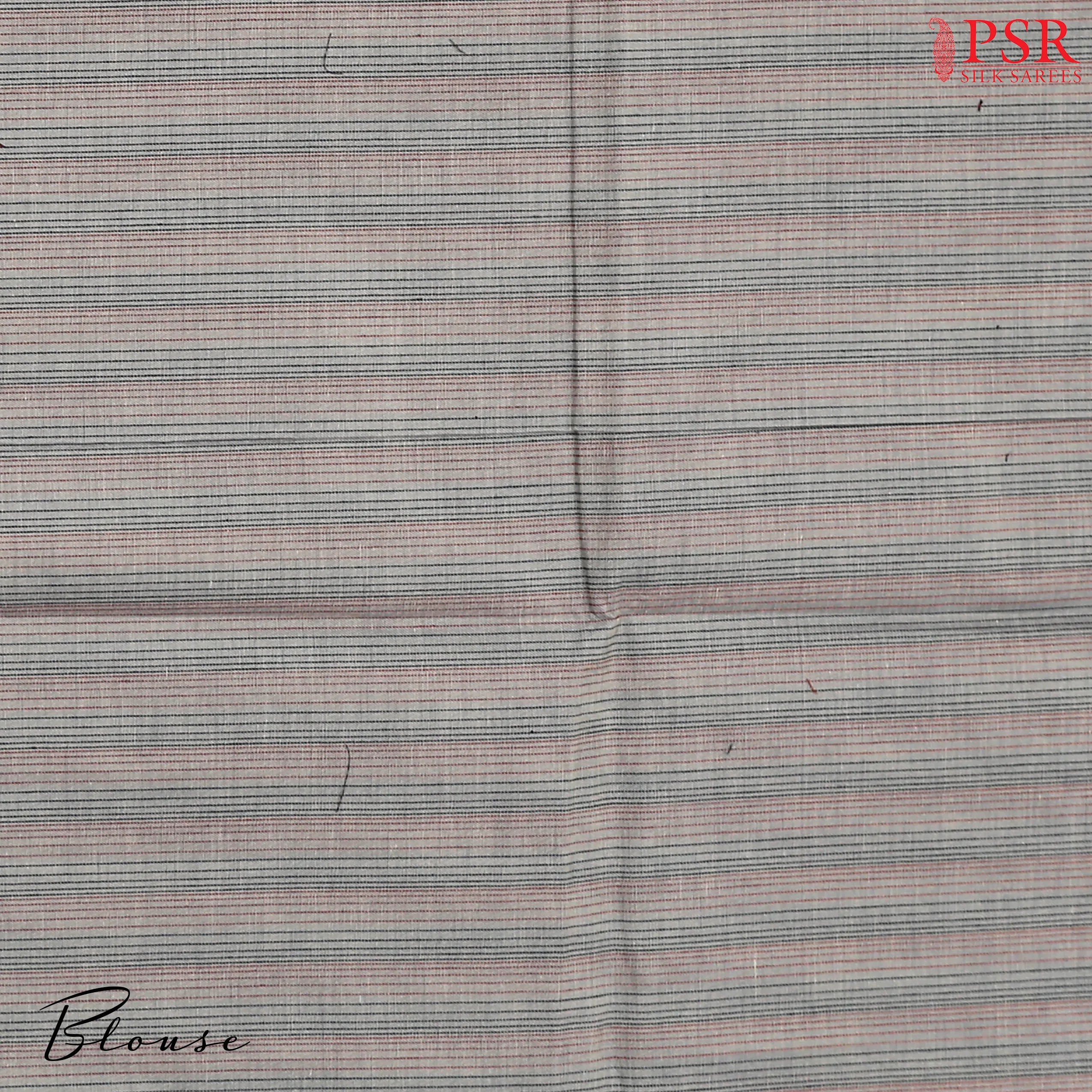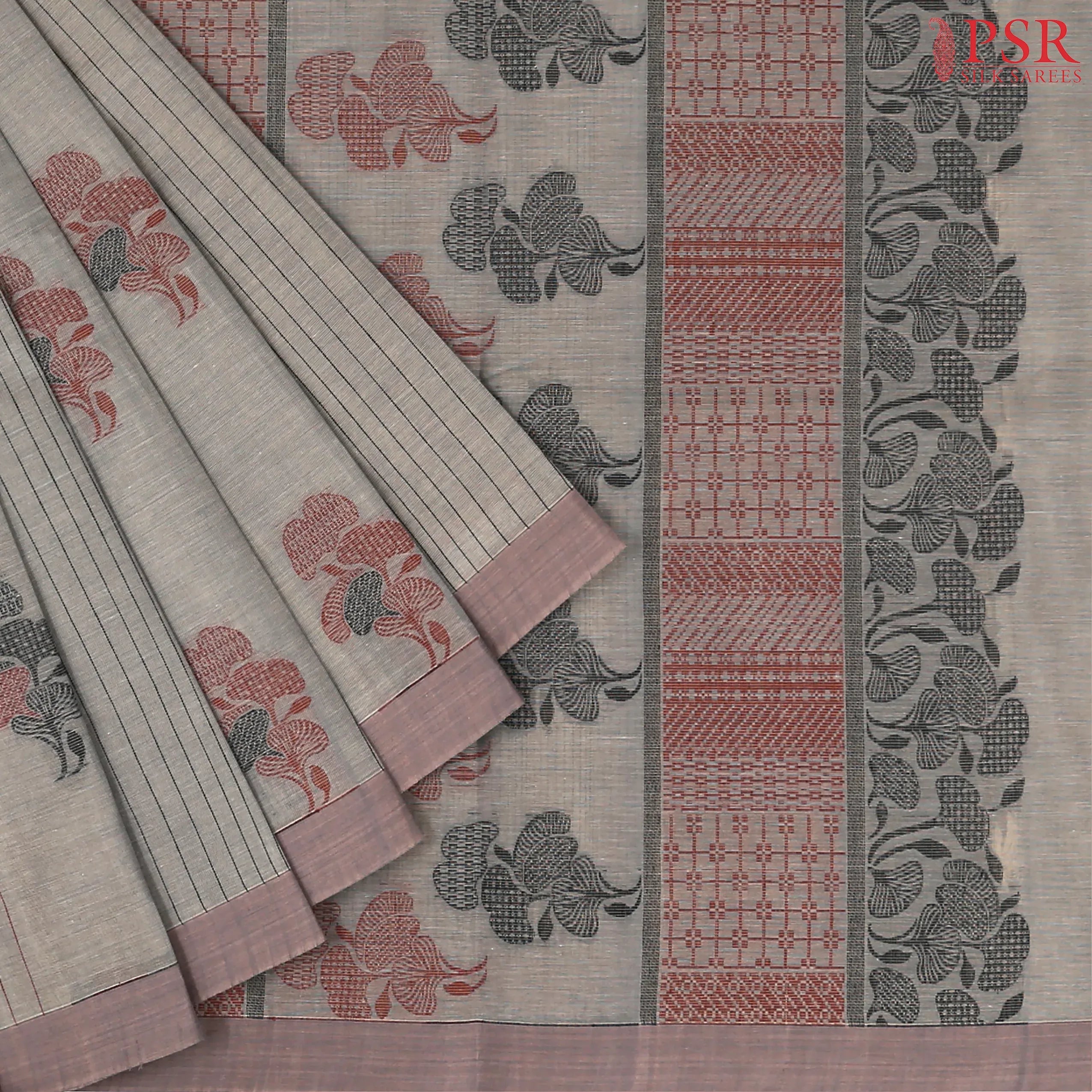 PSR Silks presents a traditional Kovai Cotton saree in a captivating Cloud Grey, beautifully weaved with brown & dark blue thread work.