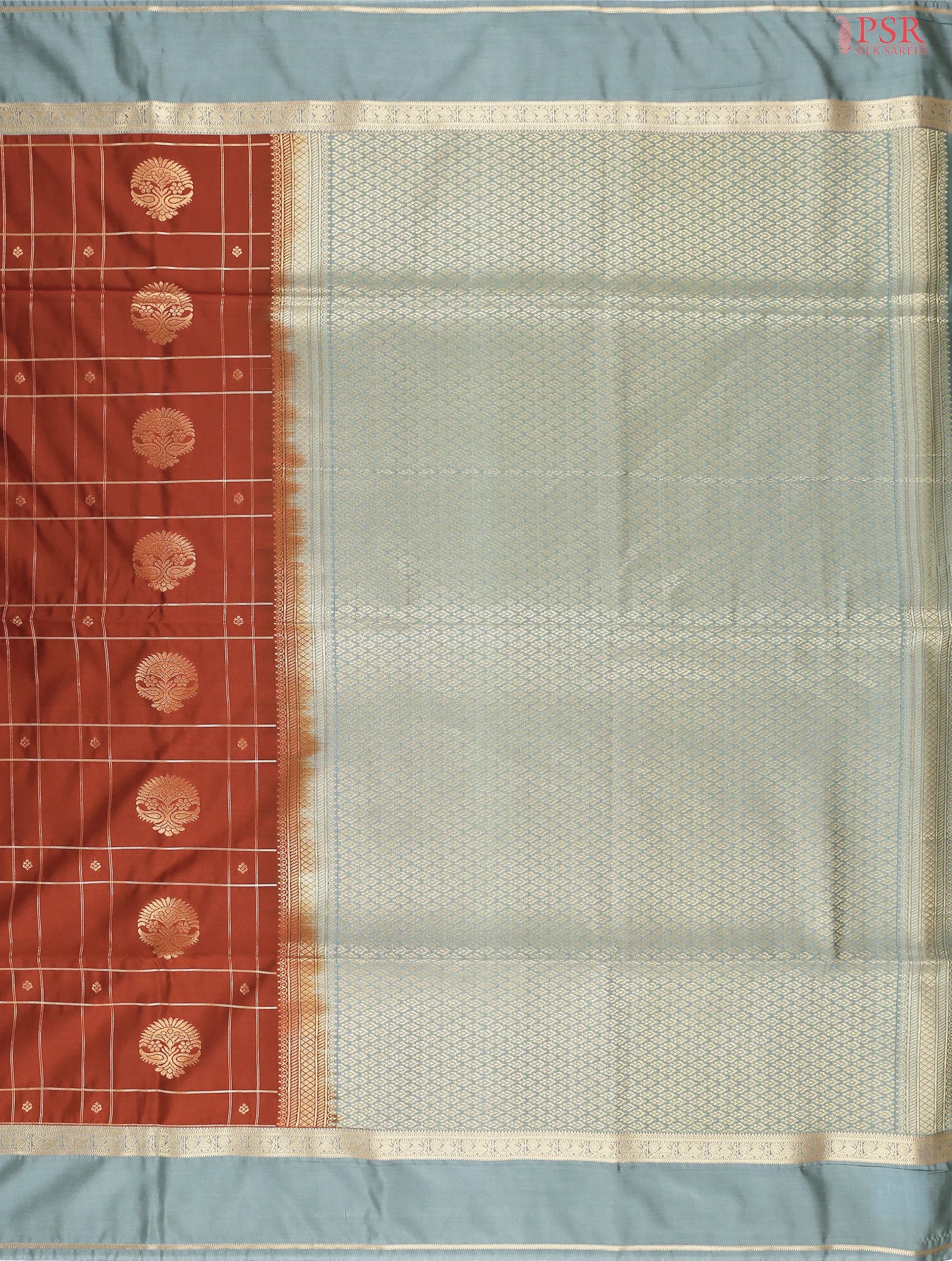 PSR Silk Sarees presents a Copper Soft Art Silk saree with combination of Dark Mint Grey color.