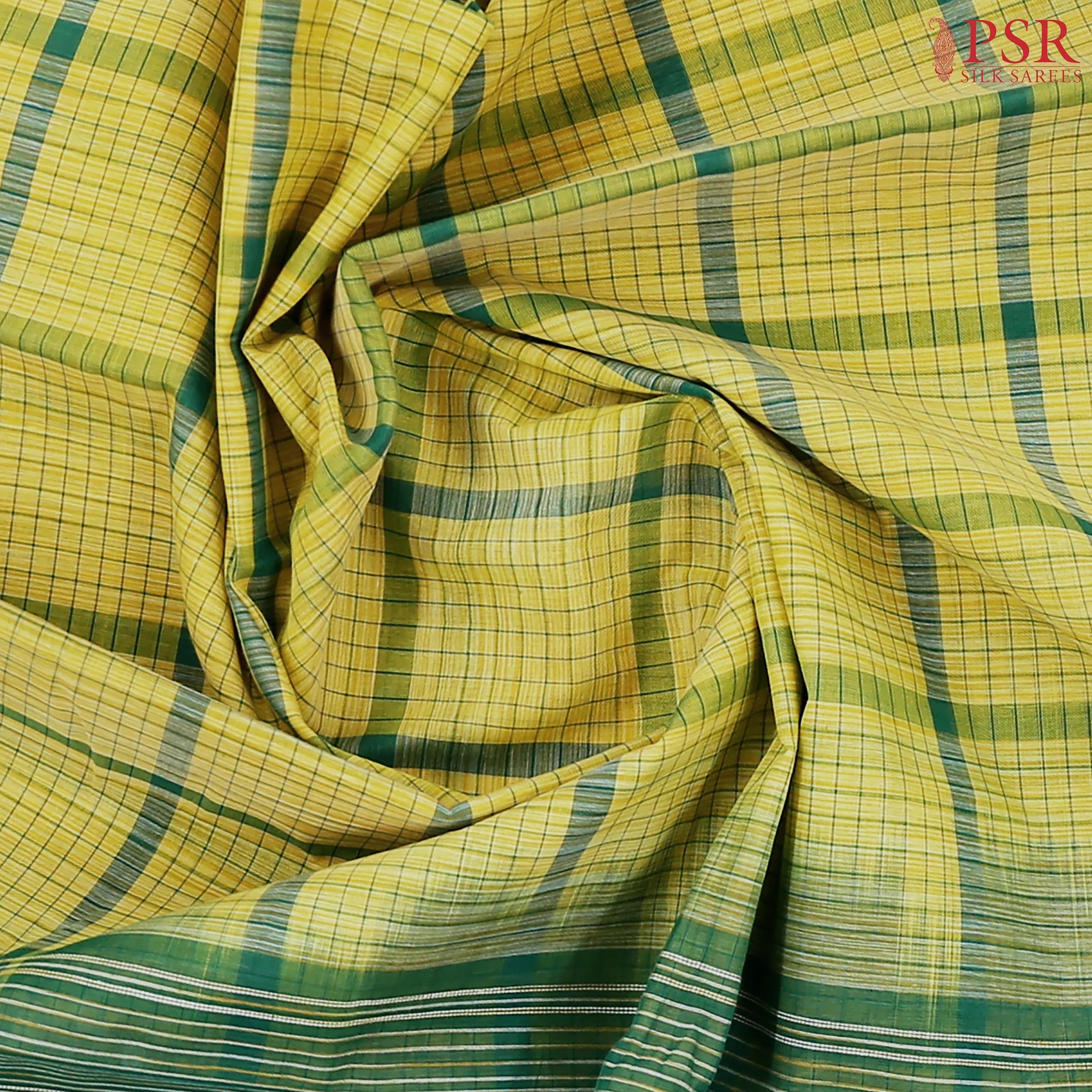 PSR Silk Sarees presents a Corn Yellow Kanchi cotton saree with combination of Emerald Green color.