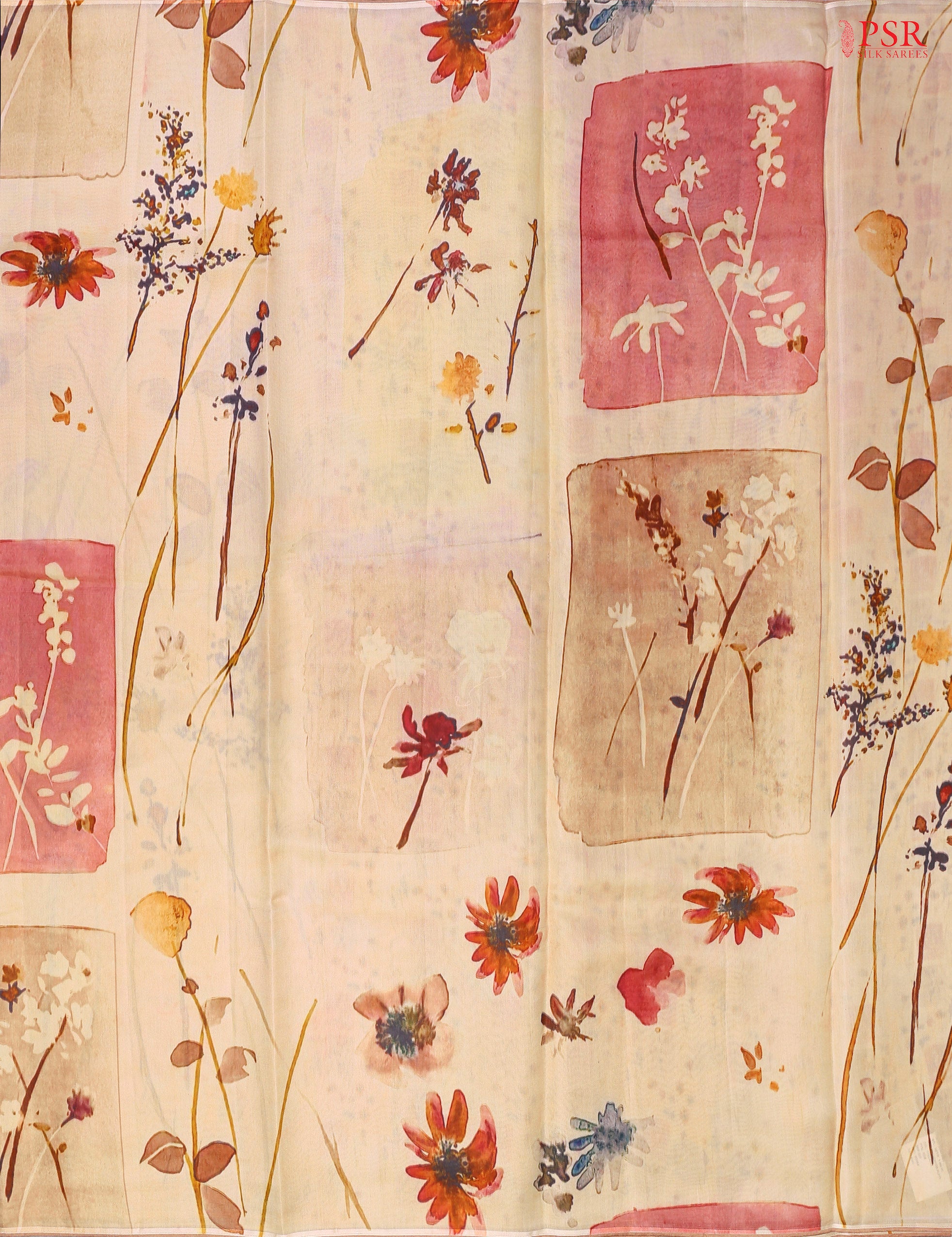 Elevate your elegance with our Cream Beige Munga Silk Saree, adorned with vibrant floral prints that exude charm and sophistication. The saree is complemented by a delicate Peach-hued pallu, adding a soft, graceful touch. Paired with a matching floral-printed blouse, this ensemble is perfect for those who love timeless beauty with a modern twist.