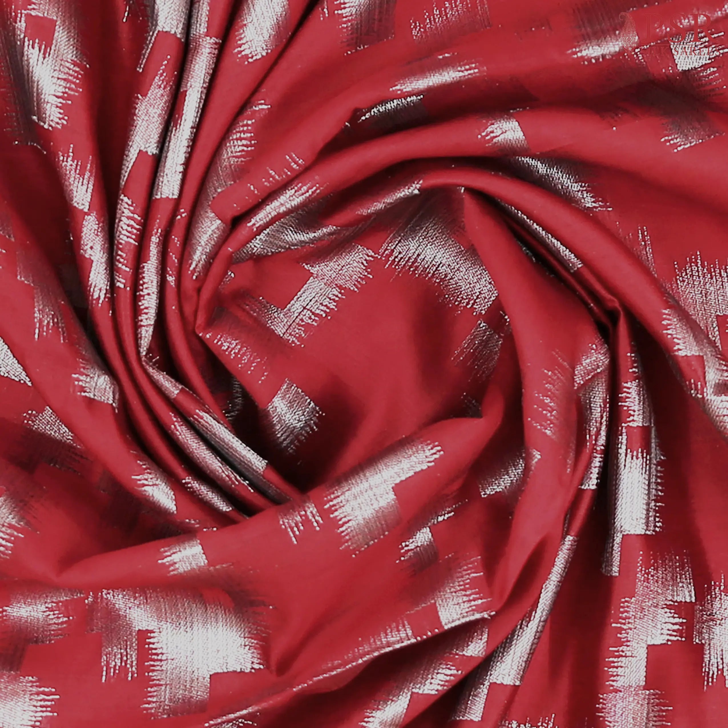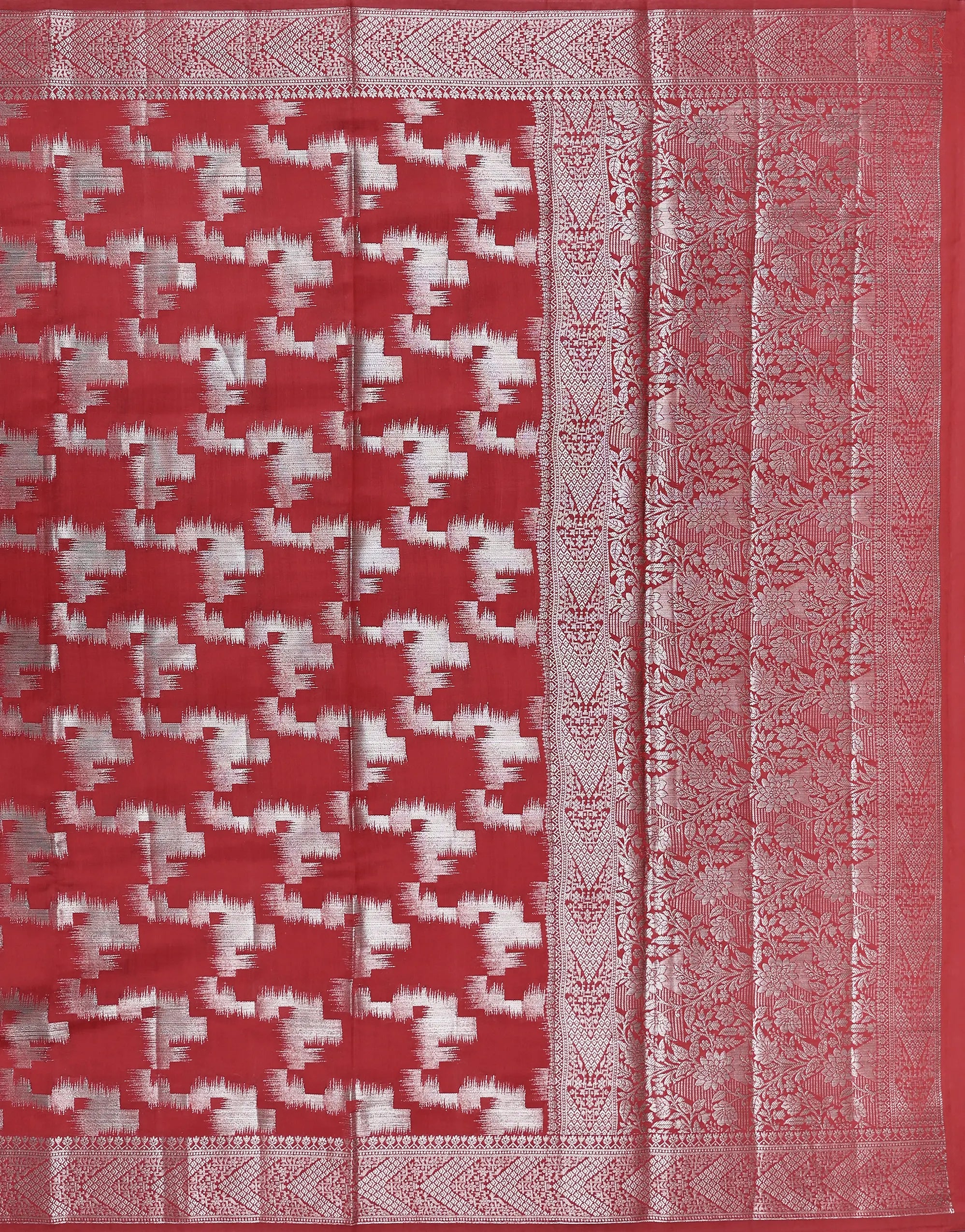 Indulge in subtle sophistication with PSR Silk Sarees’ Crimson Red Chiniya Silk Saree. The saree is beautifully adorned with beautiful designer zari pattern, adding a touch of color and festivity to its refined charm.