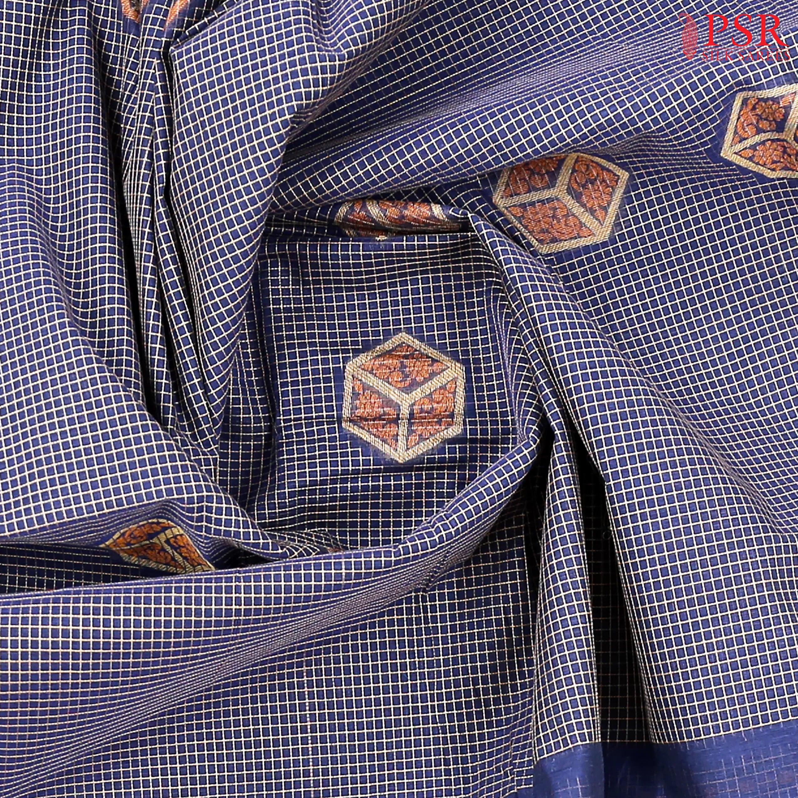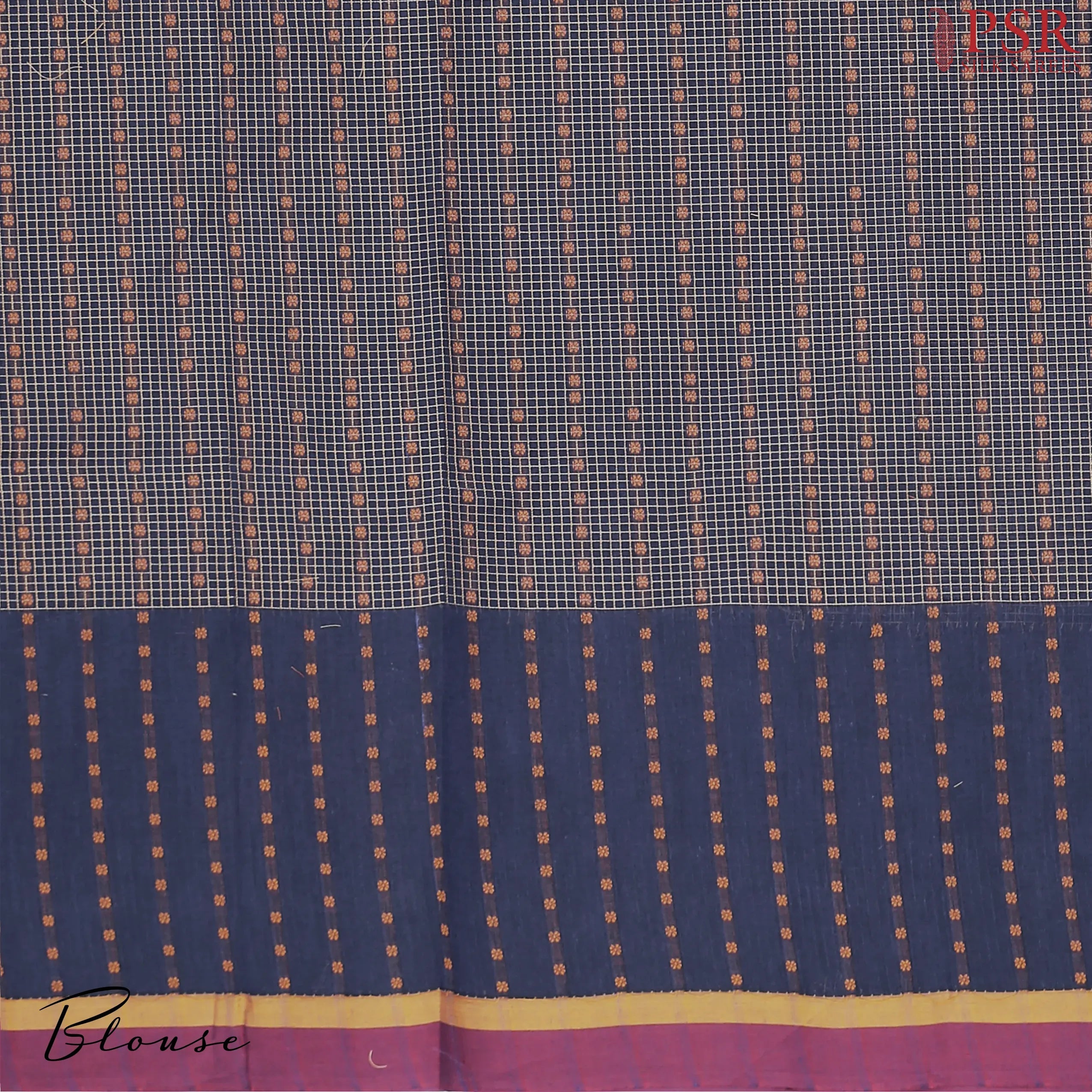 PSR Silks presents a traditional Kovai Cotton saree in a captivating Dark Blue, beautifully weaved with beige & orange thread work.