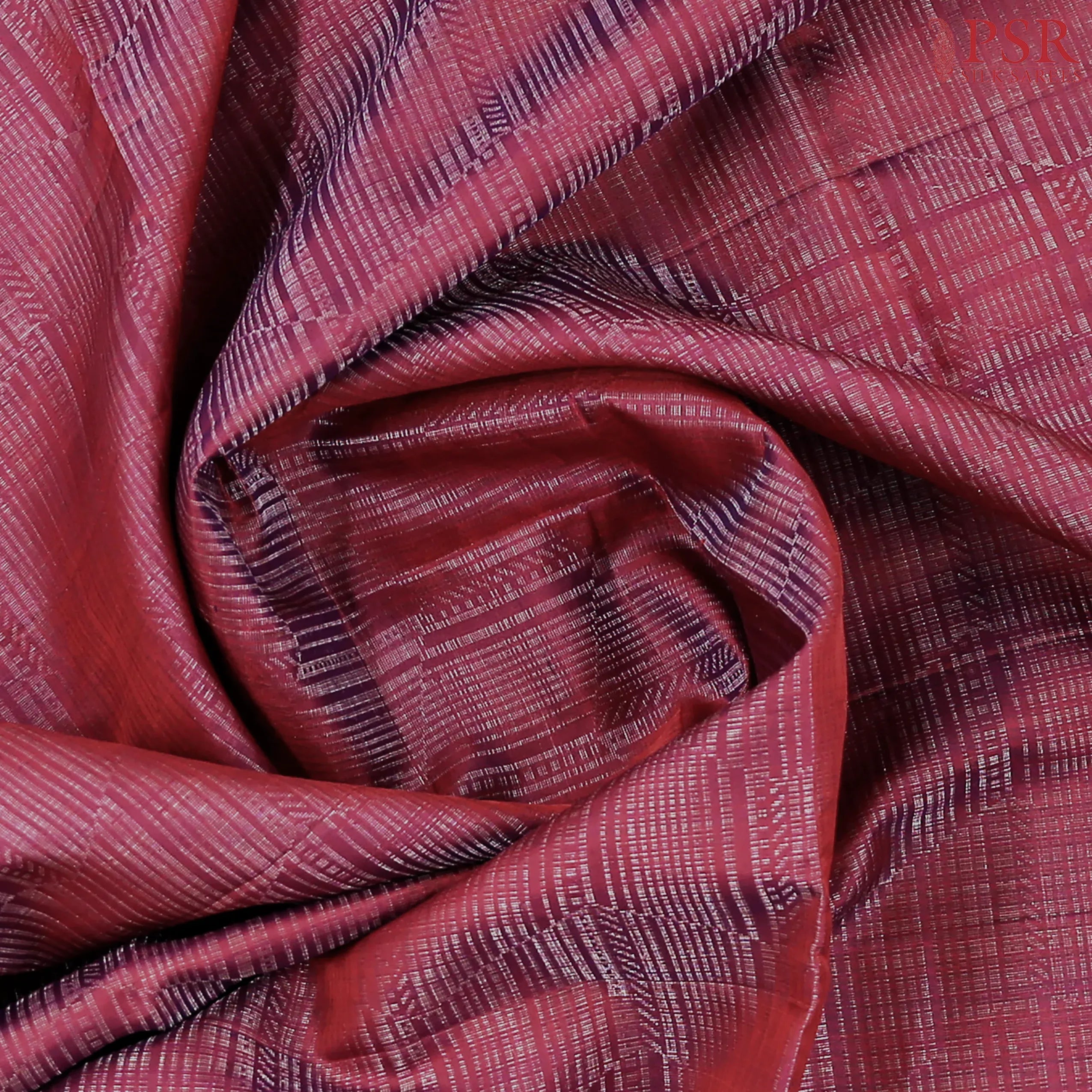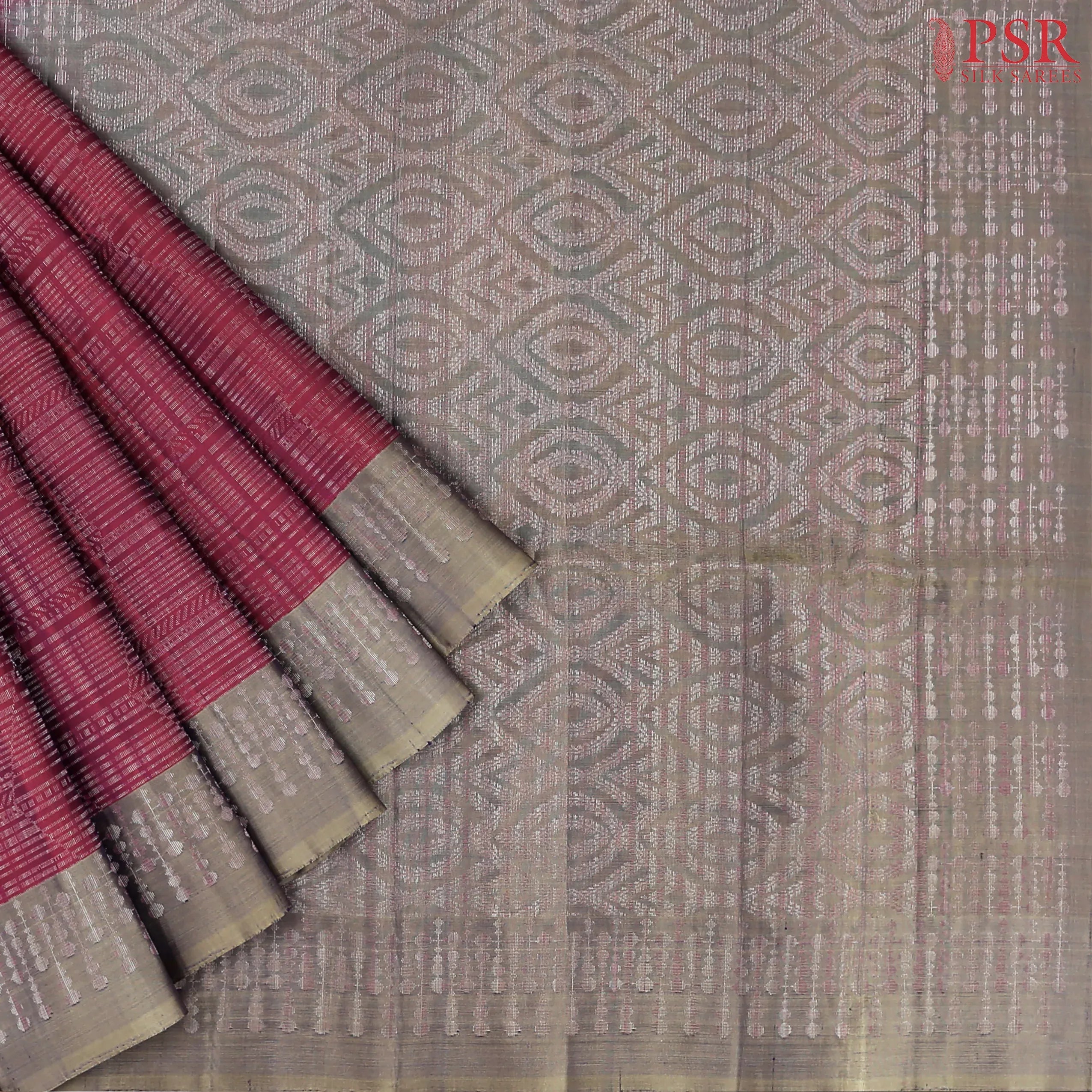 PSR Silk Sarees presents a graceful Dark Fandango Soft Silk Saree paired with a sophisticated Dark Grey combination, radiating warmth and traditional beauty.
