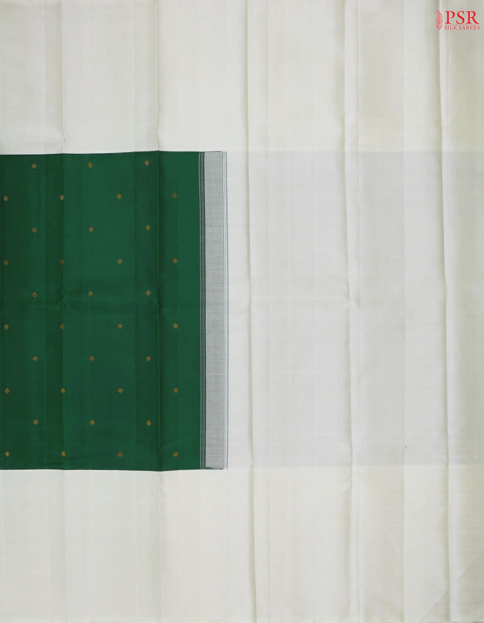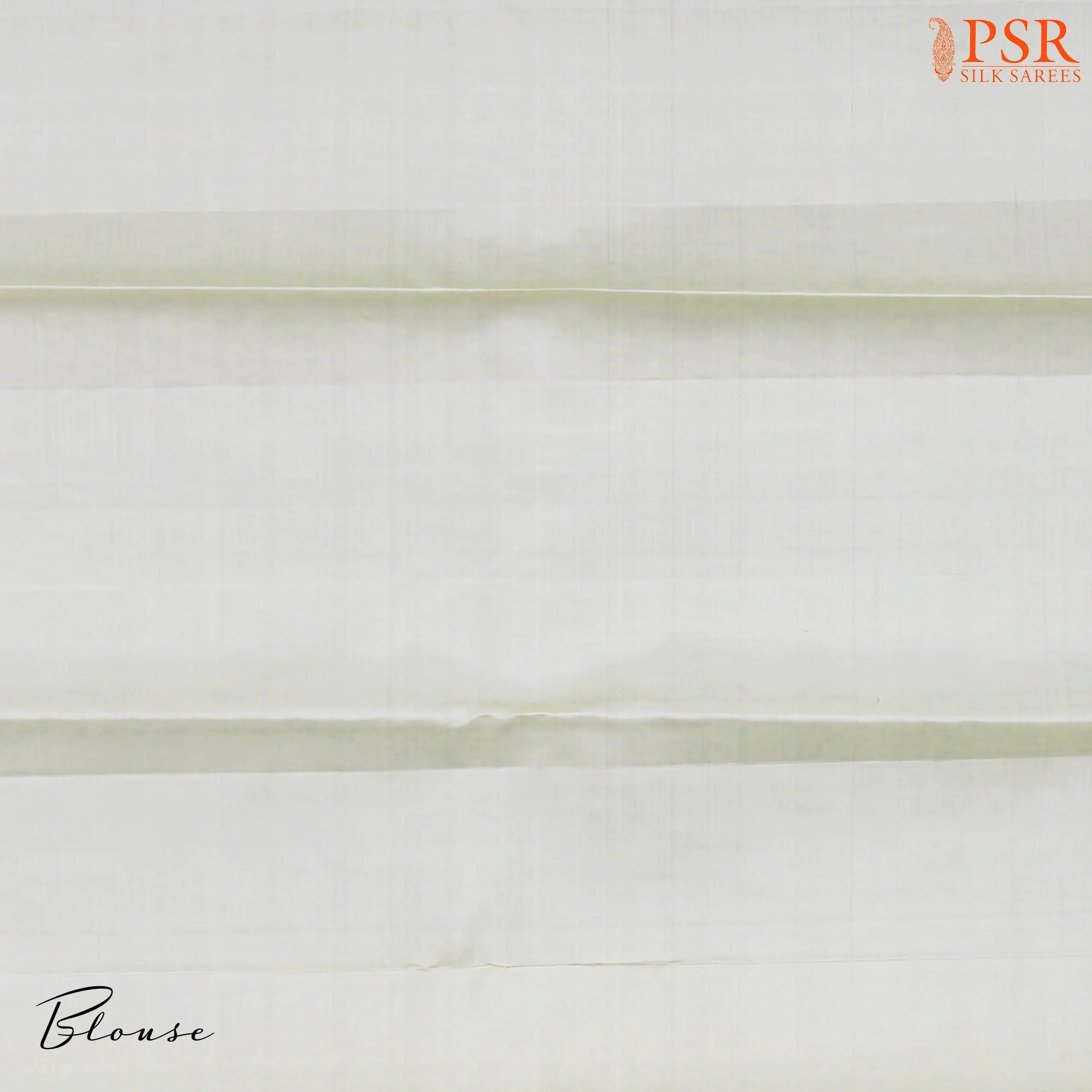 PSR Silk Sarees presents a Dark Green Kanchipuram Silk saree paired with a soothing Pastel Beige combination, offering a blend of elegance and timeless tradition.