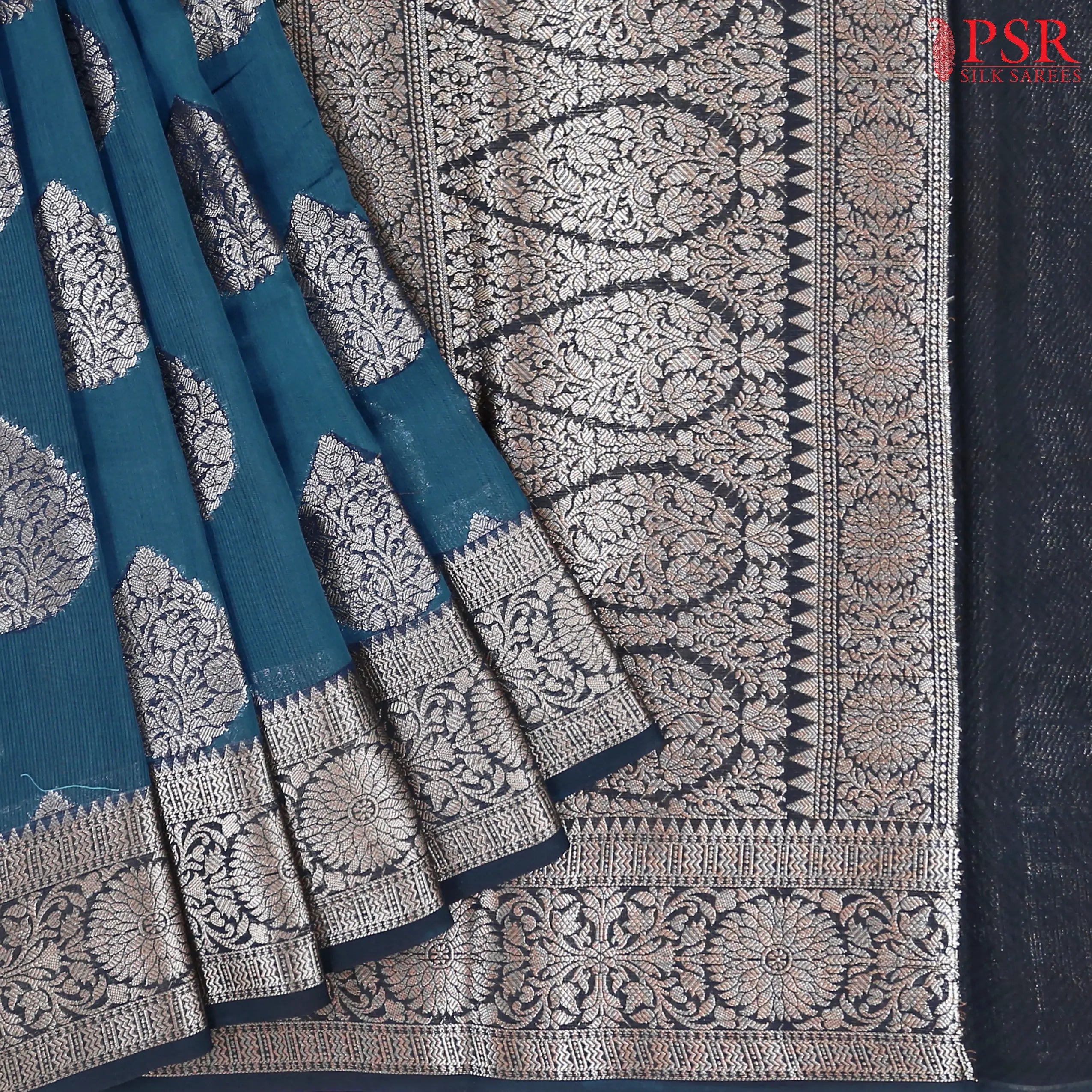 PSR Silk Sarees presents a Dark Peacock Blue colored Chanderi Silk Cotton saree with combination of Midnight Blue color.