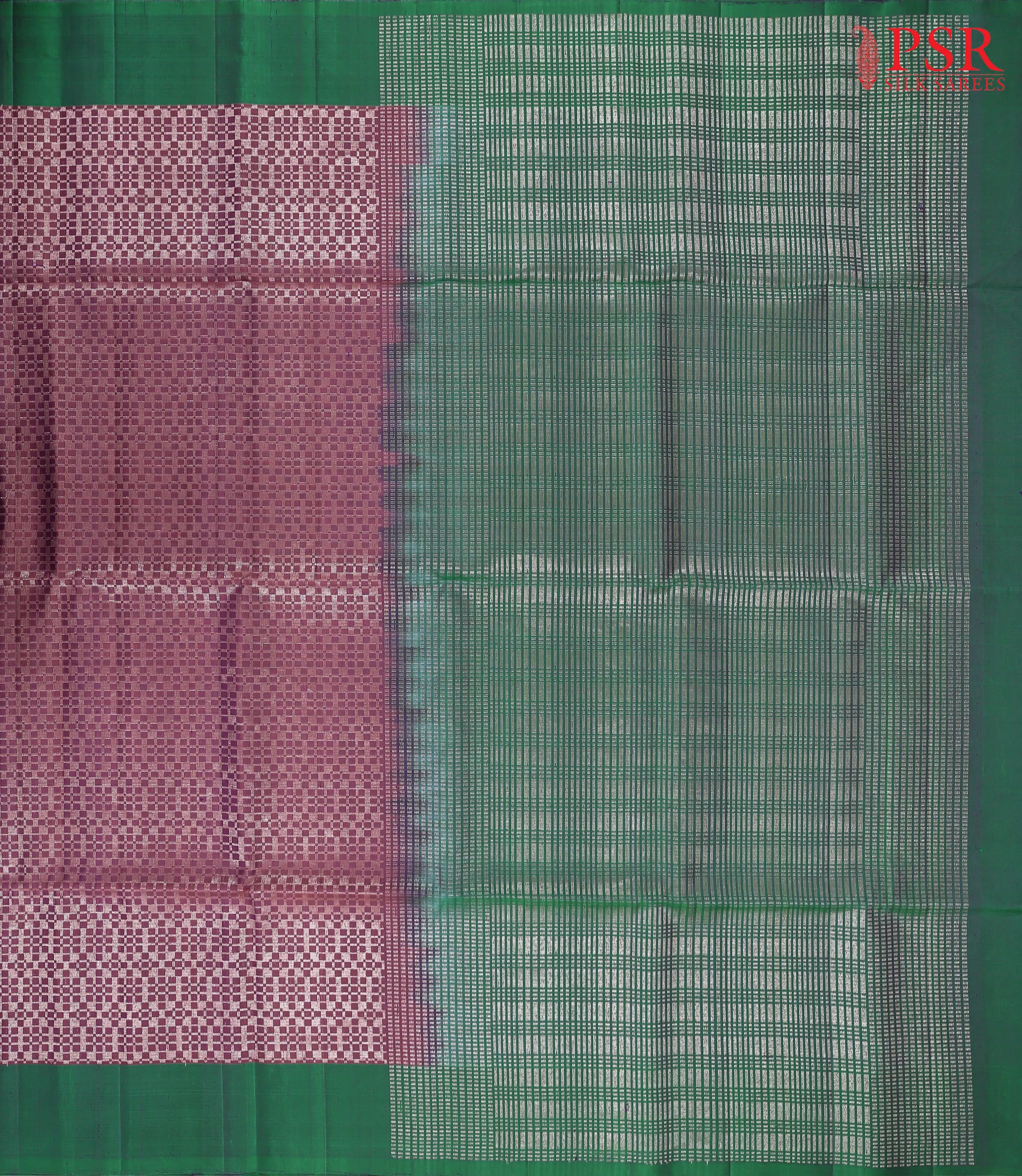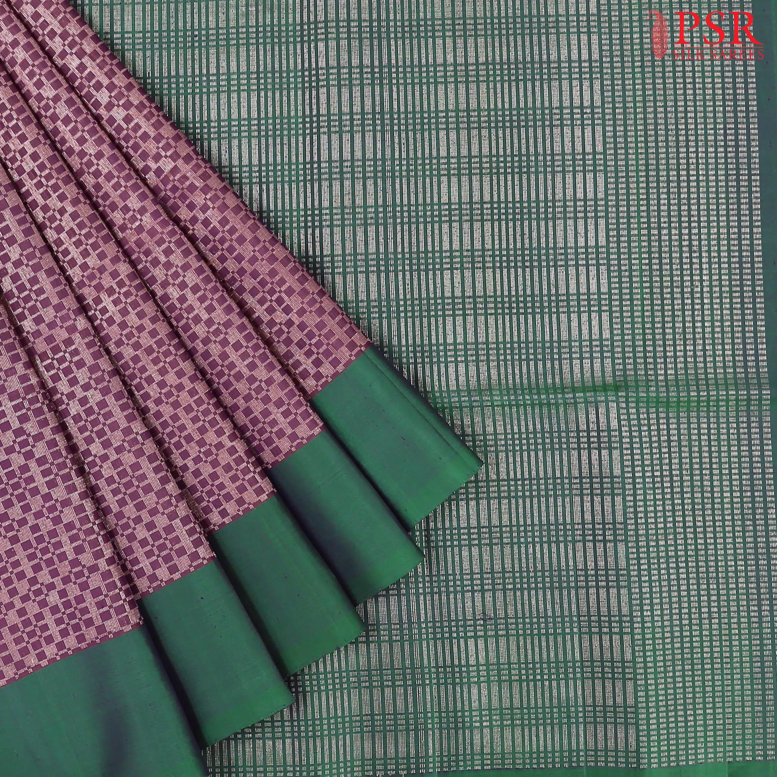 Make a striking statement with this luxurious Dark Plum Purple Soft Silk Saree from PSR Silks, beautifully paired with a vibrant Dark Gren pallu. This elegant plain border saree features an intricate zari checkered jacquard pattern, offering a contemporary twist to traditional design. The contrasting pallu, adorned with rich zari work, adds an extra layer of sophistication. Complete the look with the sleek plain Dark Green blouse, perfect for special occasions and festivities.