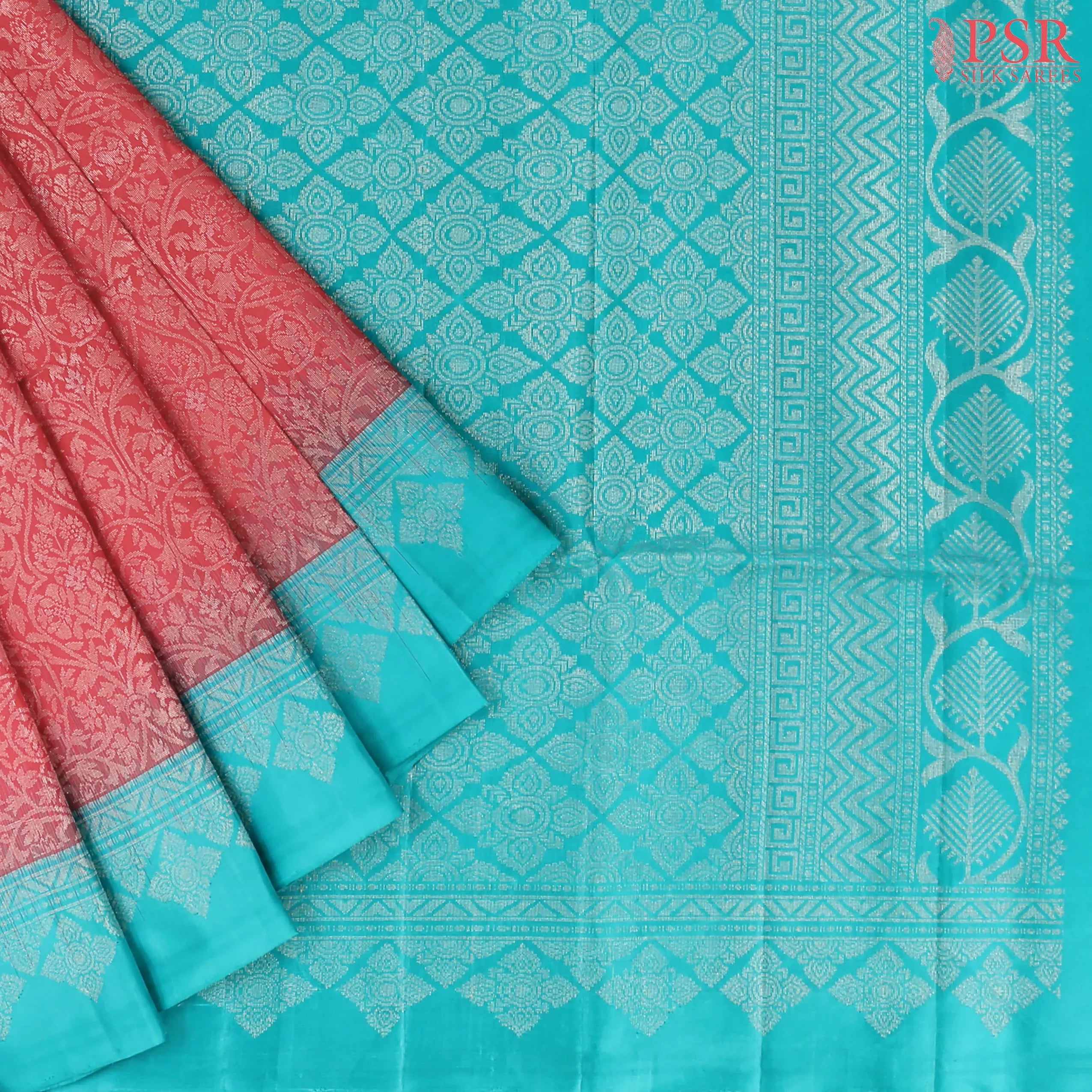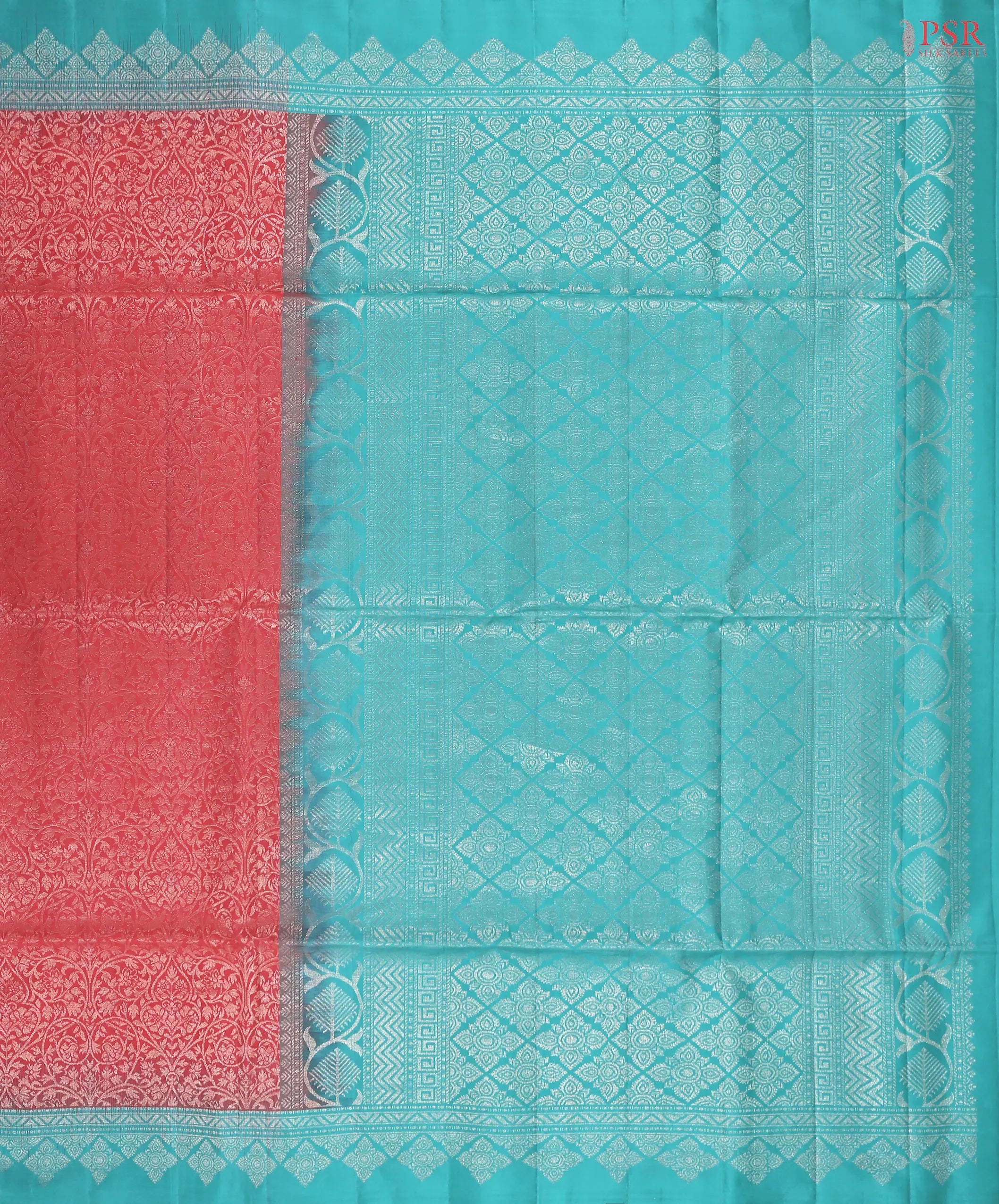 PSR Silk Sarees presents a graceful Desire Red Soft Silk Saree paired with a sophisticated Turquoise Blue combination, radiating warmth and traditional beauty.