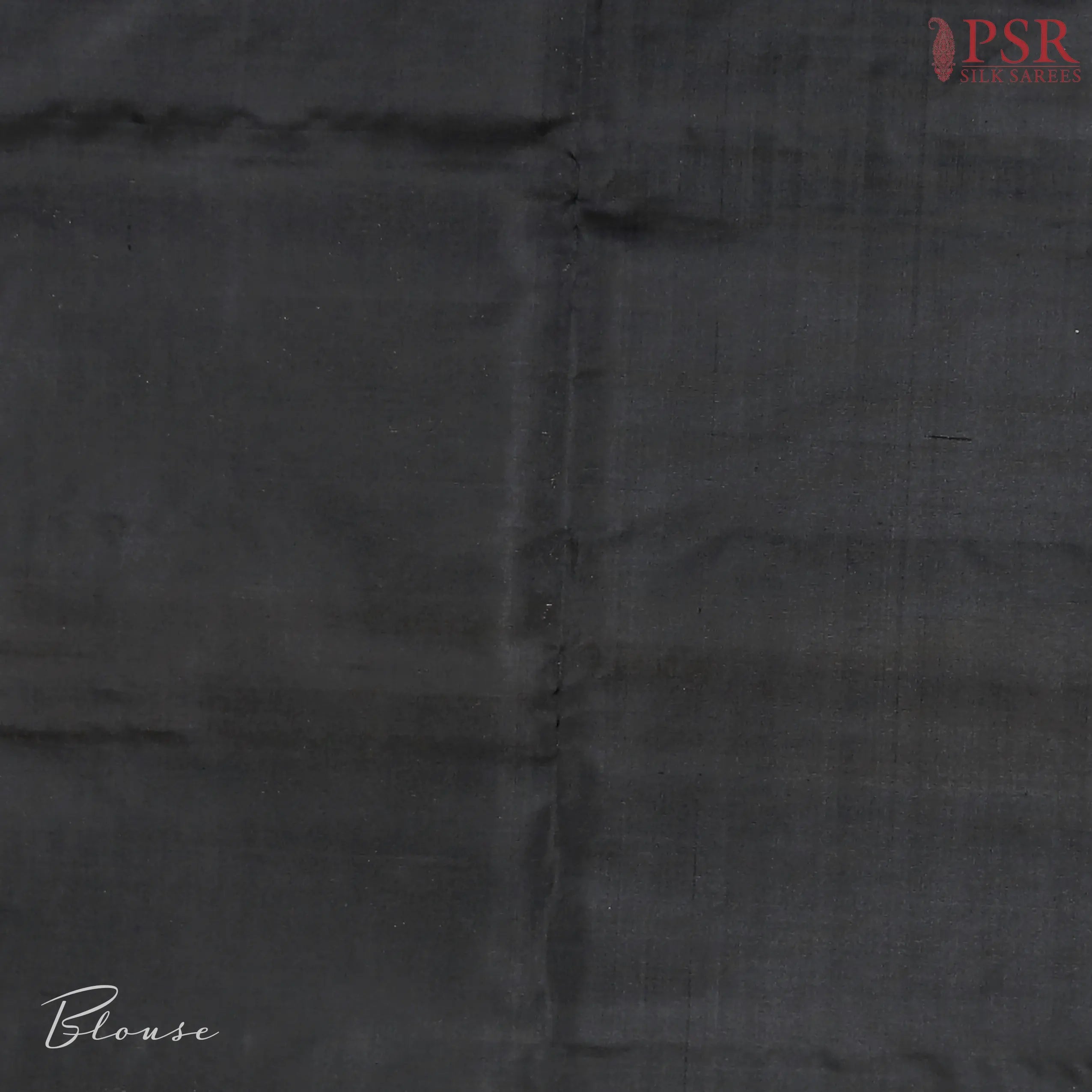 The saree features elegant geometrical jacquard work, giving it a graceful texture. A Black pallu with intricate copper zari work and a grand Black border enriched with floral jacquard weaves elevate its beauty. The look is completed with a plain Black blouse, making it an exquisite choice for festive and traditional occasions.