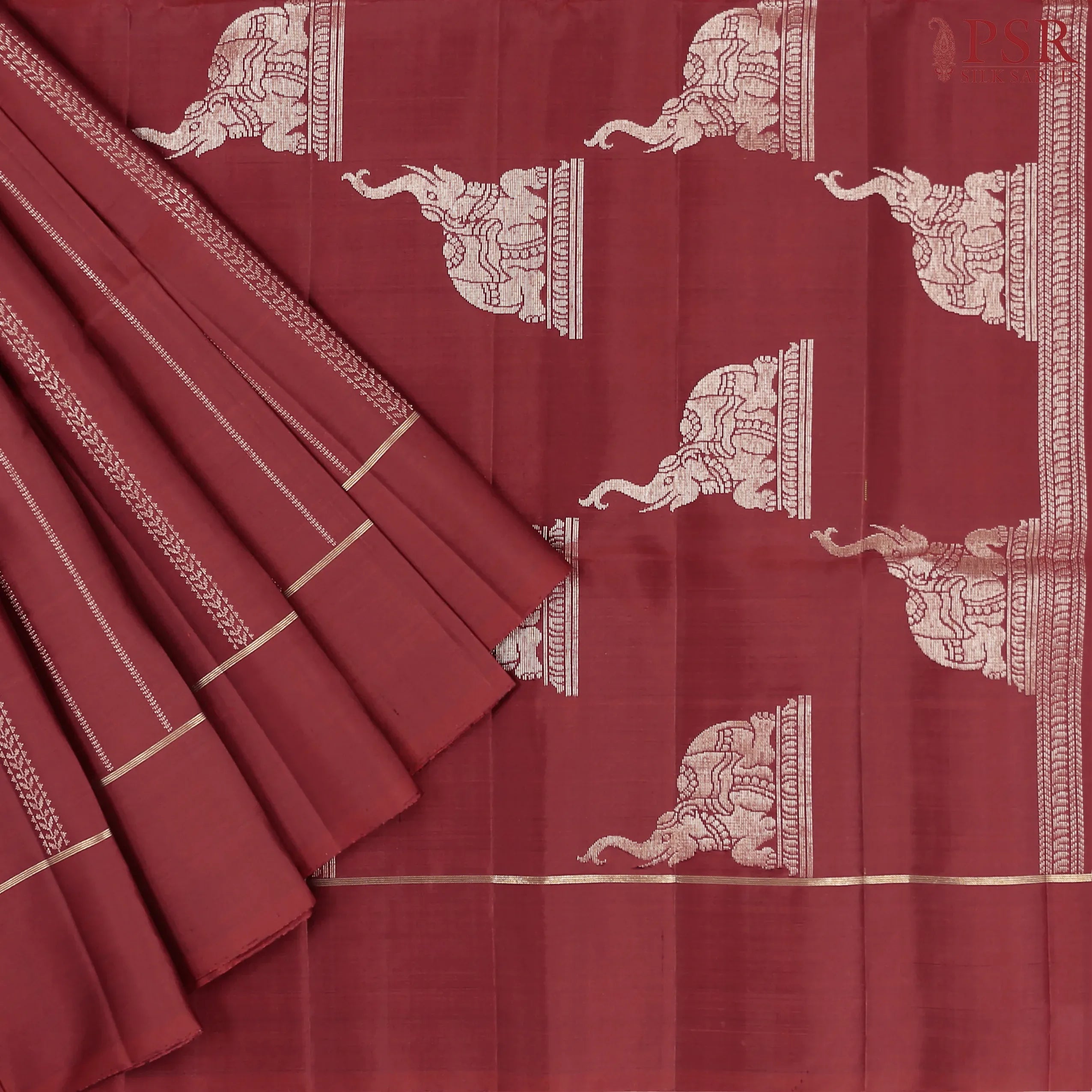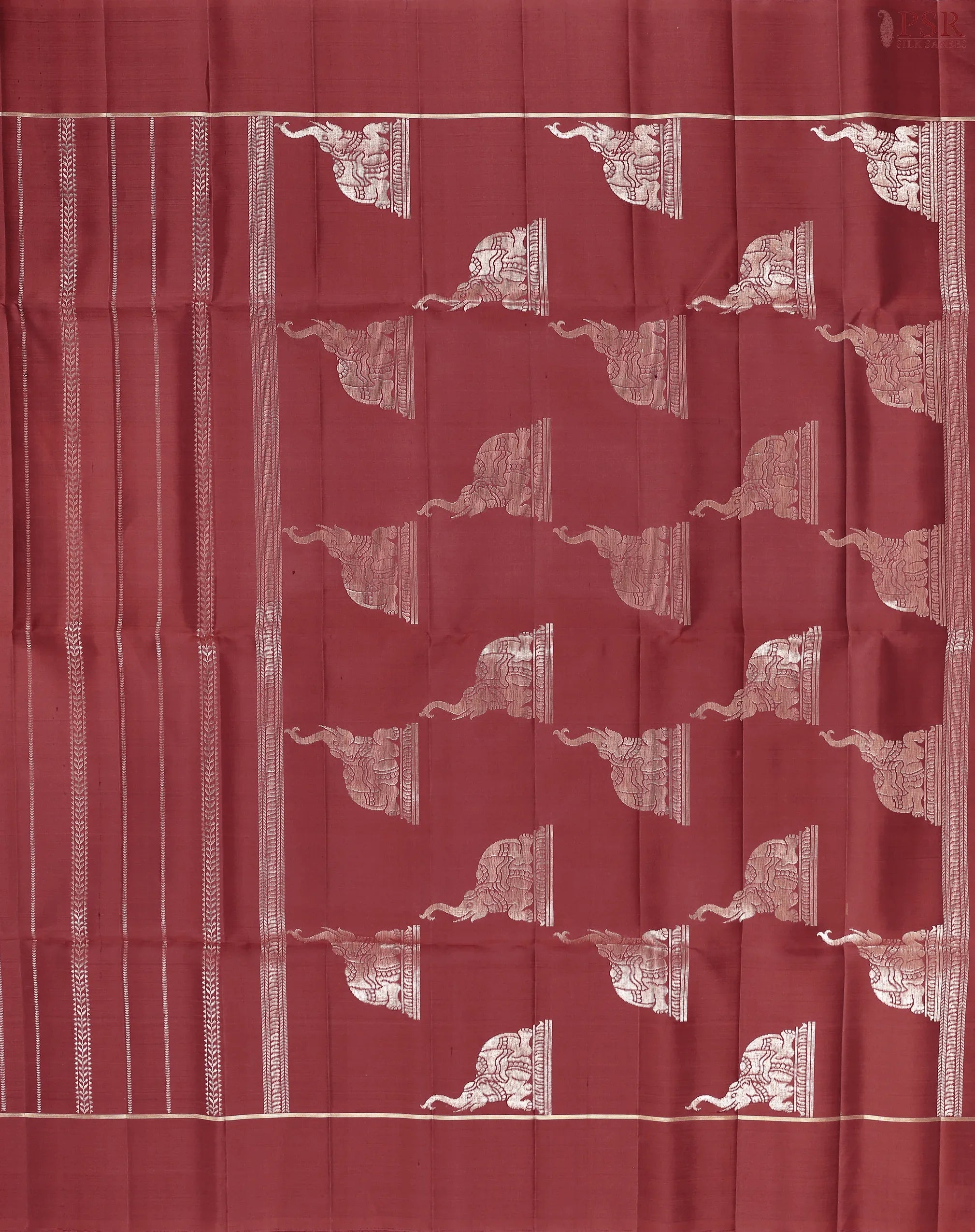This stunning saree features uniquely designed zari jacquard stripes, adding a touch of shimmer and refined artistry. The designer zari work pallu with elephant motifs, complemented by a plain border, enhances its traditional appeal and overall richness.