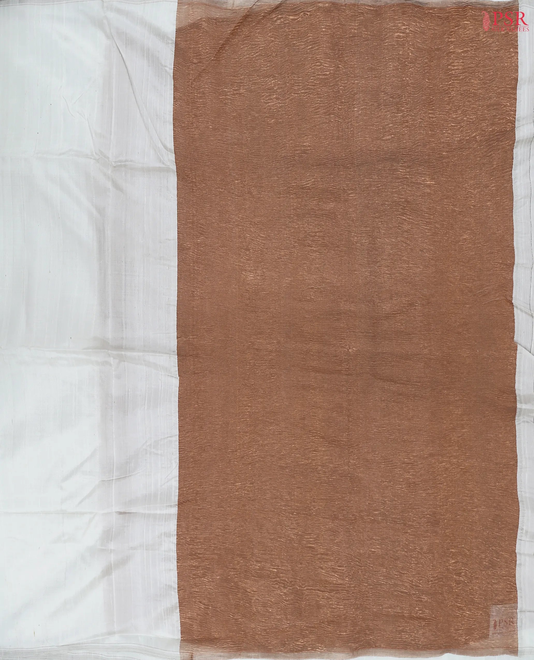 This elegant borderless saree features a plain Floral White jute soft silk body, beautifully paired with a crushed tissue pallu that adds texture and modern charm. The saree comes with a matching crushed tissue blouse, completing the fusion look.