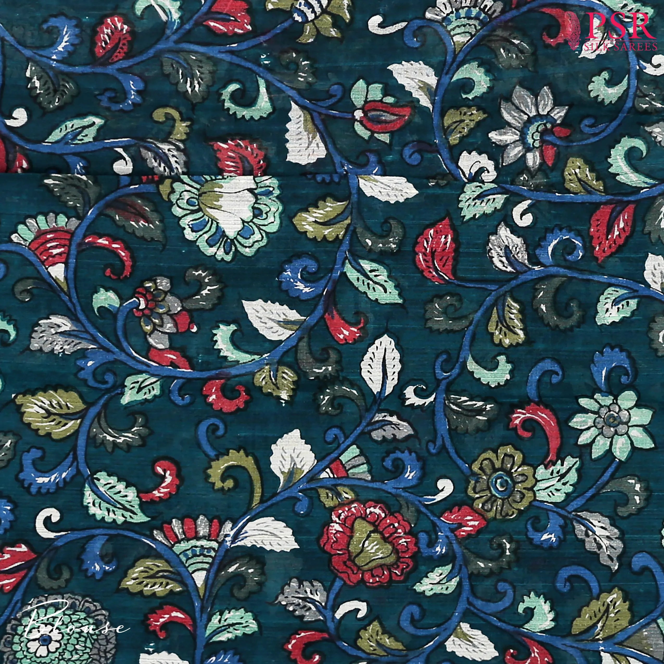 This elegantĀ saree features a plain Floral White jute soft silk body, beautifully paired with a zari stripedĀ pallu that adds texture and modern charm. The saree comes with a matching Kalamkari blouse, completing the fusion look.